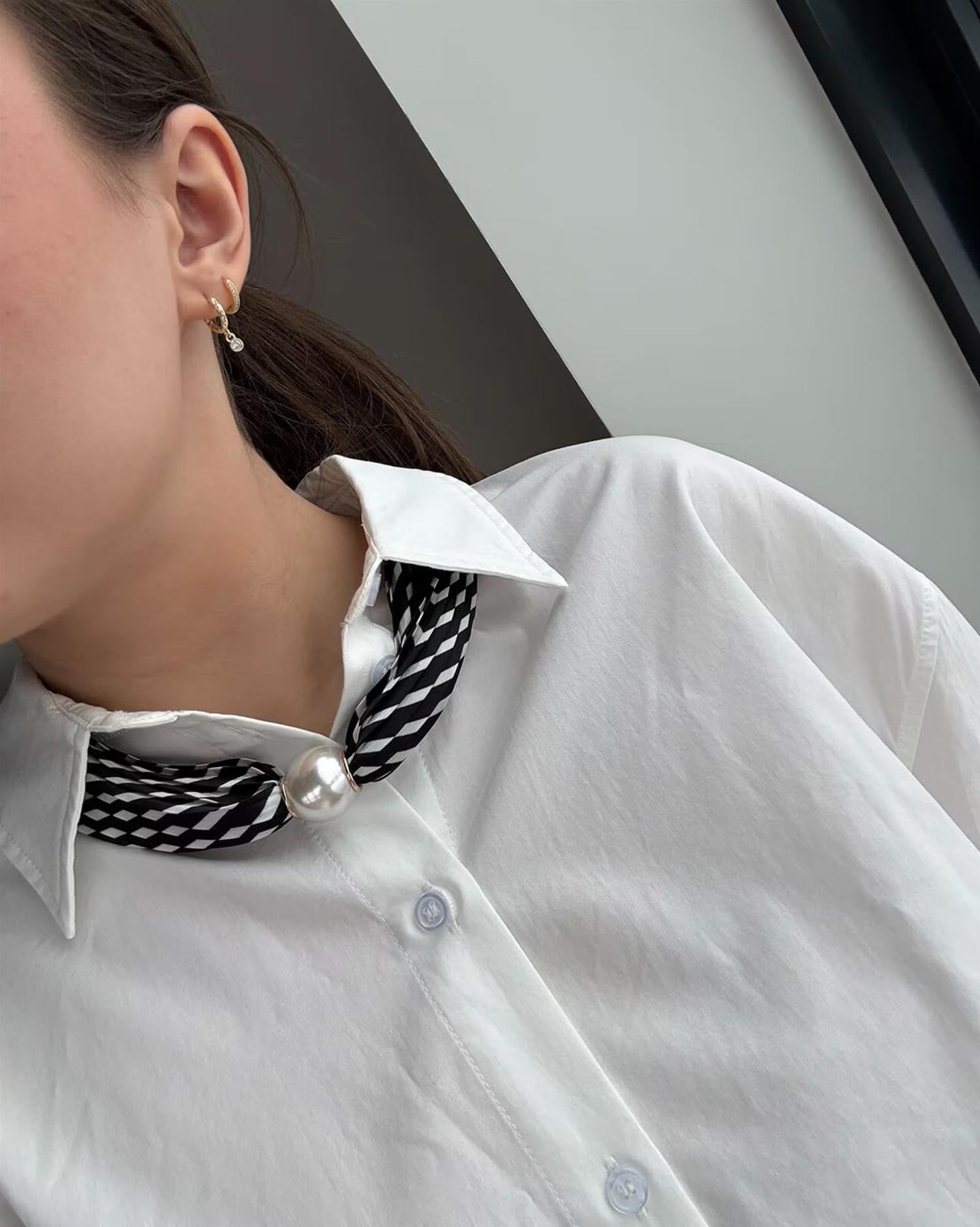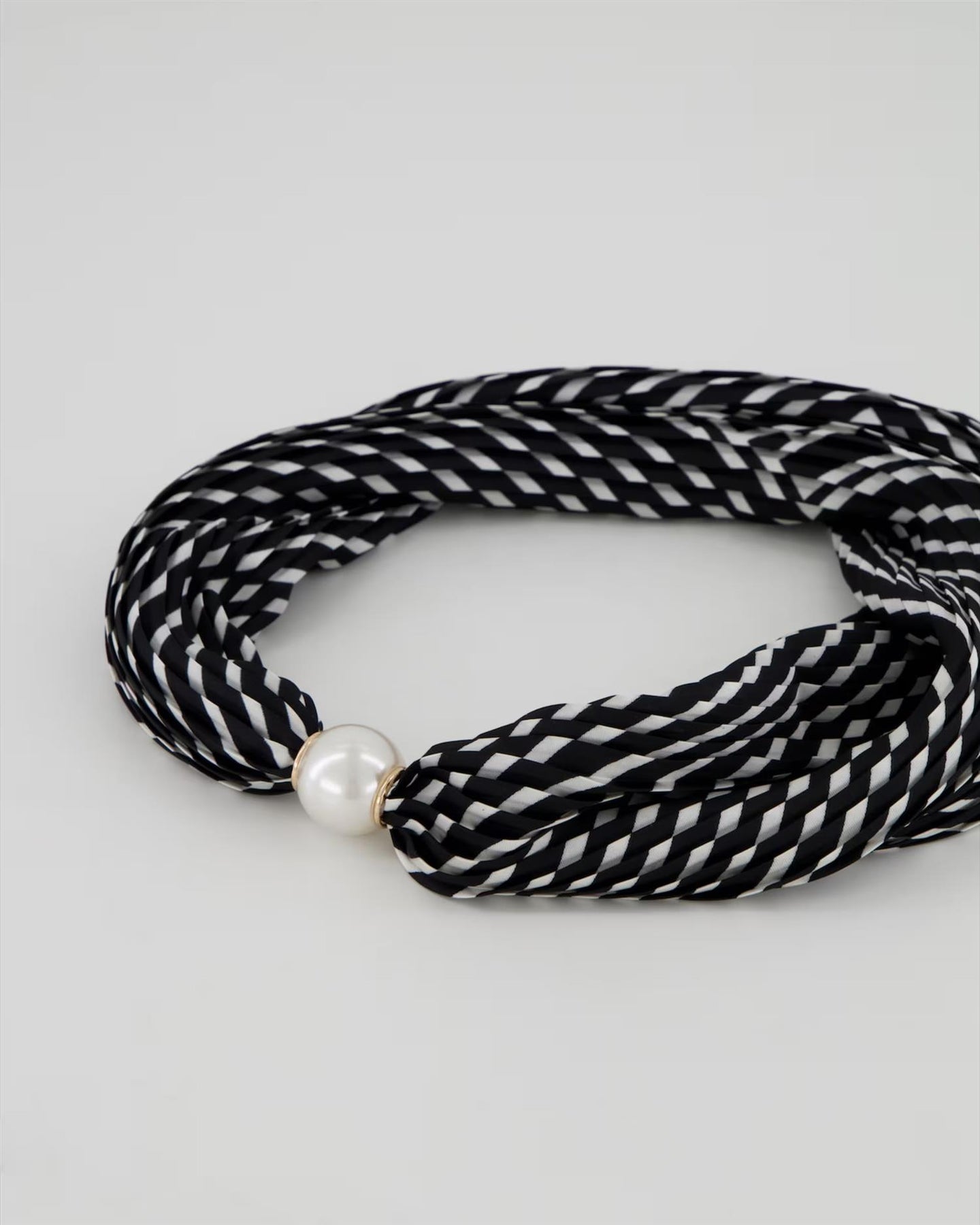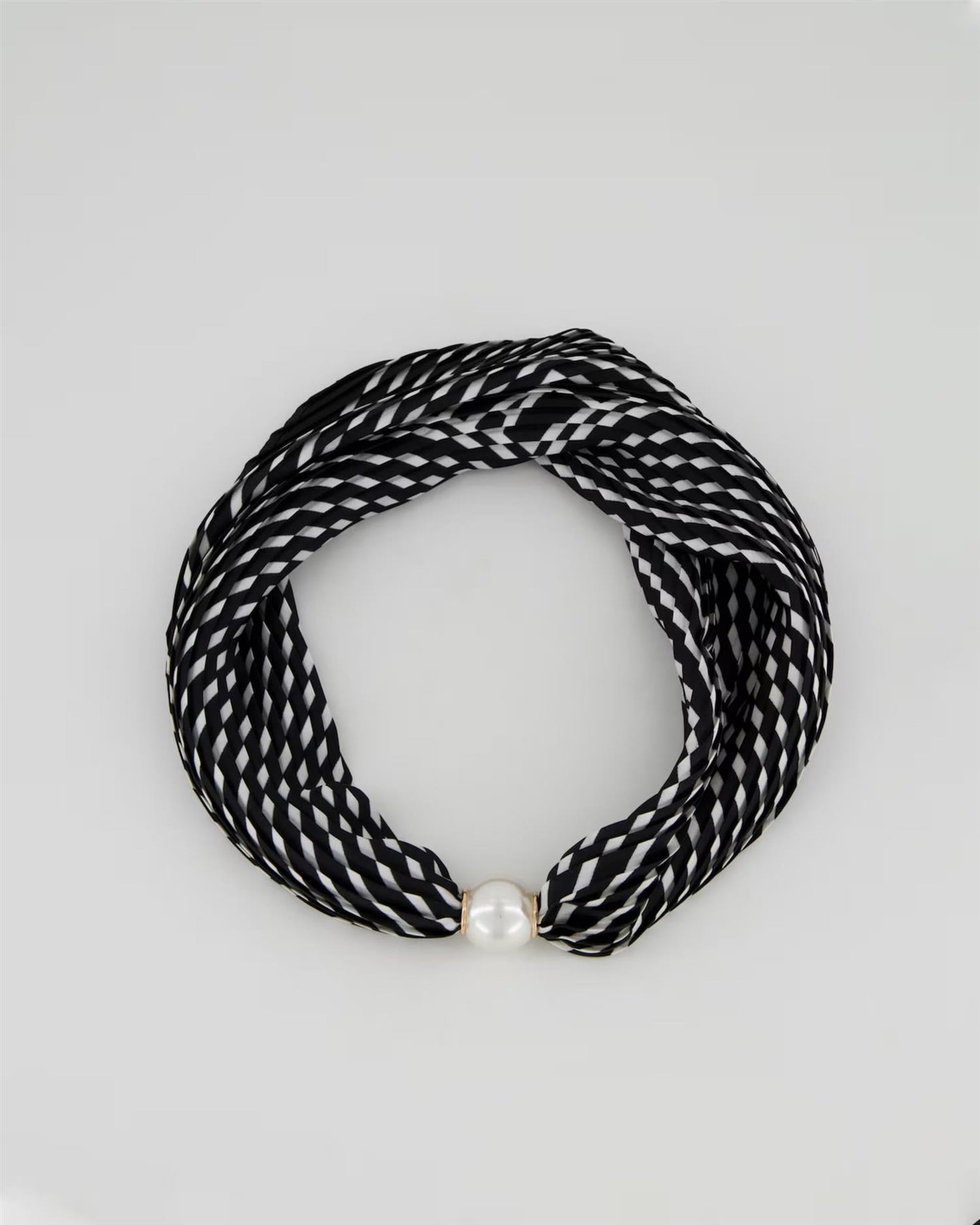 Dette satengskjerfet har et elegant uttrykk med plissert struktur som gir dybde og et mykt spill. Den imiterte perlen foran fungerer som et dekorativt fokuspunkt og skjuler en magnetisk lukking som gjør skjerfet enkelt å åpne og lukke.