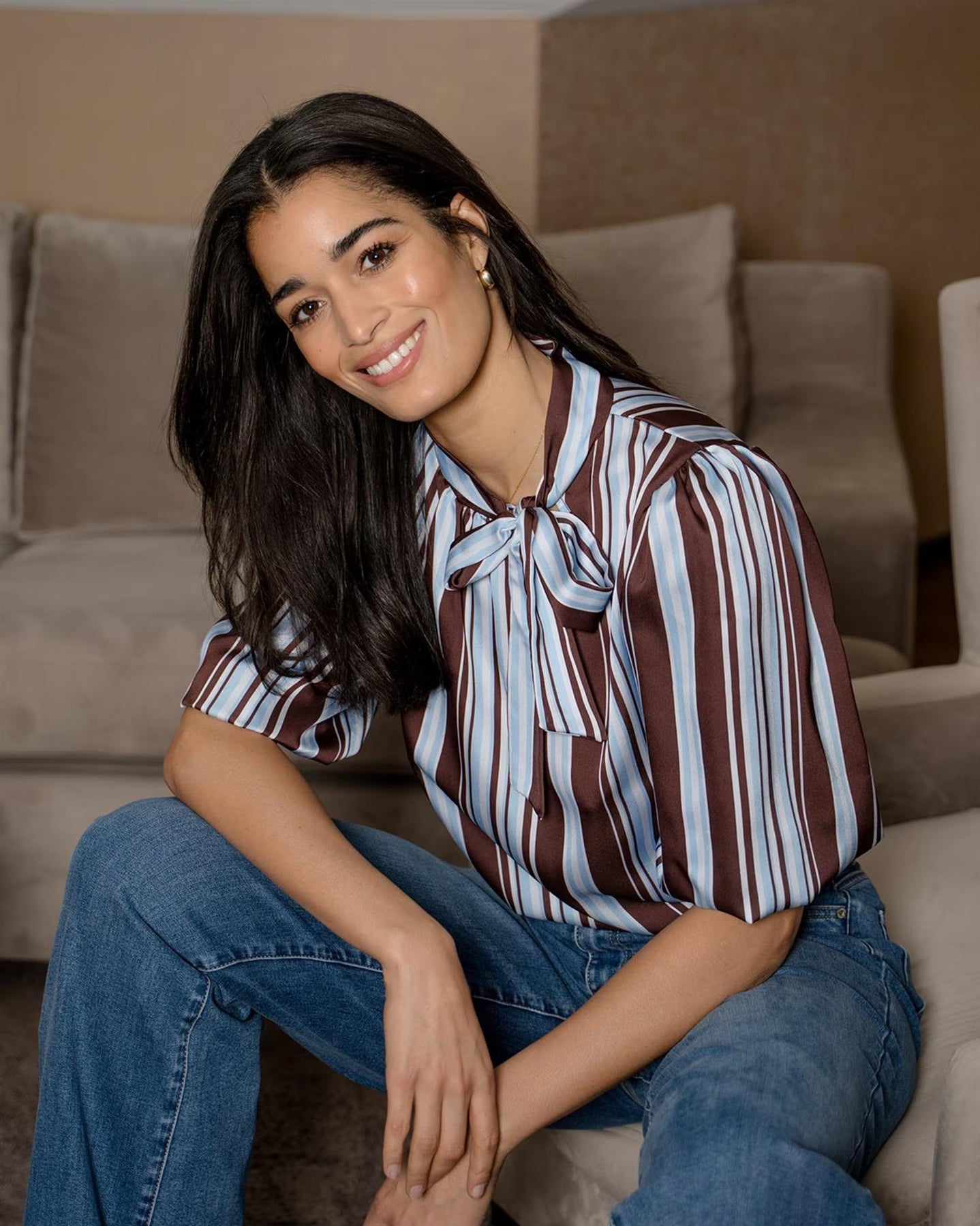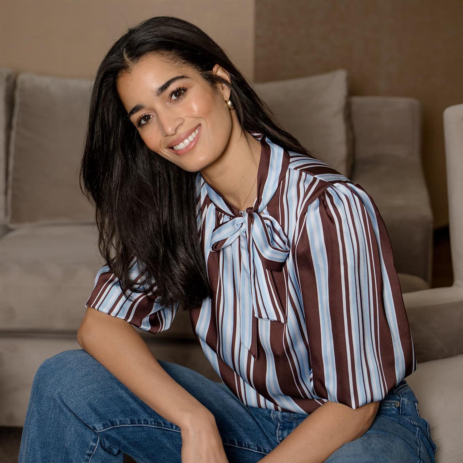 En feminin og elegant stripete satengtopp i brune og lyseblå toner. Den glatte satengen gir en delikat glans som gjør toppen perfekt både til jobb, hverdag og fest.
