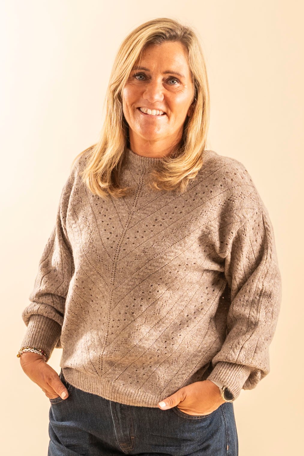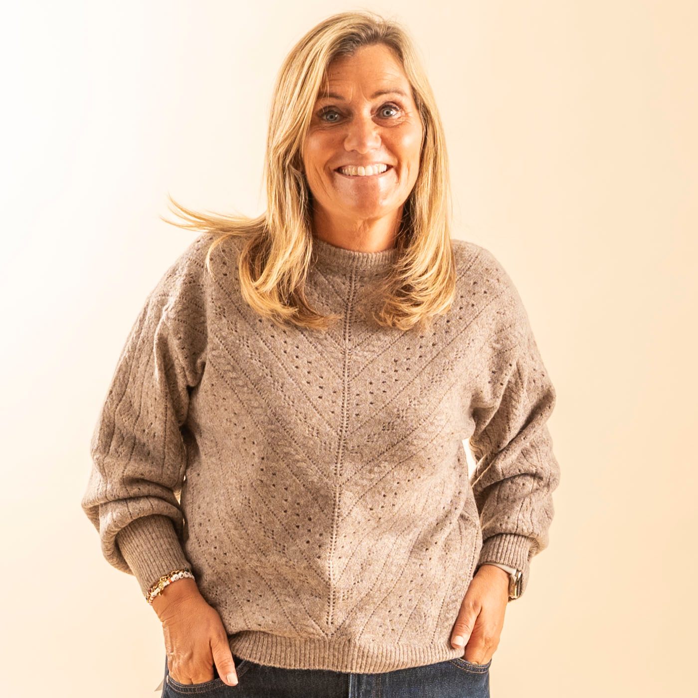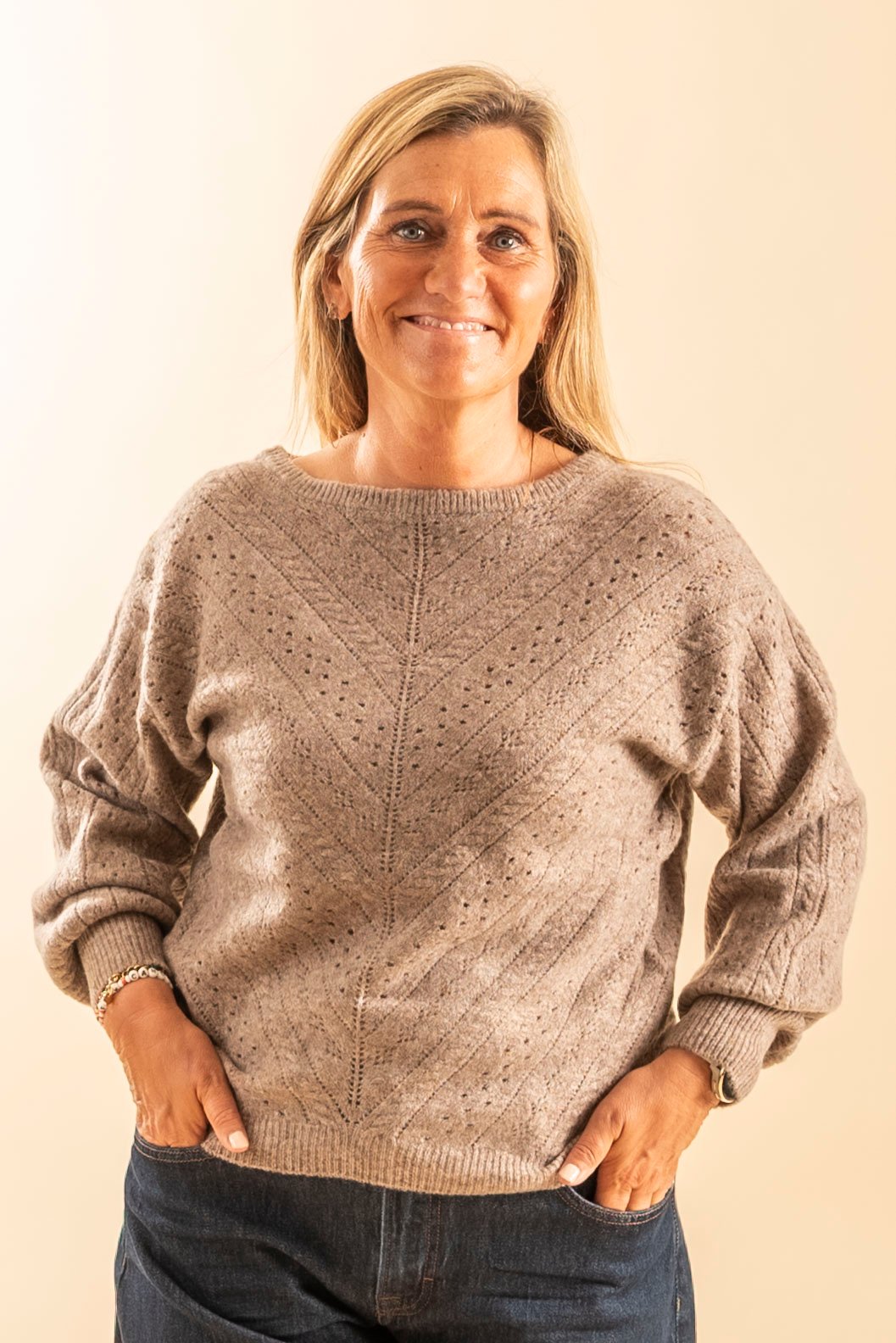 Stilig mønsterstrikket genser med båthals og lekkert mønster.