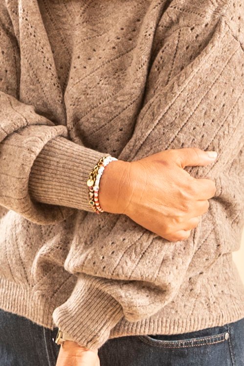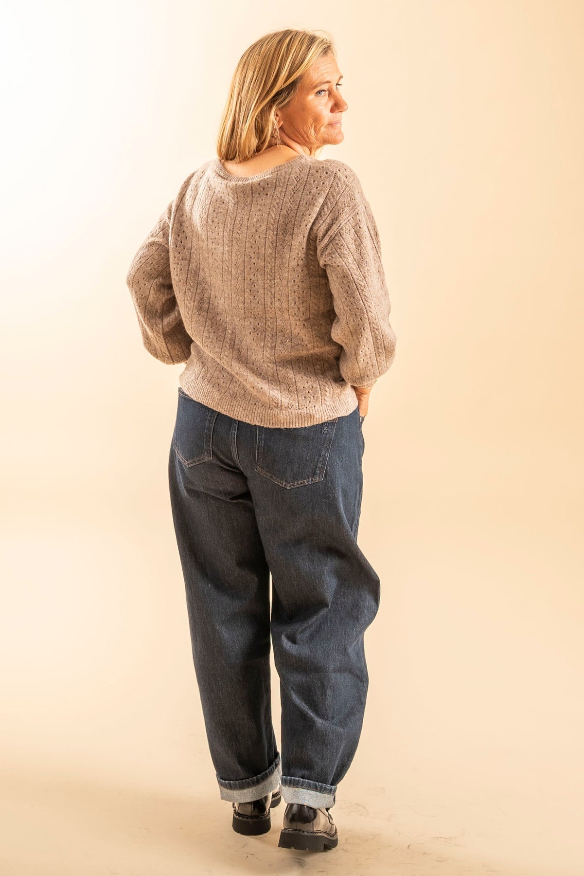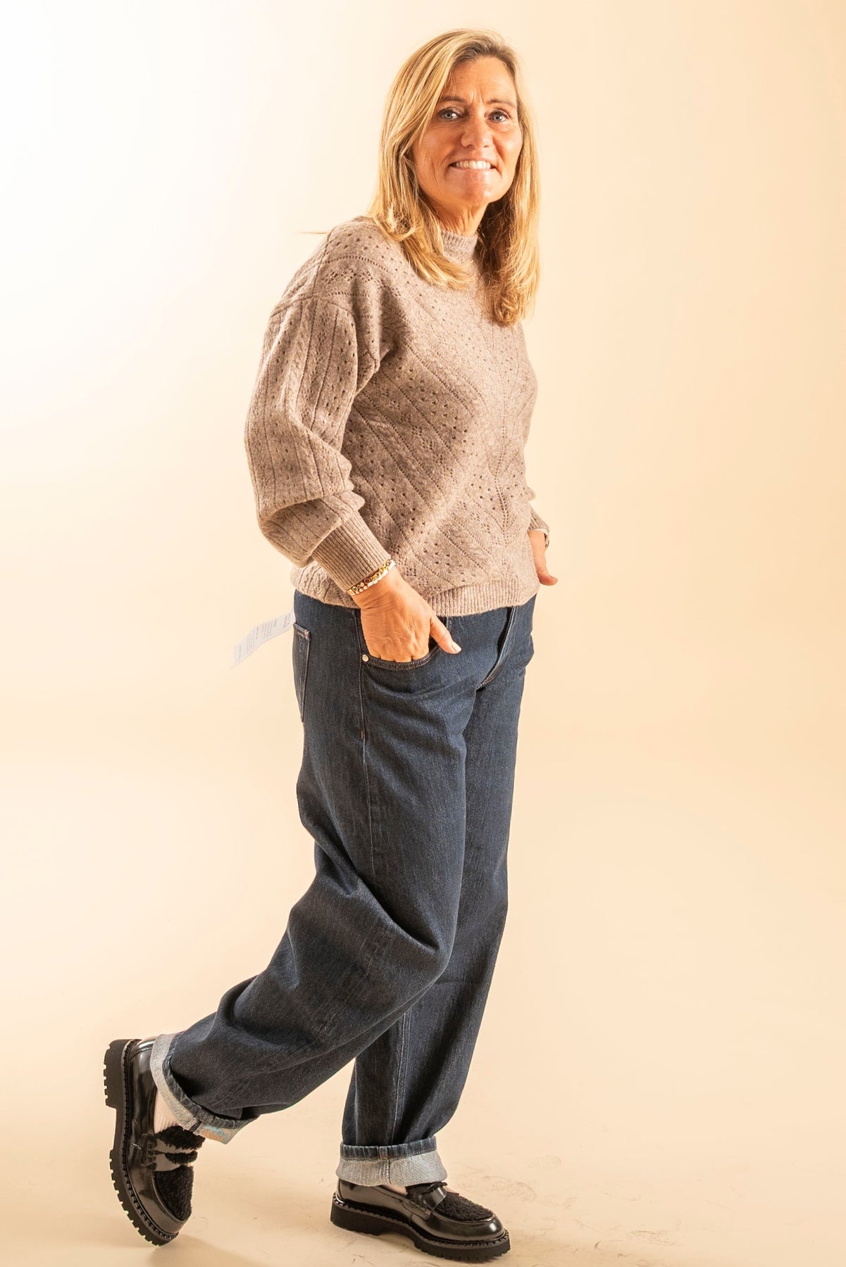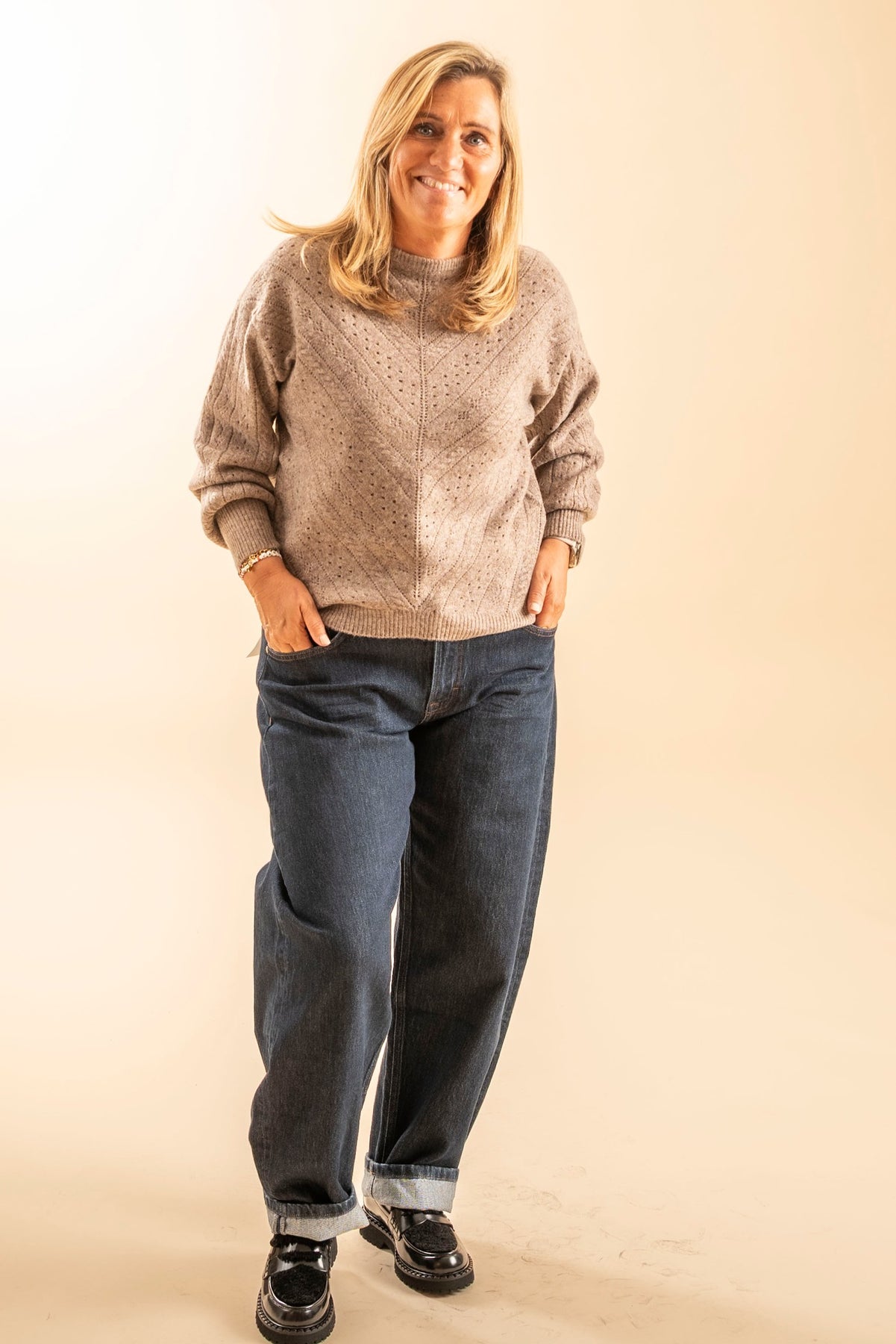 Stilig mønsterstrikket genser med båthals og lekkert mønster.