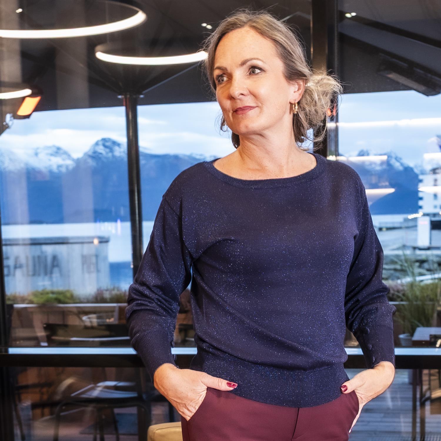 Skimrende genser i strikket materiale med løs passform og klassisk båthals. Lange ermer, ribbestrikkede mansjetter med trekte knapper og glitrende detaljer gir denne et ekslusivt uttrykk, men sjekk prisen!