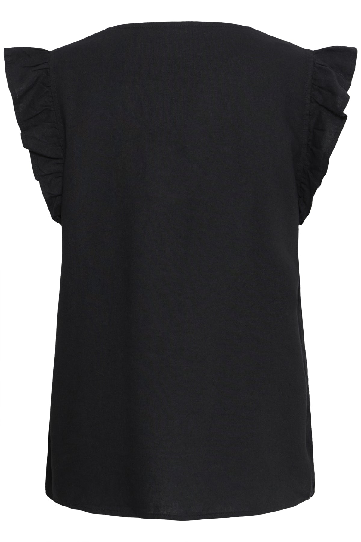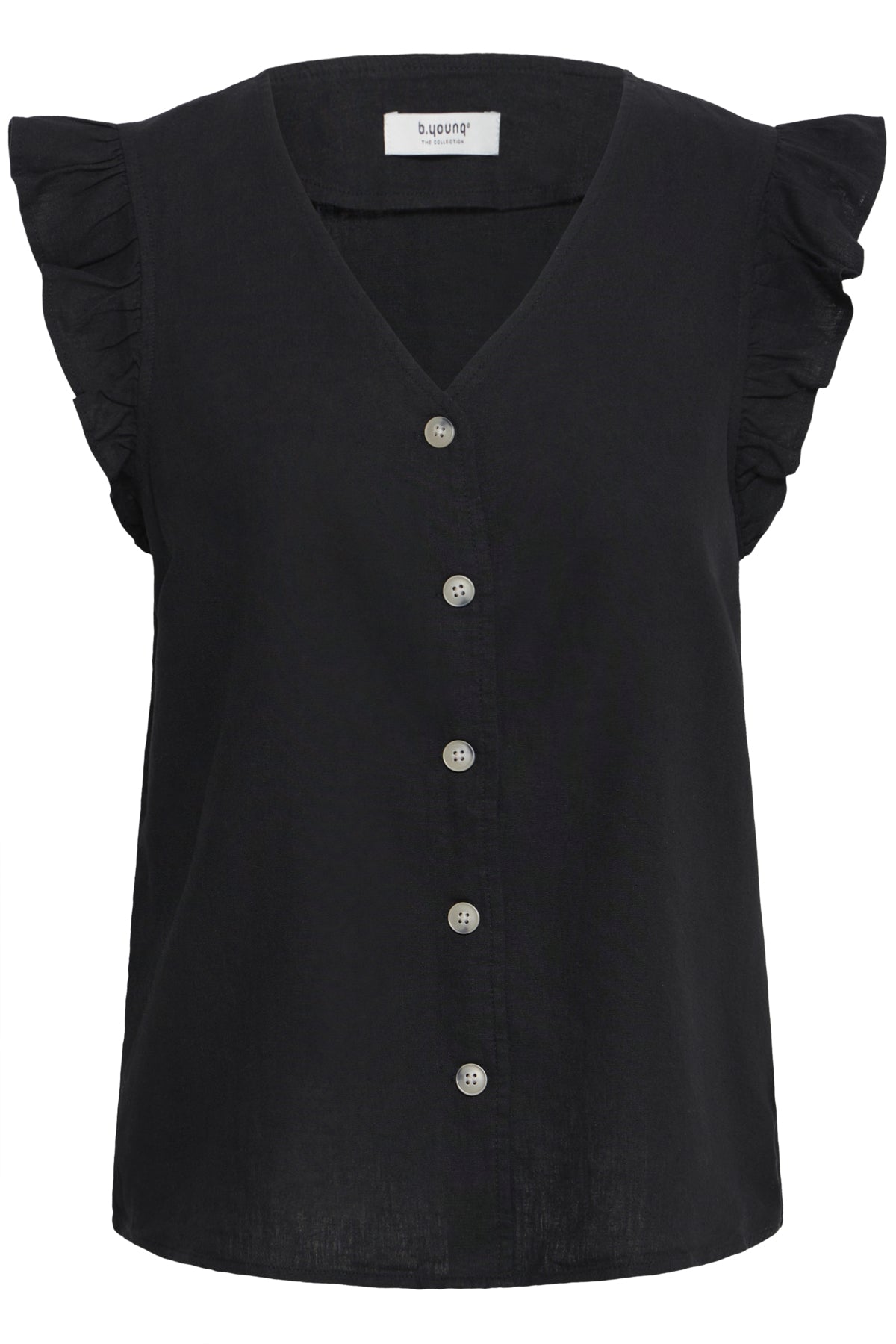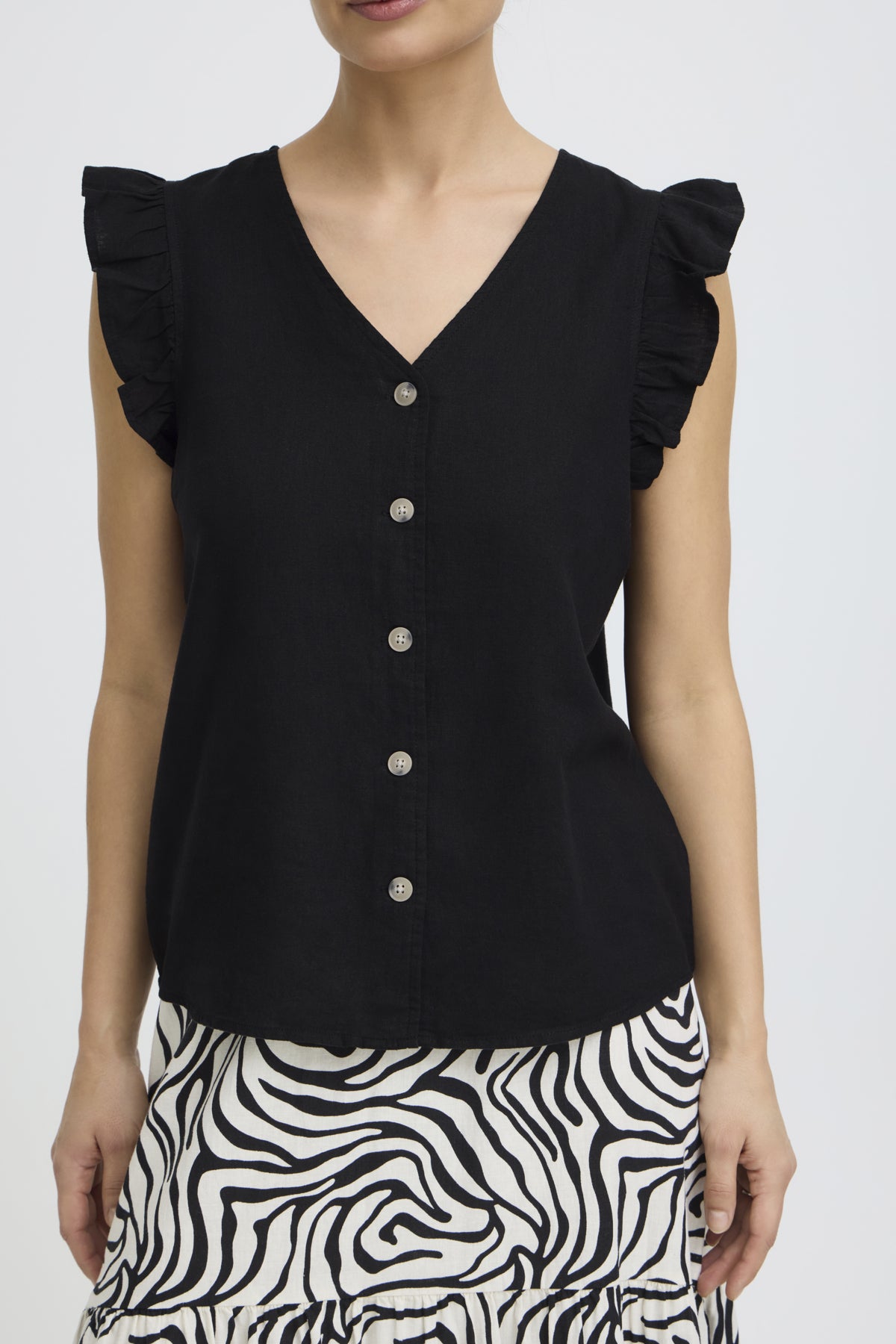 Ermeløs bluse med rett passform, V-utringning og knappestolpe med kontrast-knapper som gir liv.