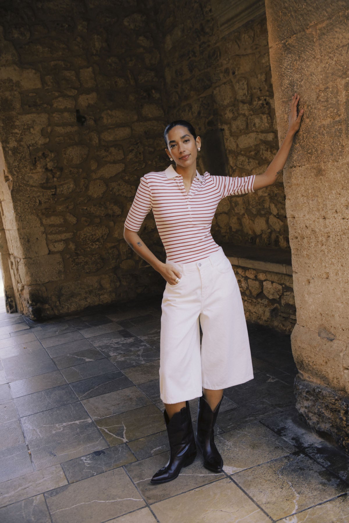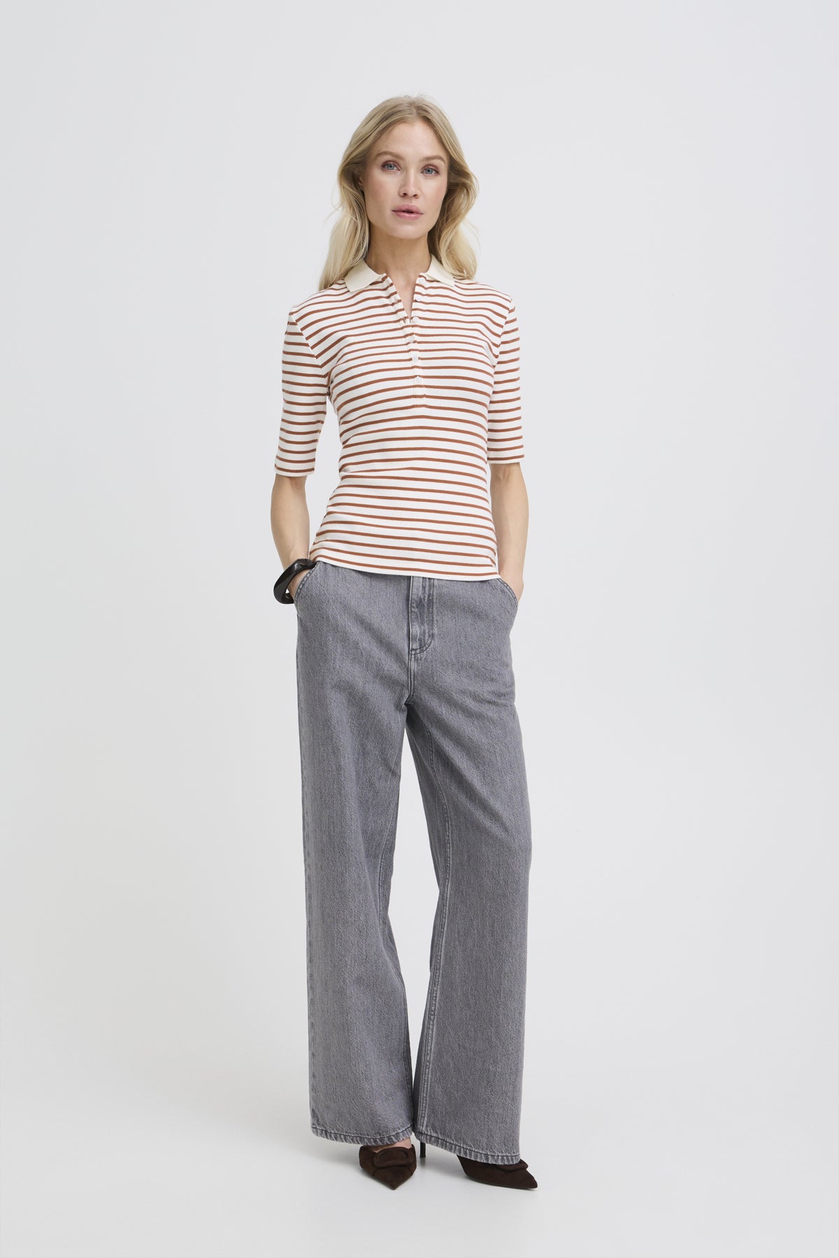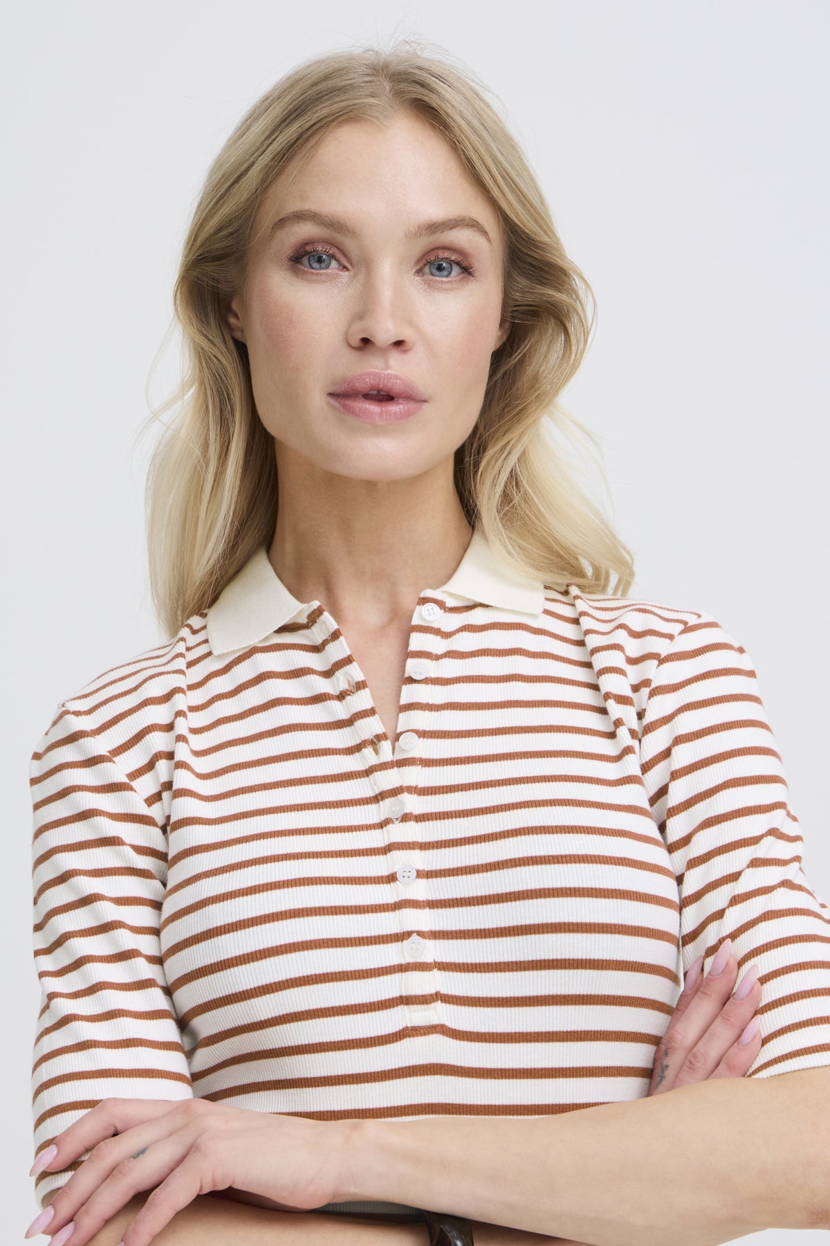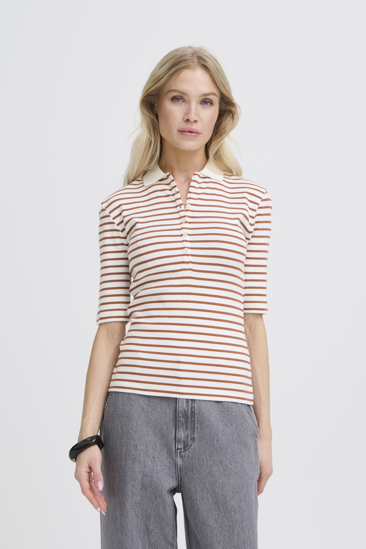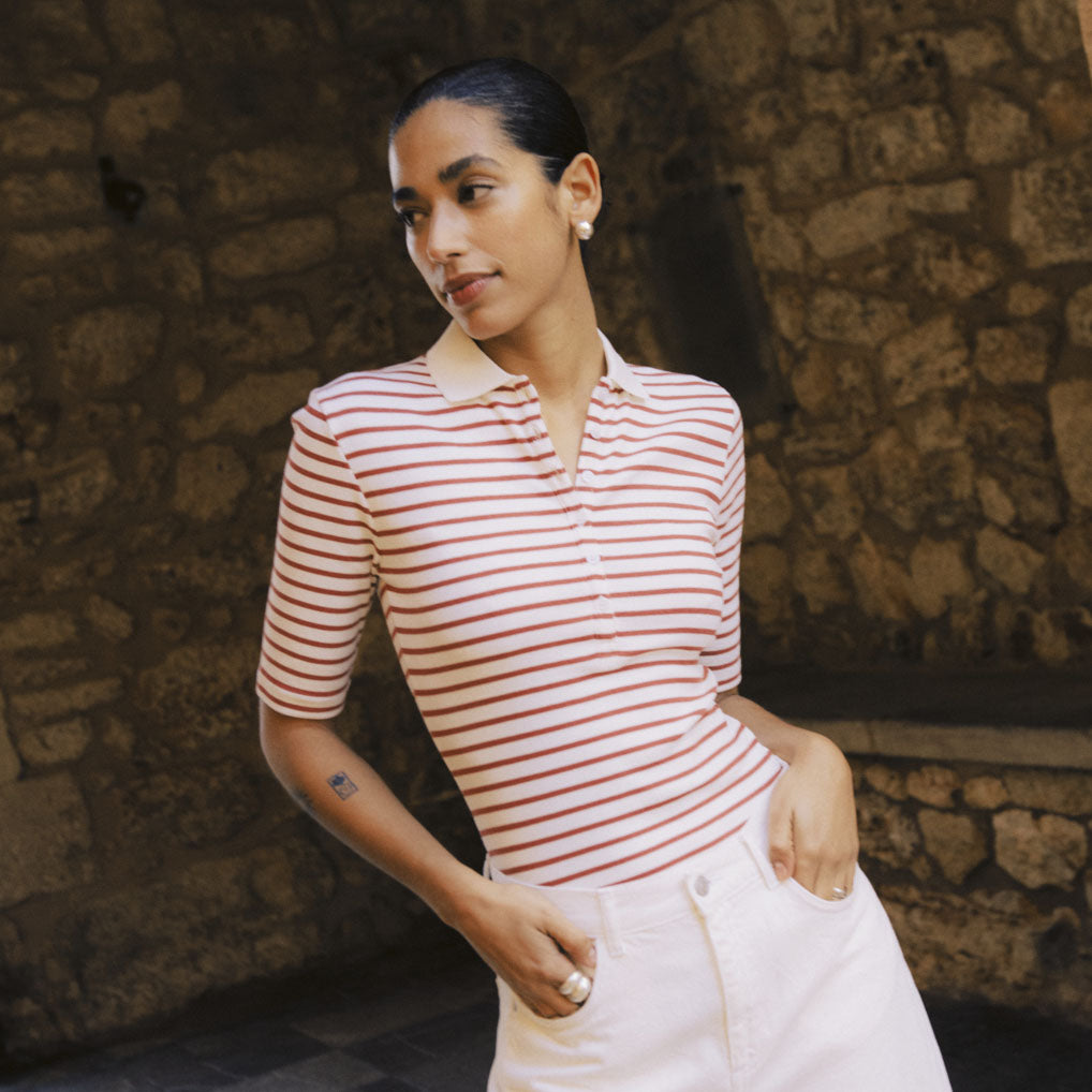Ribbestrikket pologenseren med tettsittende fasong, klassisk krage og delvis knappestolpe. Ermer til albuen gir et presist uttrykk.