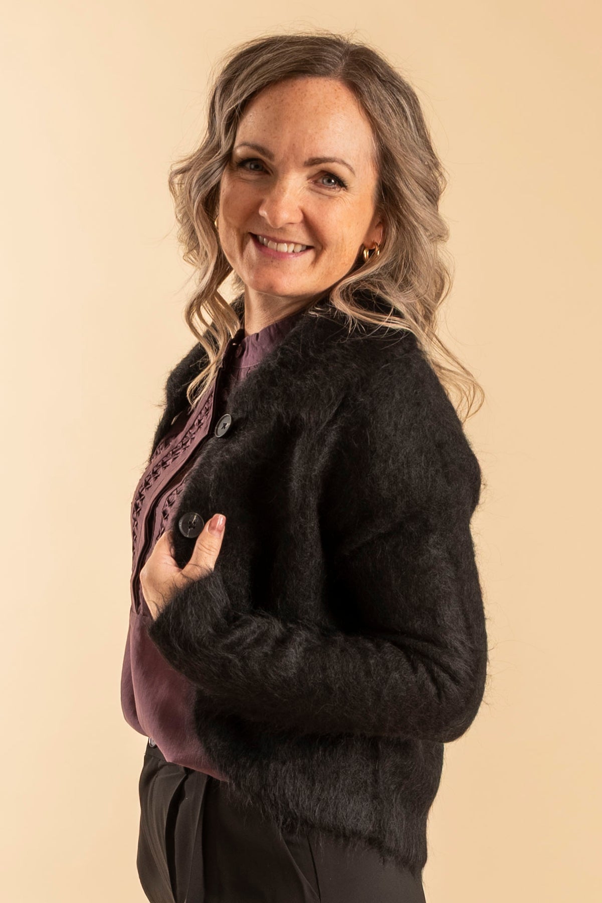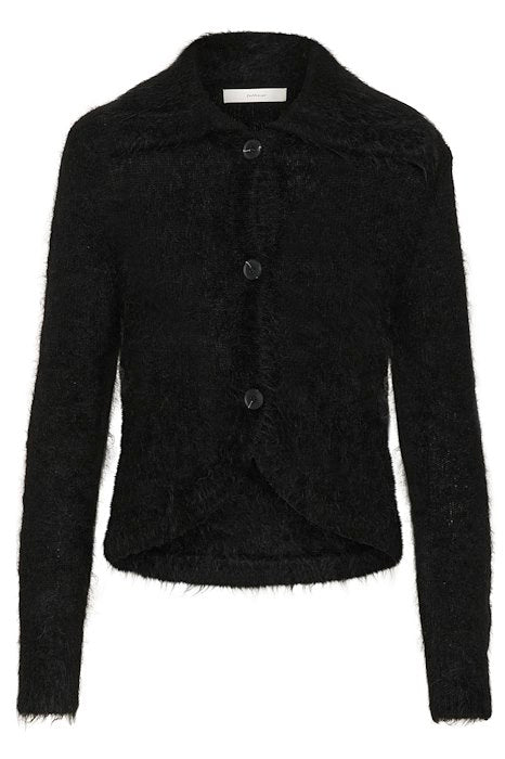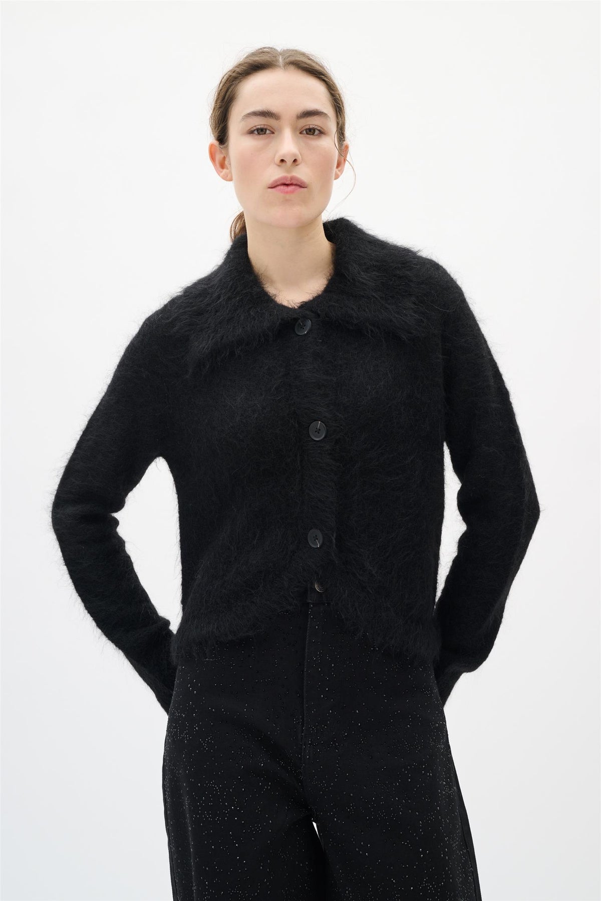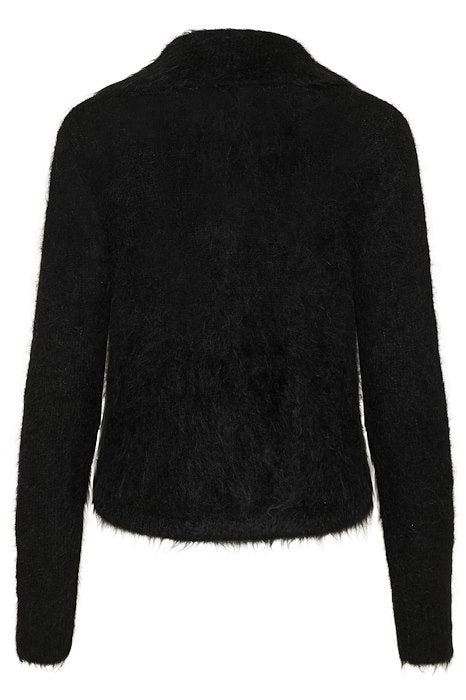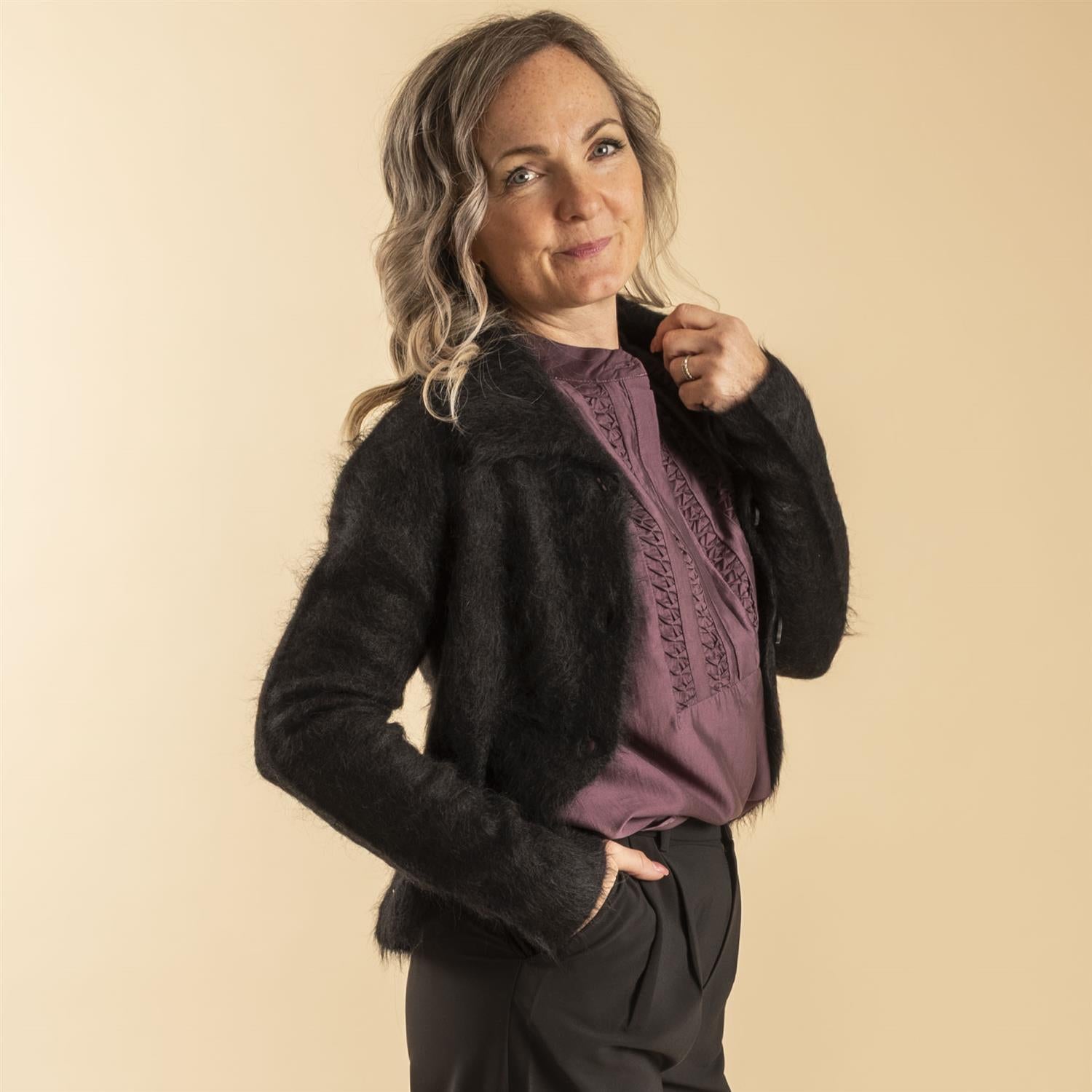 Deilig og pusete strikkejakke med krage, lange ermer og knapper ned i front. Stor krage, lange ermer og avrundet opp mot knappestolpen gir denne en typete look.