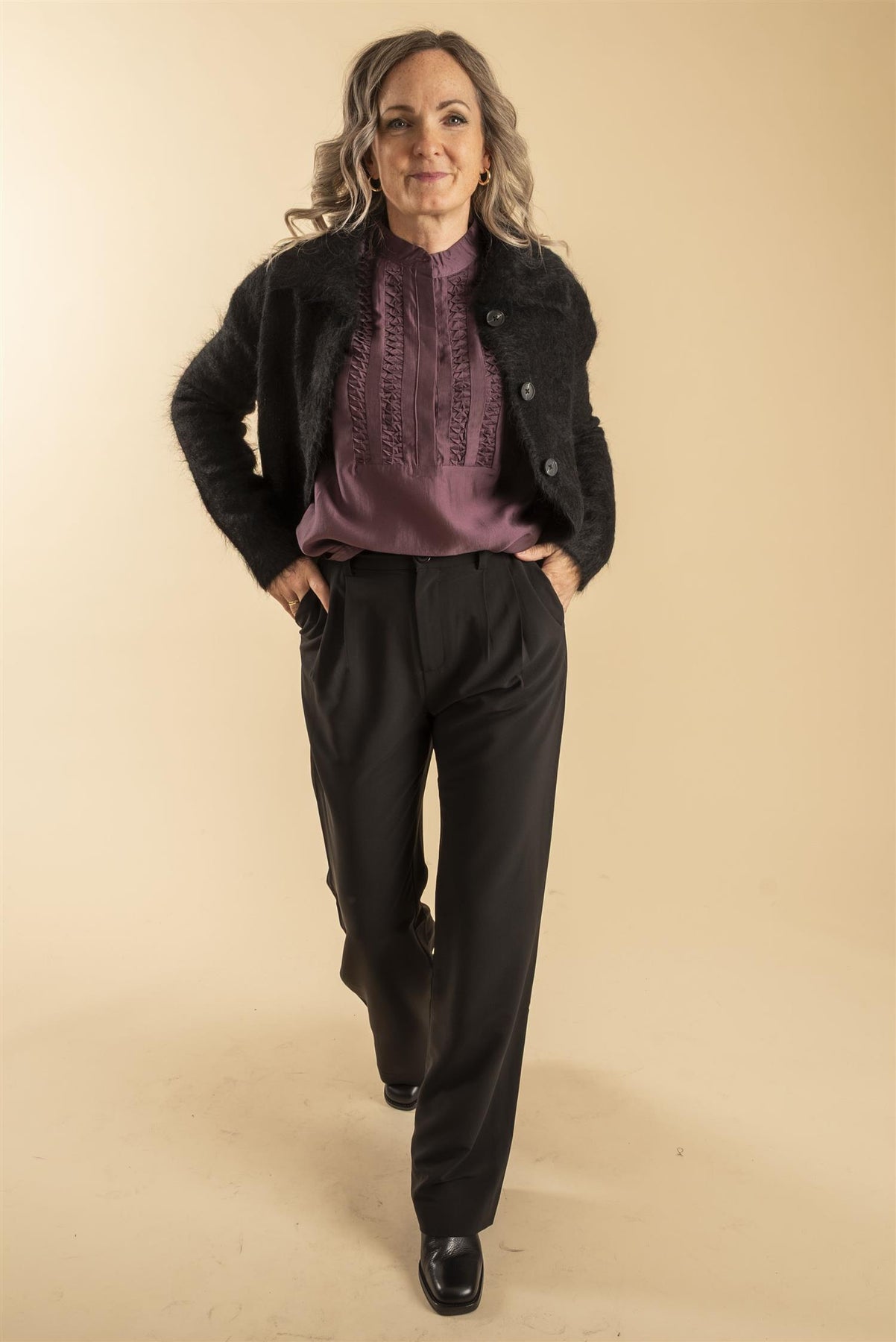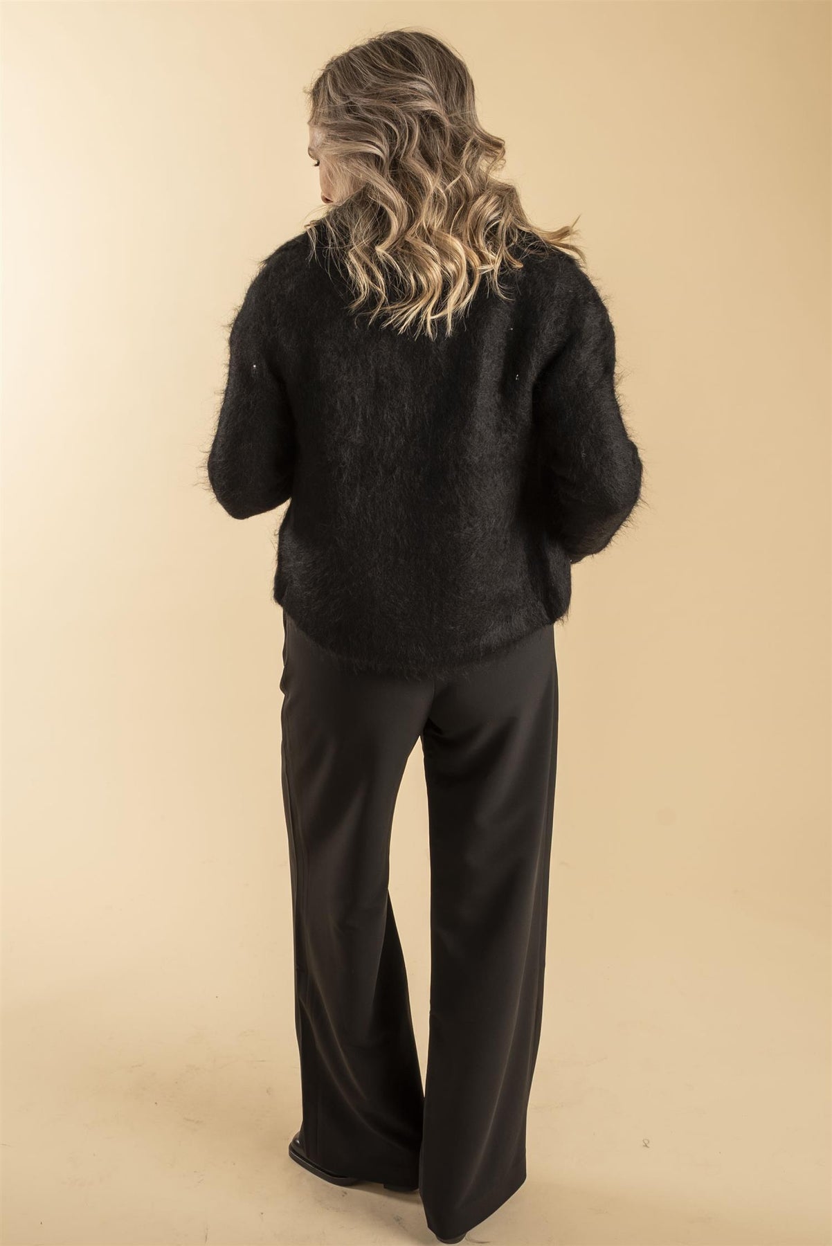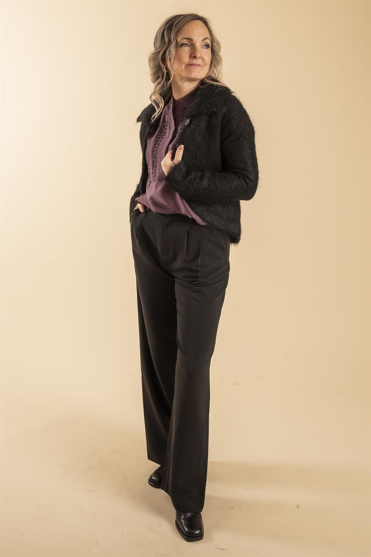 Deilig og pusete strikkejakke med krage, lange ermer og knapper ned i front. Stor krage, lange ermer og avrundet opp mot knappestolpen gir denne en typete look.