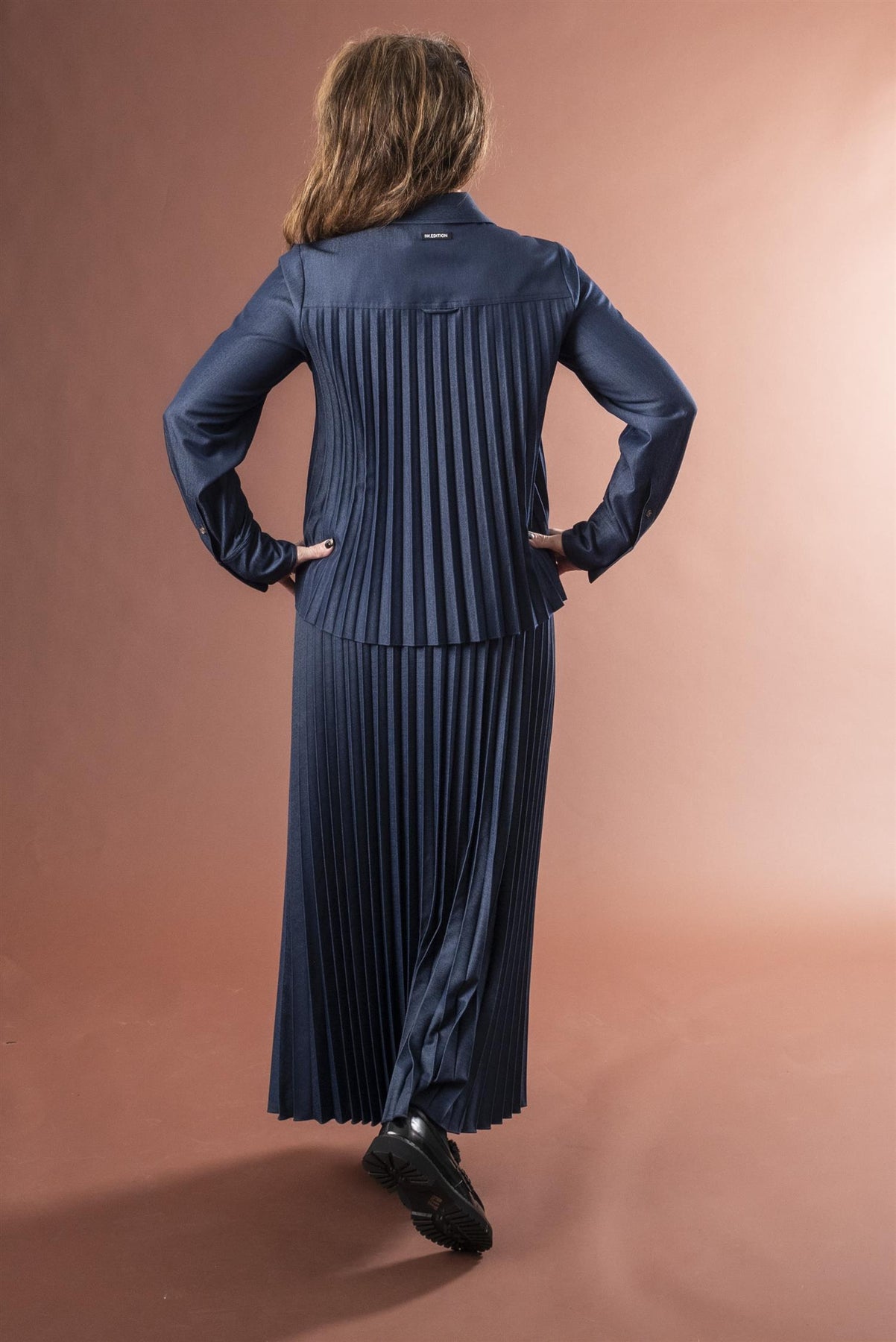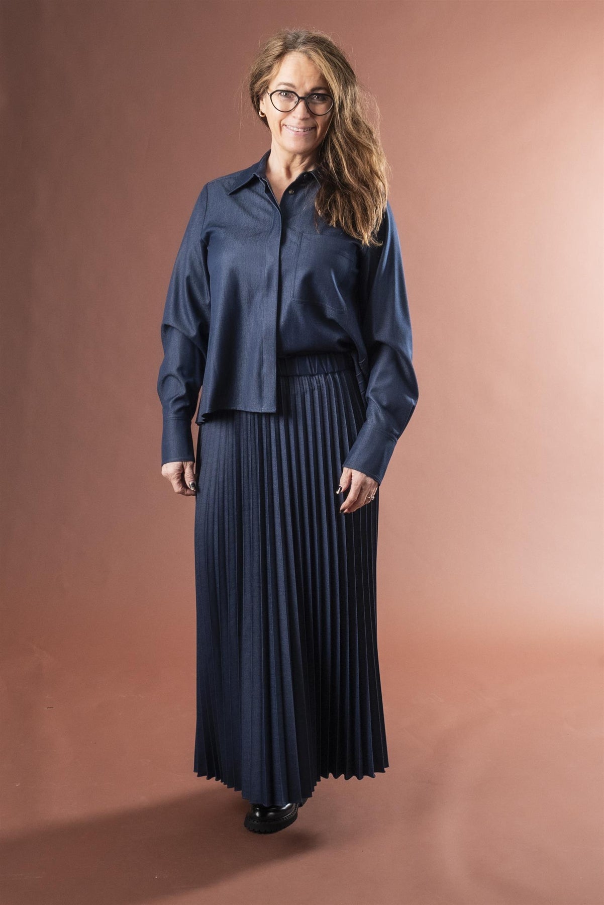 Tynn, myk og shiny denimskjorte med rett fasong, spiss krage, brystlomme og skjult knepping. Utrolig kul med plissè-rygg som matcher skjørtet i samme serie.