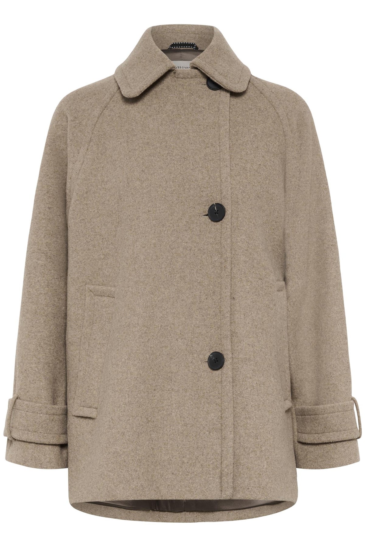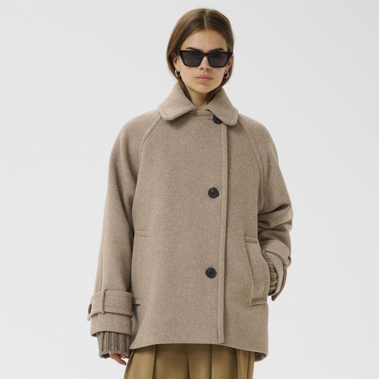 Denne jakken er et perfekt møte mellom tidløs eleganse og moderne komfort. Den har en avslappet, boxy passform i en nydelig kamelfarget ullblanding, med diskré detaljer som markerte knapper og nedtonet krage. Den korte lengden gir et minimalistisk uttrykk som passer til alt fra vide dressbukser til jeans, og de vide ermene med mansjettdetaljer gir en kul silhuett. Laget i en myk ullmiks som holder deg varm uten å føles tung.