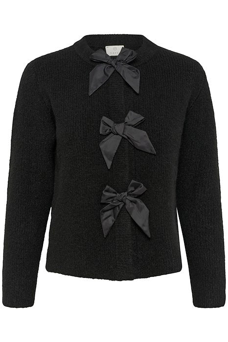Strikket cardigan med rett passform, lange ermer og ribbestrikket overflate. Tre dekorative satengsløyfer foran og rund hals.