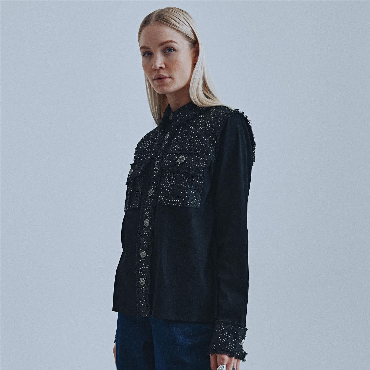 En vakker Chanel-inspirert skjorte-bluse med glitrende studs-detaljer på fronten samt mansjettene. Knappelukking helt ned og lommedetalj på bysten.