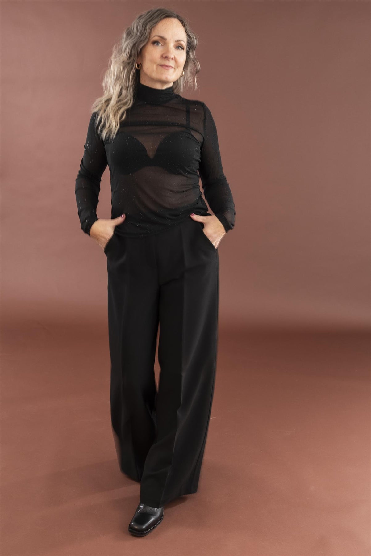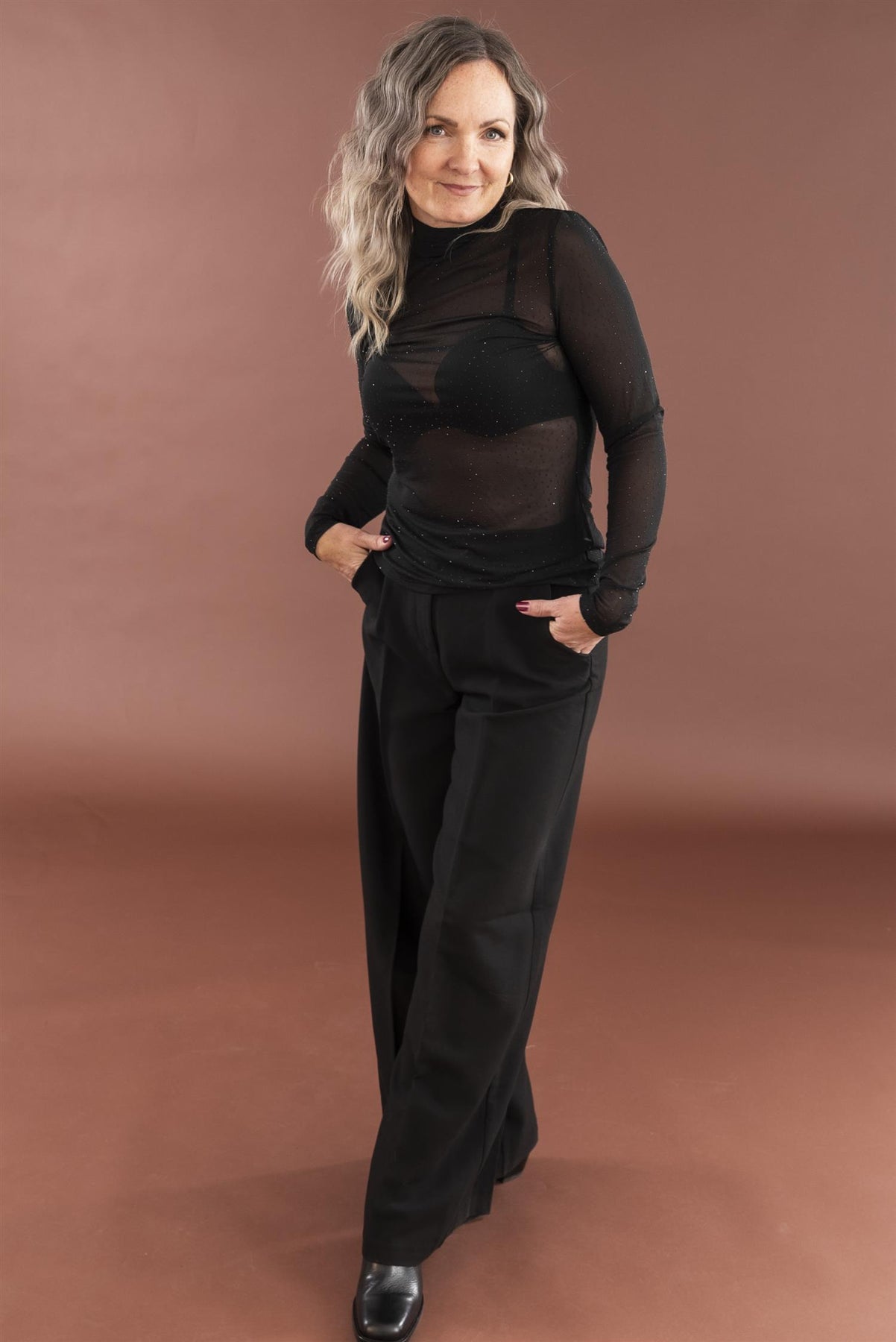 Meshtopp med tettsittende passform, høy hals og lange ermer, overstrødd med små glitrende sorte stener. Gjennomsiktig topp med diskret prikkestruktur og rene kanter.