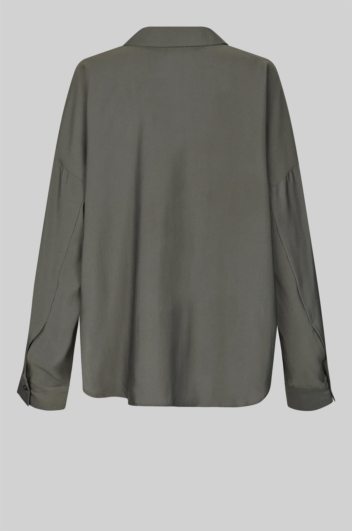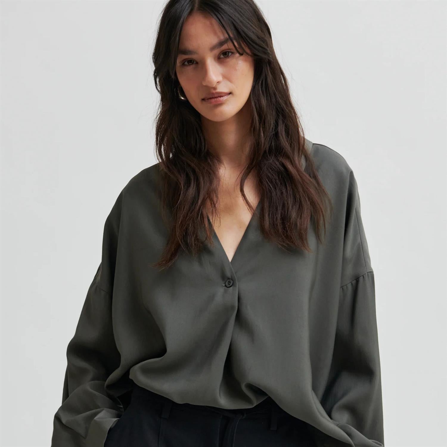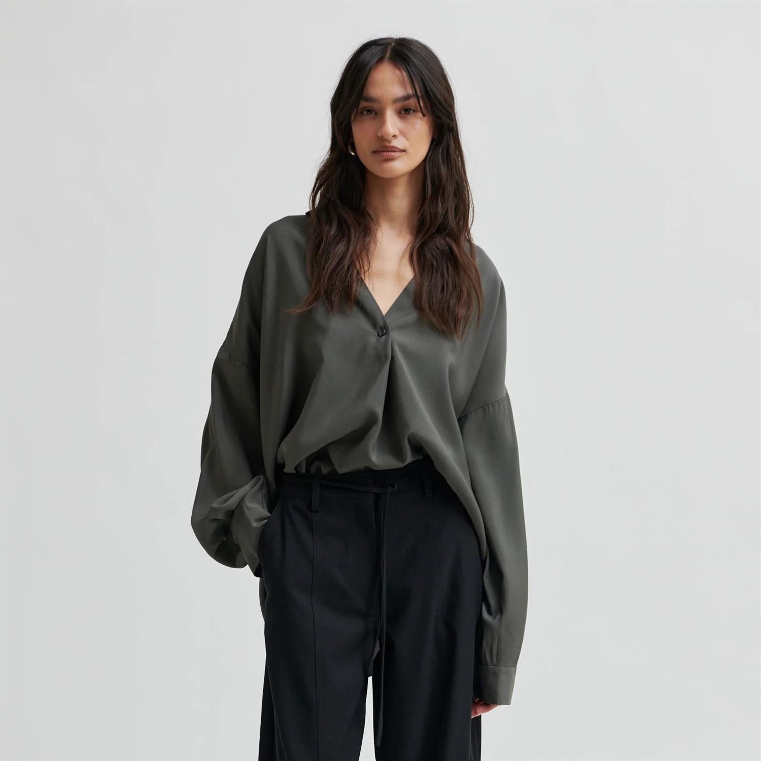Kul oversized bluse med åpen hals, i en glatt og draperende modalblanding. Har krage med åpen hals og enkeltknapplukking.