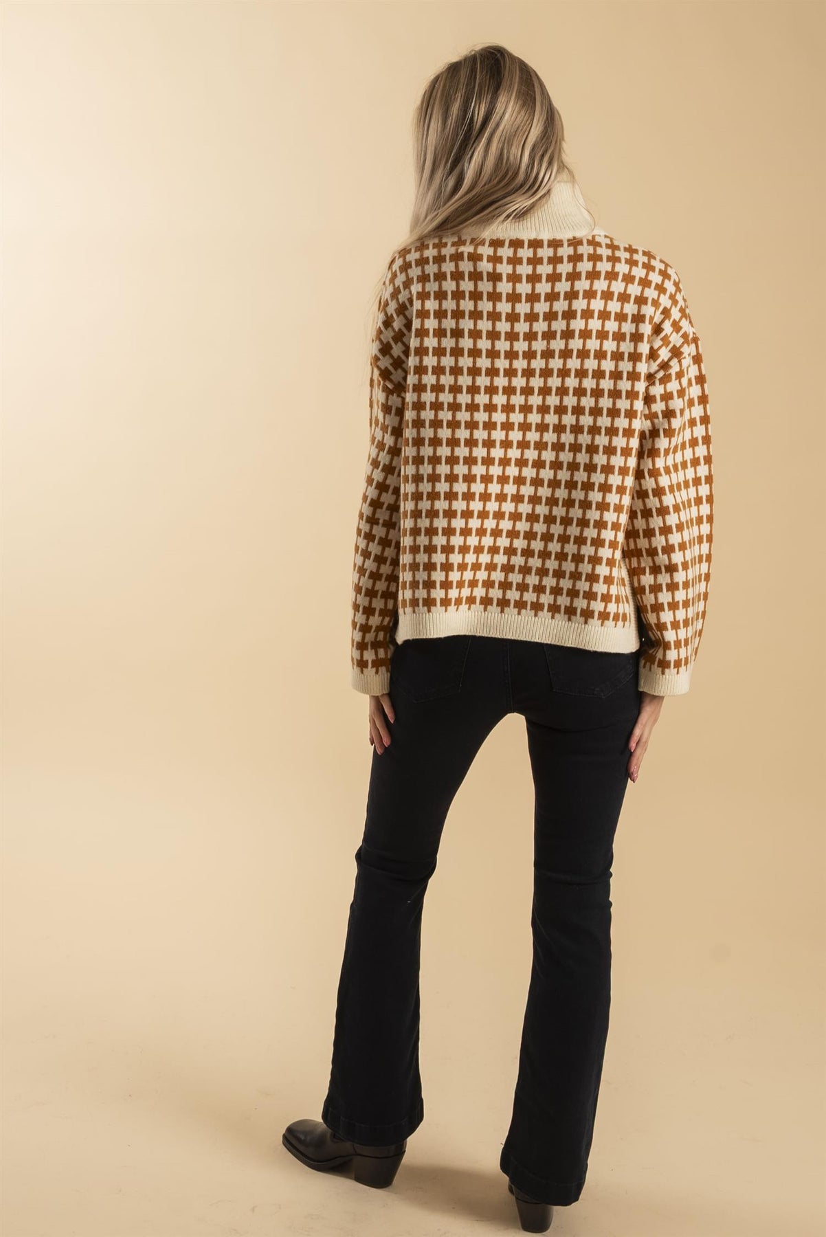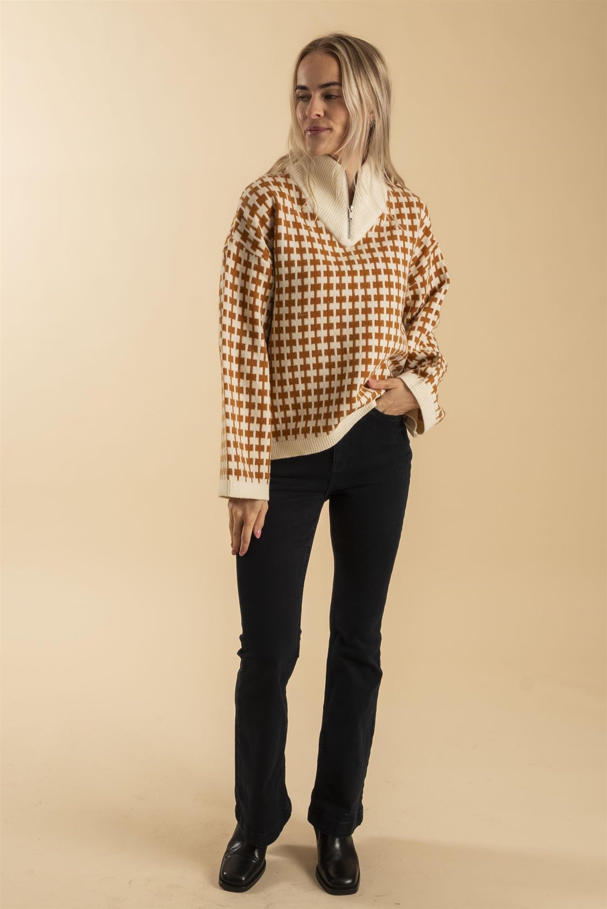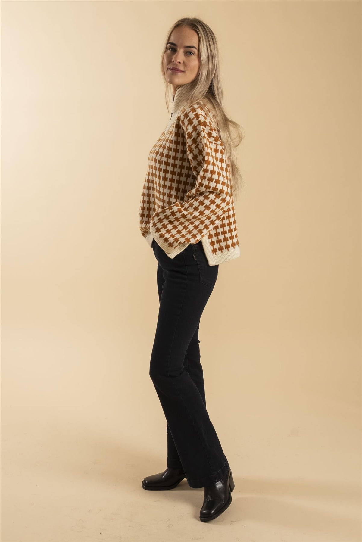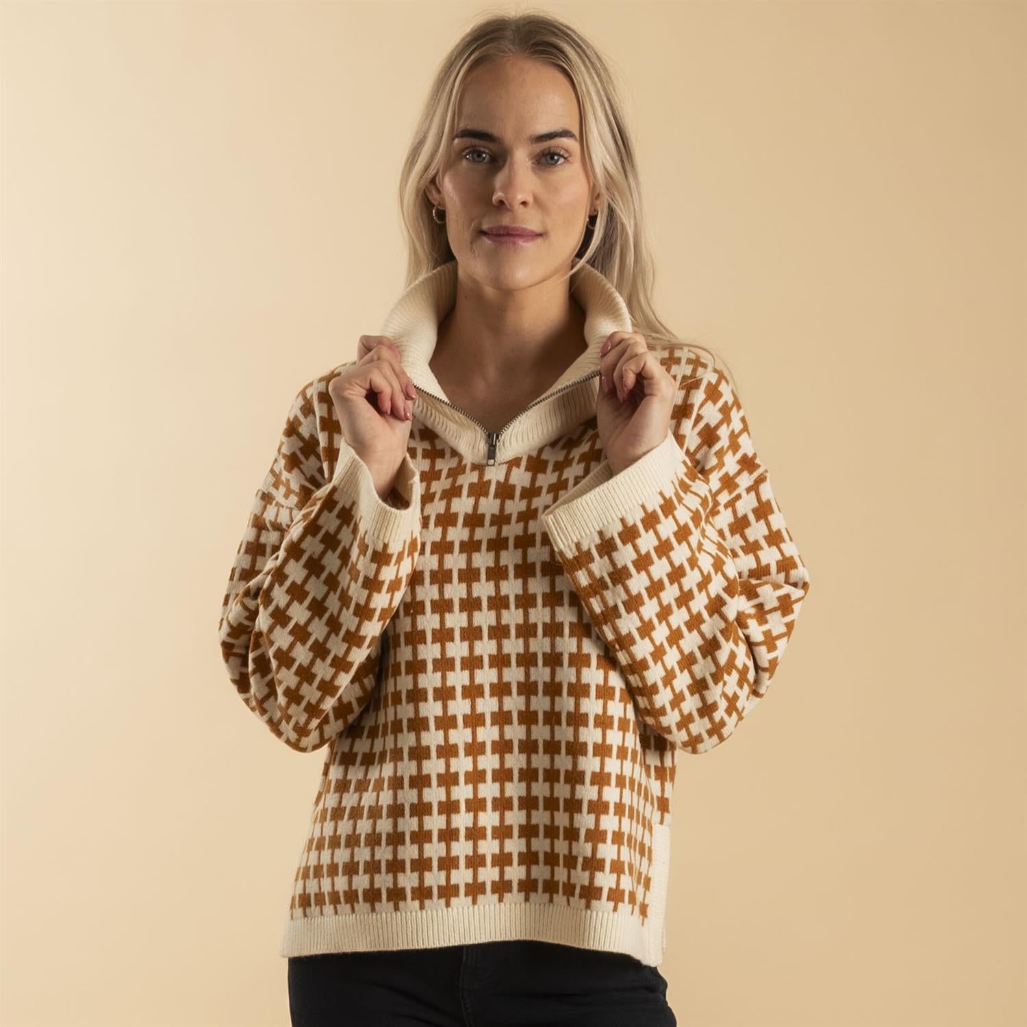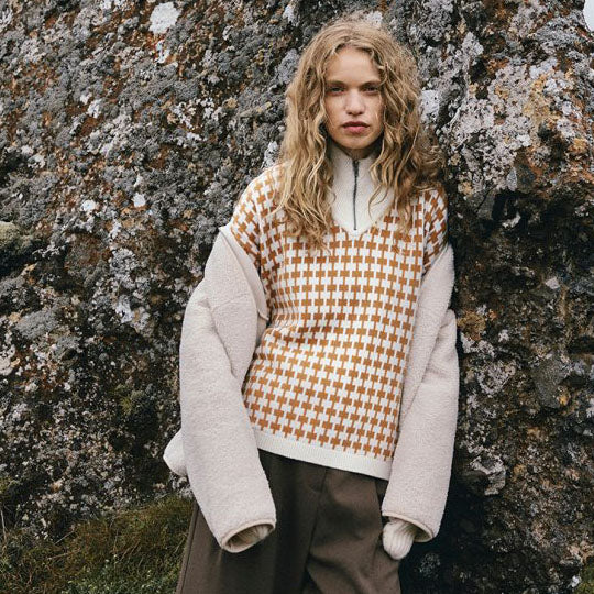 Kul, avslappet og raffinert strikkegenser, laget for lag-på-lag og uanstrengt styling. Den har en høy hals med halv glidelås, senkede skuldre og ribbede kanter som gir tekstur og struktur.