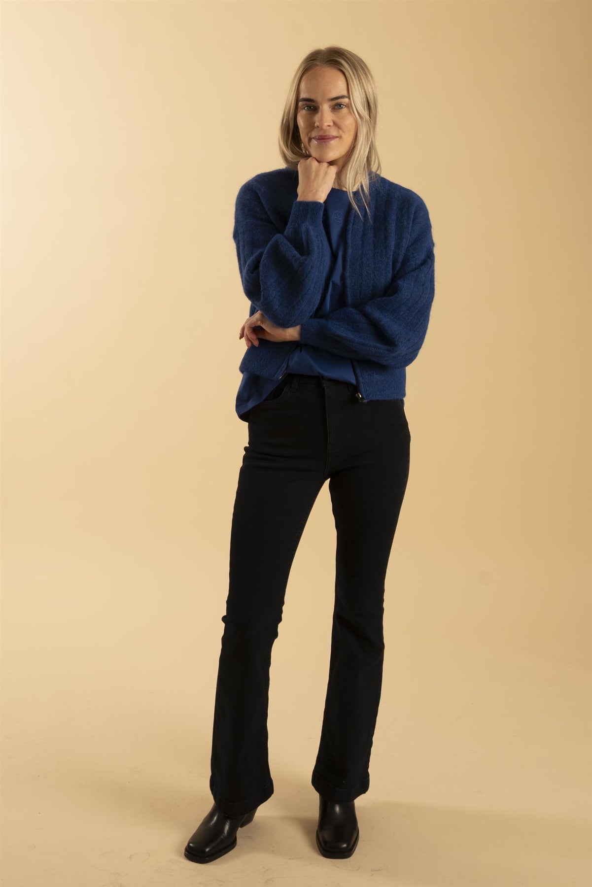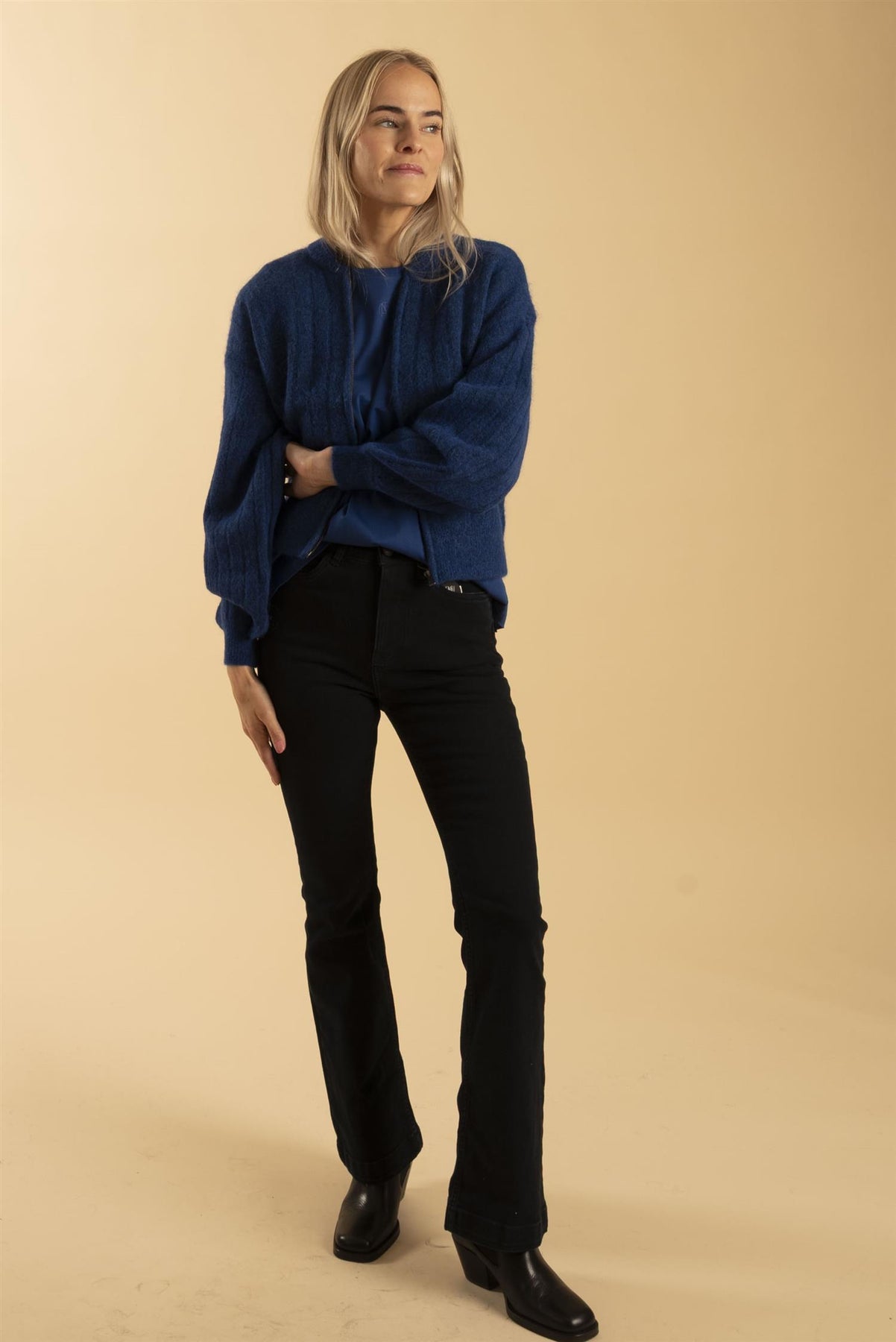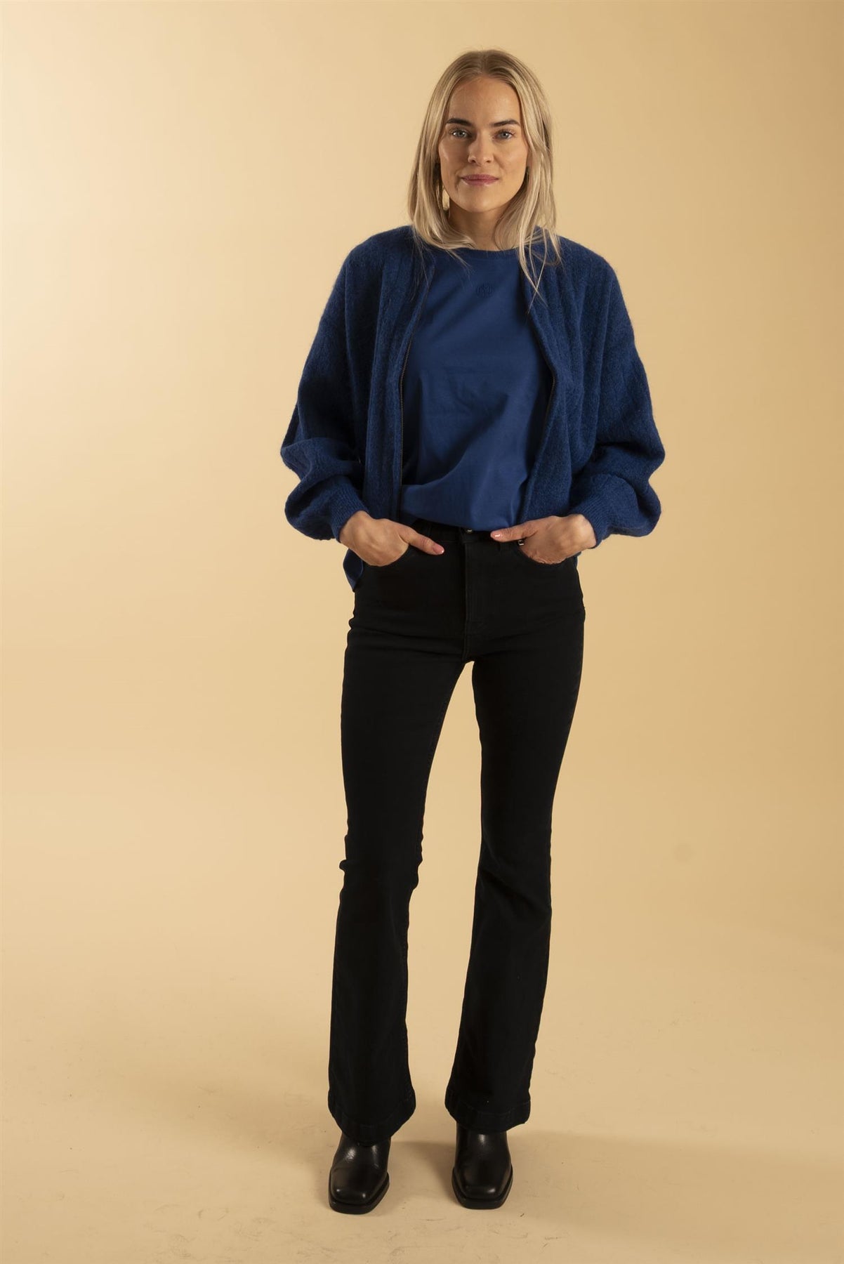 Vår egen modell er 169 cm og har str. XS/S. Jeansen er Pzbecca bootcut fra Pulz.