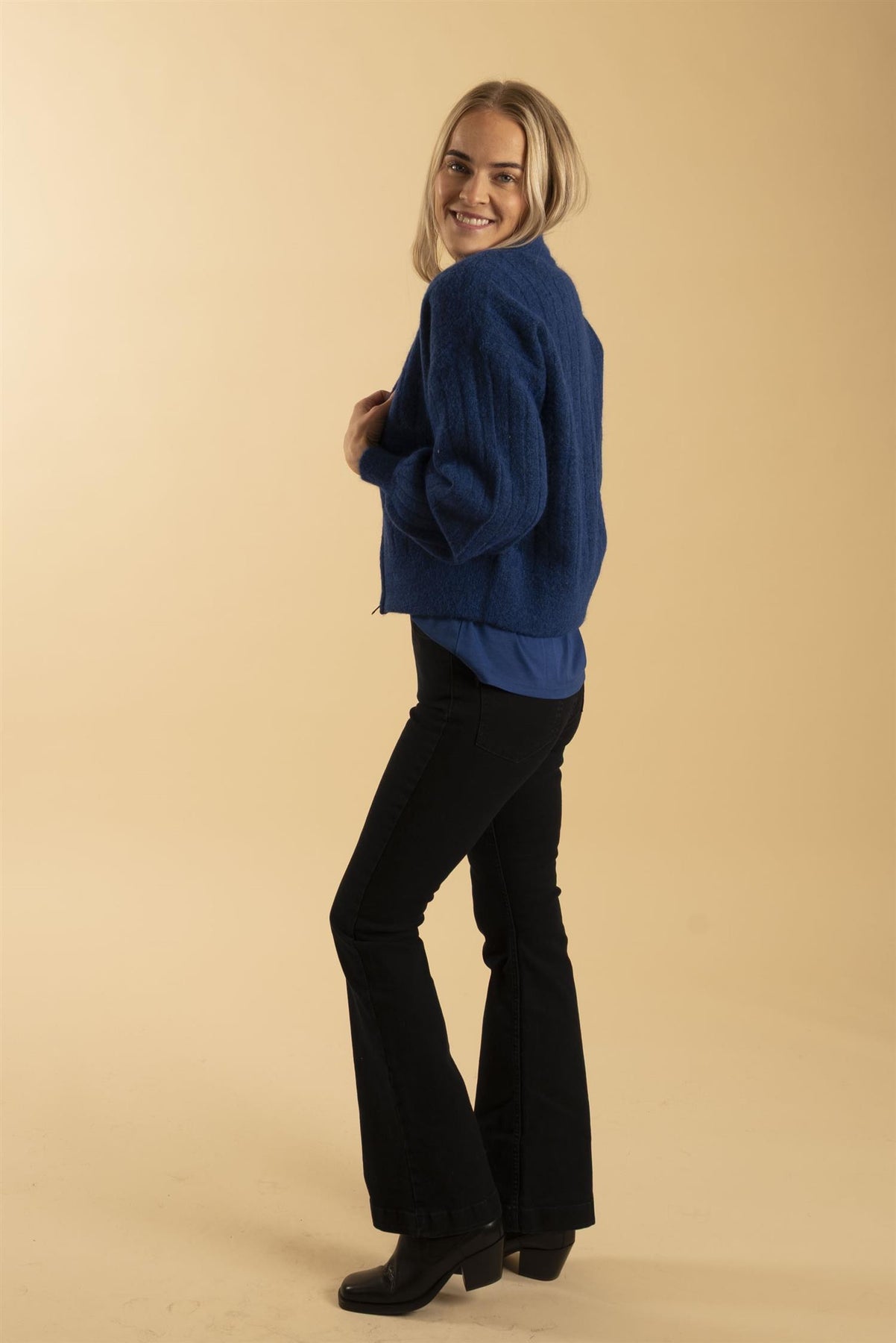 Kul ribbestrikket strikket cardigan med glidelåslukking foran og funksjonelle lommer, som gir både bekvemmelighet og en moderne look. Avslappet passform som gjør den enkel å kombinere med alt fra jeans til uformelle bukser. Enten den bæres åpen eller med glidelås, er den avgjørende for å skape varme, komfortable og stilige antrekk.