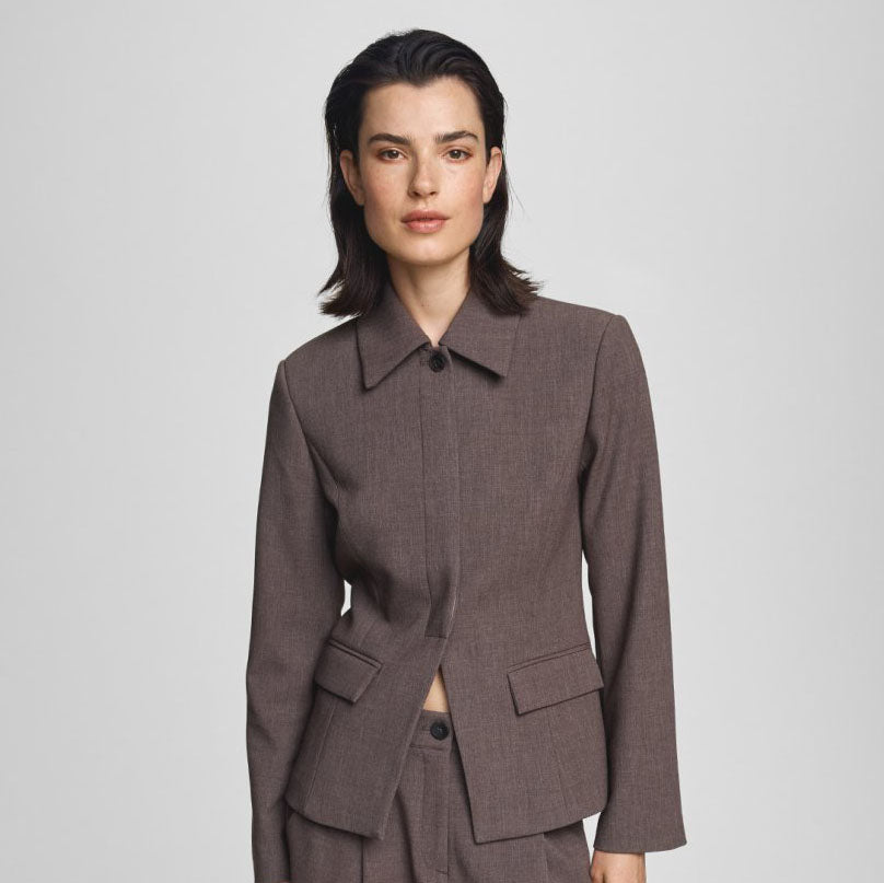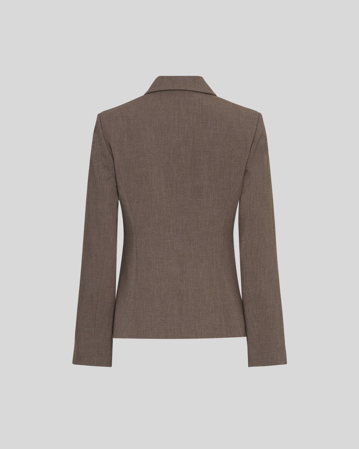 Vakker blazer med skreddersydd silhuett. Den er designet i et strukturert stoff, og har en enkeltspent lukking, skarpe slag og lommer med klaff foran. Blazeren gir et sofistikert preg til ethvert antrekk – enten den er stylet med matchende skjørt eller slått over en t-skjorte og jeans for et mer avslappet utseende.