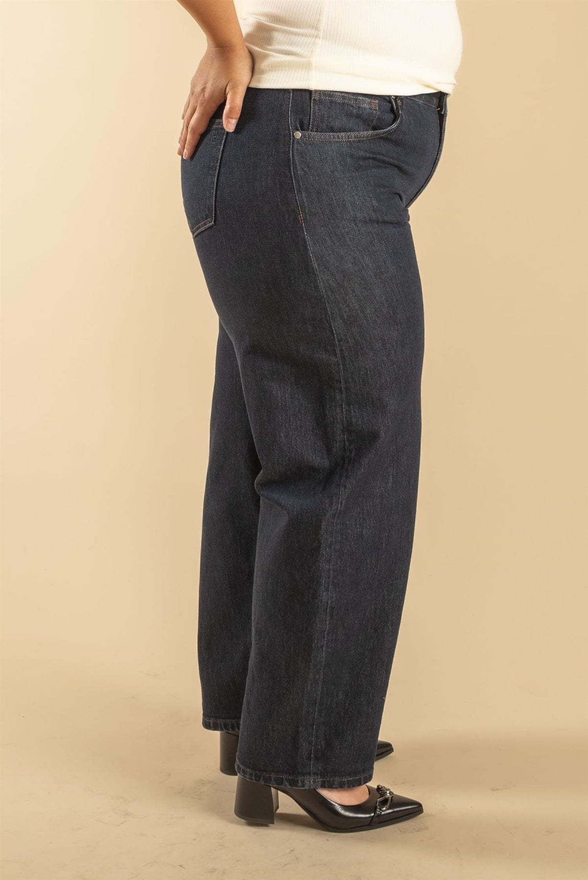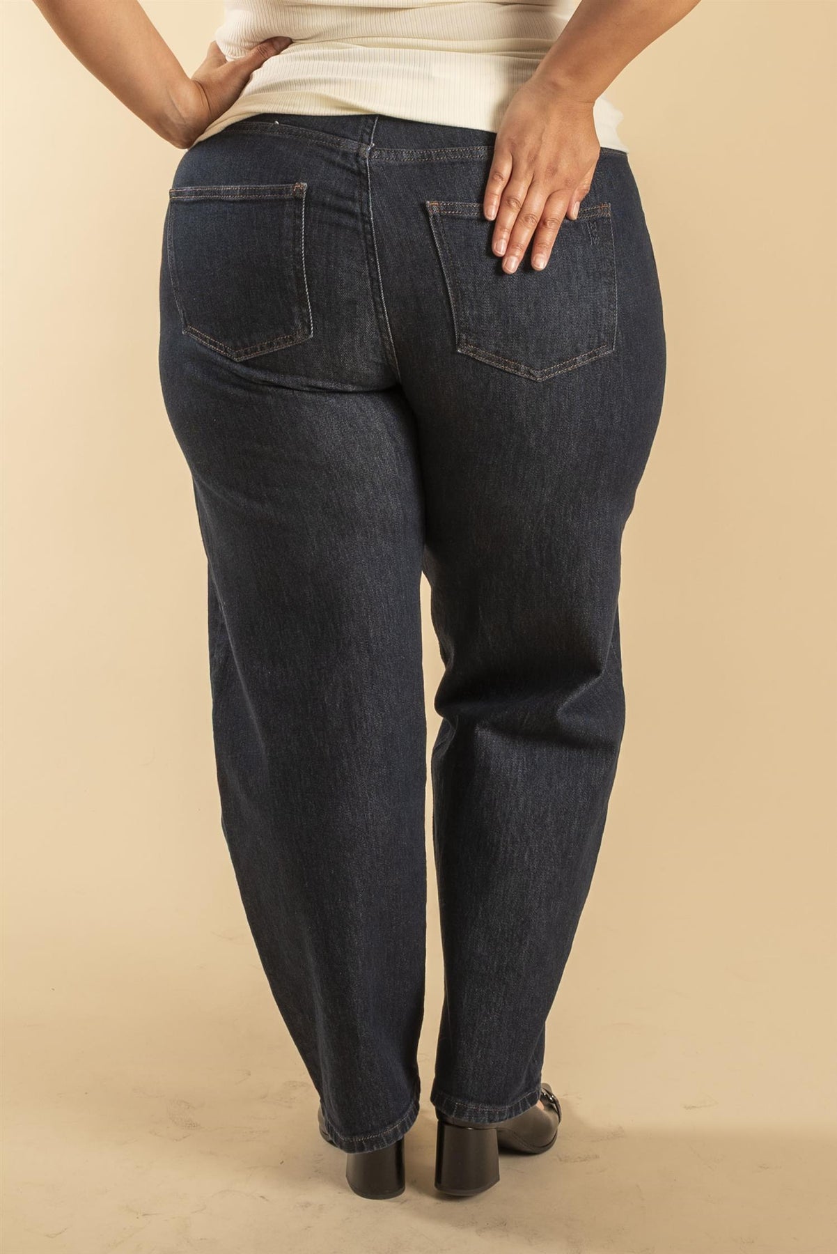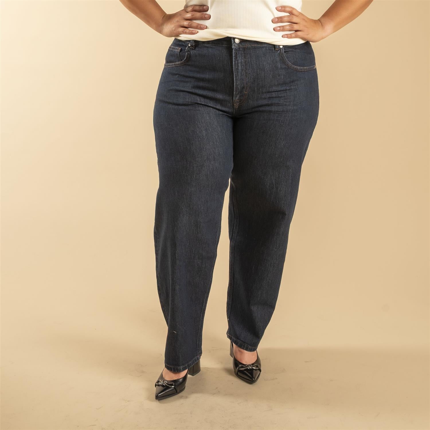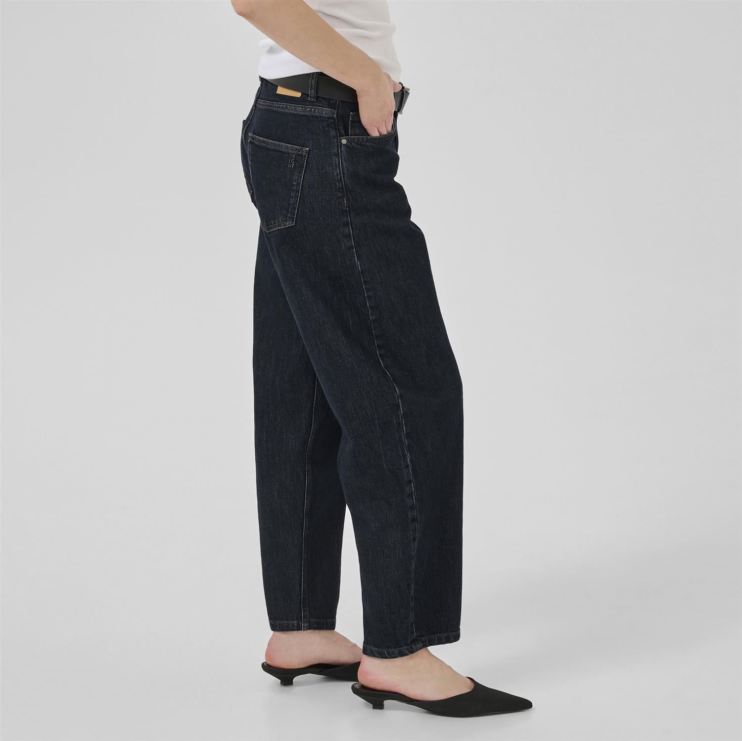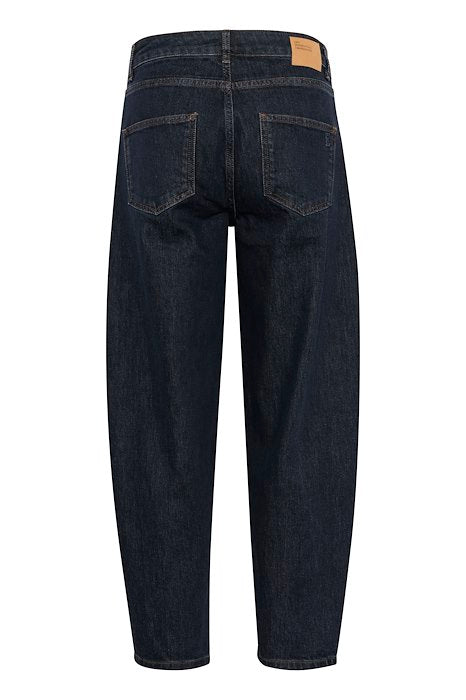 Trendy jeans med tønne-fasong som gir høyt liv og vidde i lårene, og smalner inn nede ved anklene.