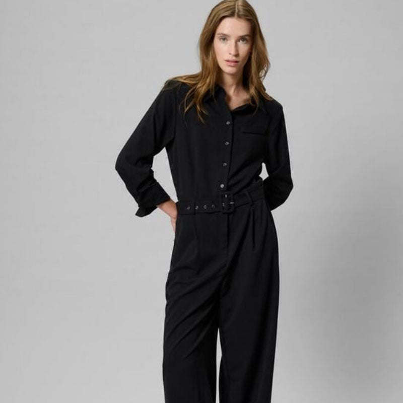 Superkul jumpsuit, med slag, lange ermer med mansjett, og bredt belte i linningen.