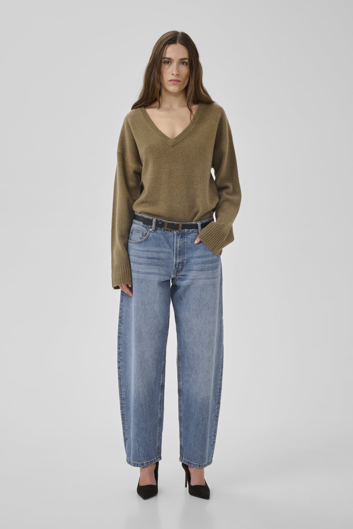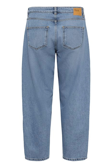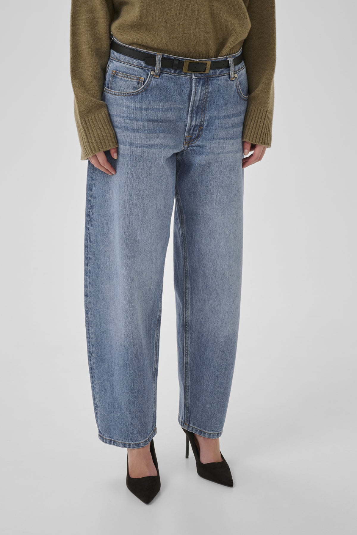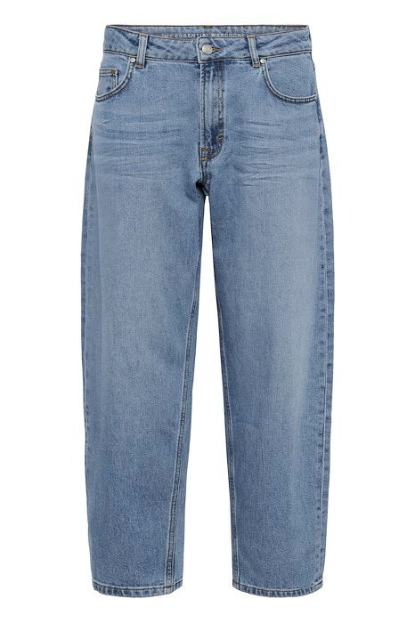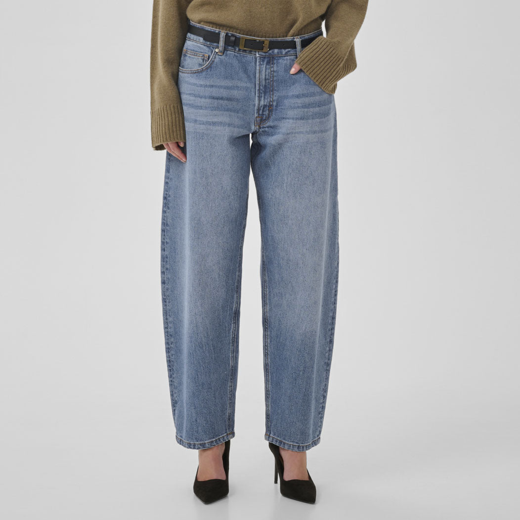 Trendy jeans med tønne-fasong som gir høyt liv og vidde i lårene, og smalner inn nede ved anklene.