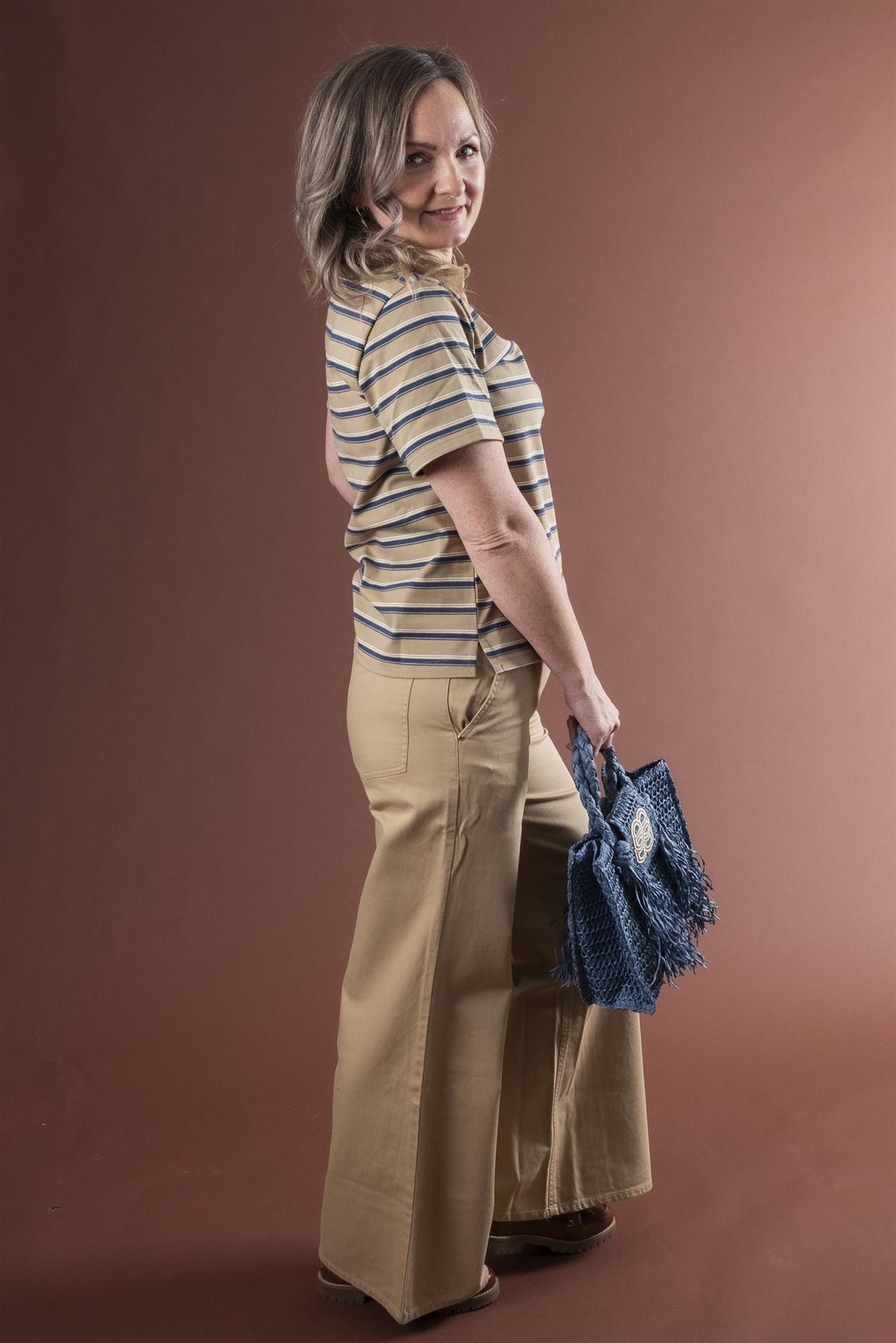 Lekker med dyp sandfarge mot det jeans-blå gjør denne perfekt til jeans.