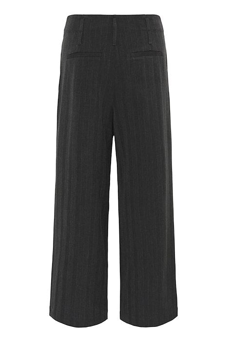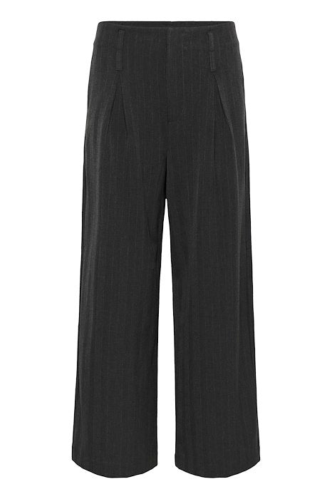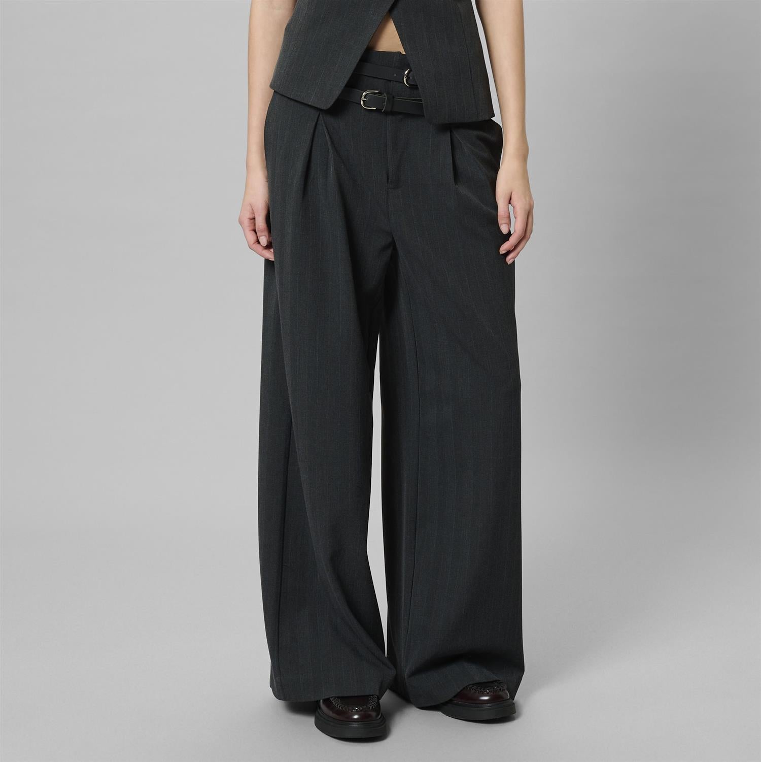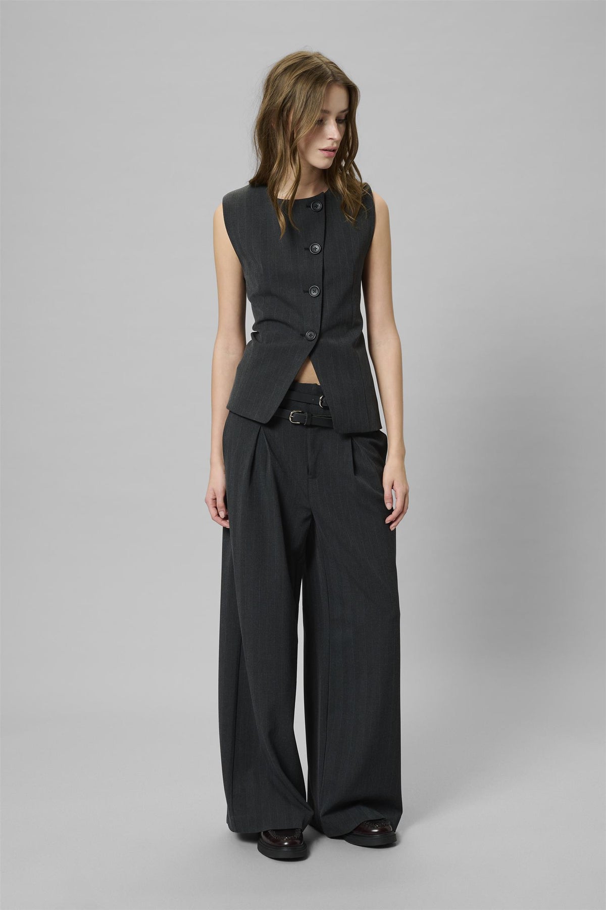 Nålestripet høytlivet bukse med vid passform, nedsydde markerte folder/legg , beltehemper og praktiske lommer.