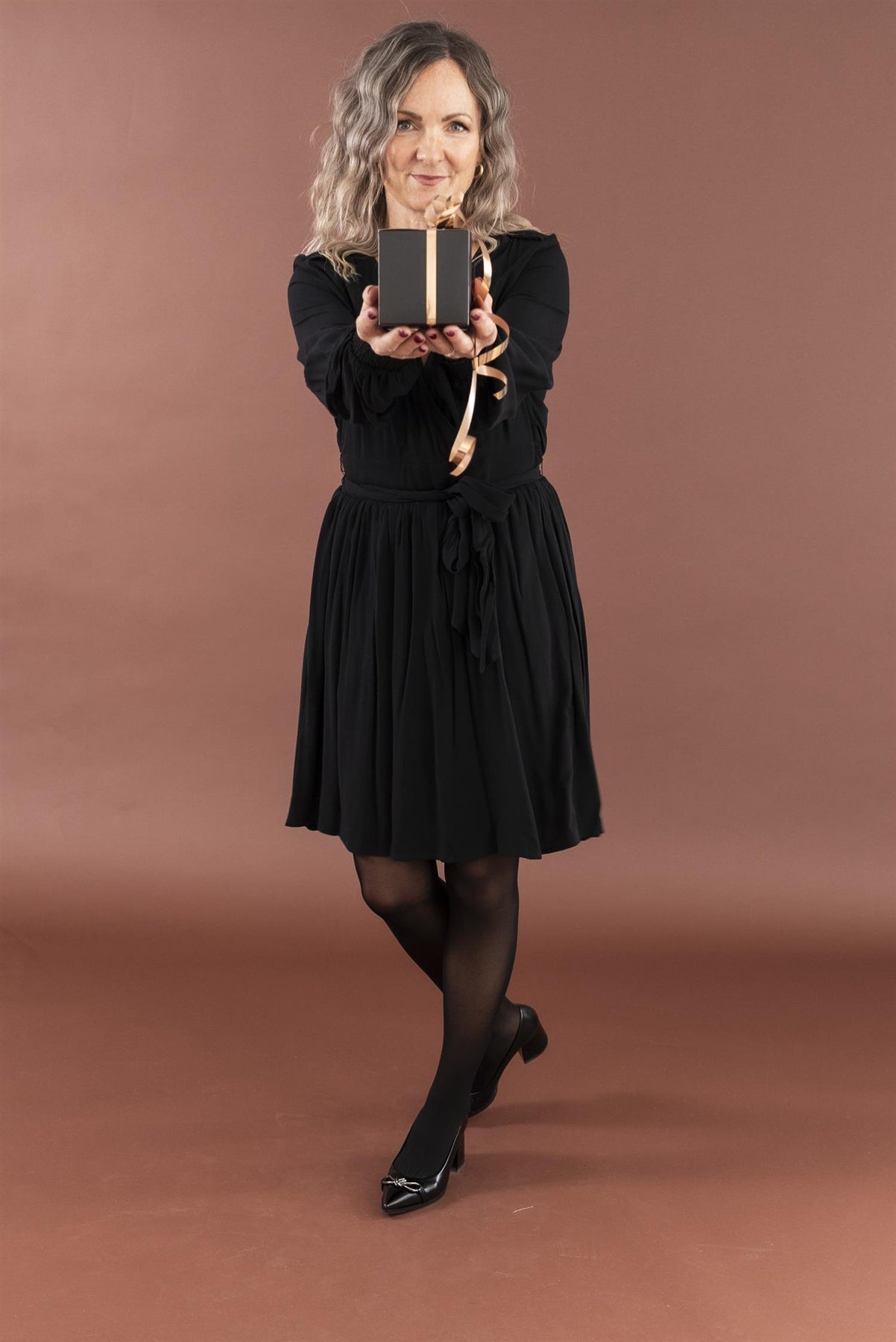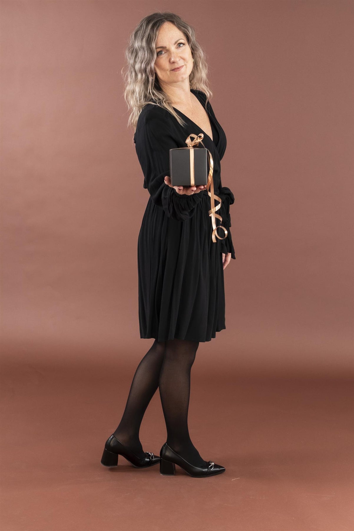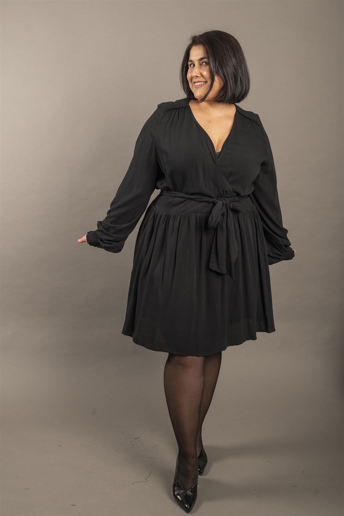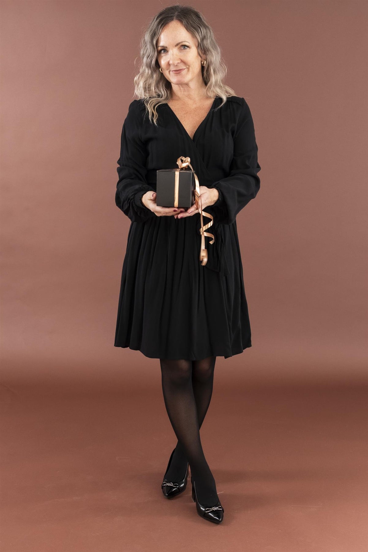 Klassisk omslagskjole i helt sort med lange ermer. Kun tilbehøret som bestemmer anledningen her, for denne kan virkelig brukes til så utrolig mye! Praktisk med lange ermer på vinteren.