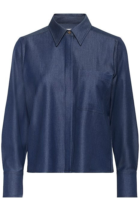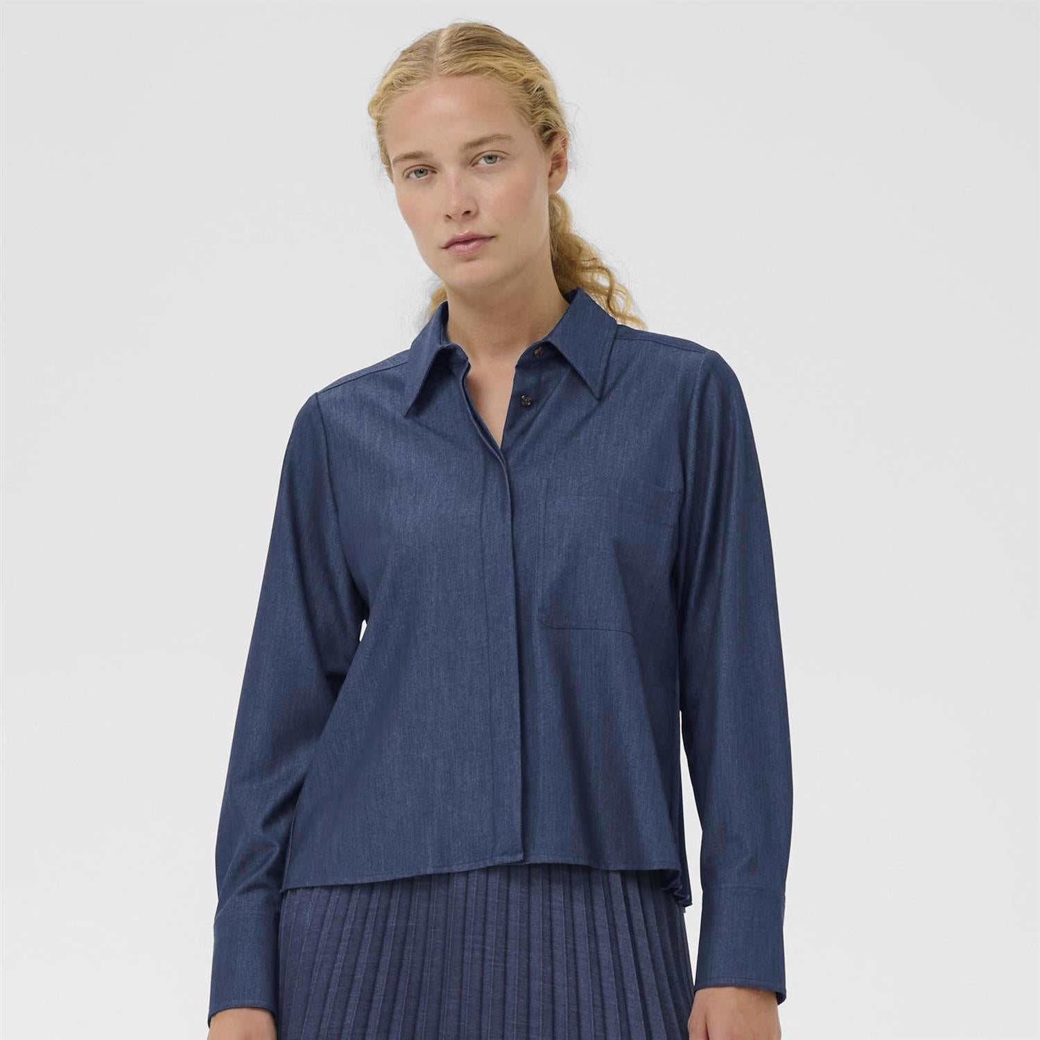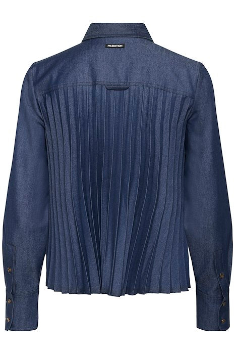 Tynn, myk og shiny denimskjorte med rett fasong, spiss krage, brystlomme og skjult knepping. Utrolig kul med plissè-rygg som matcher skjørtet i samme serie.