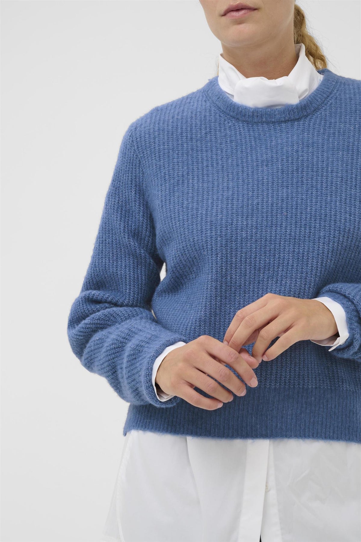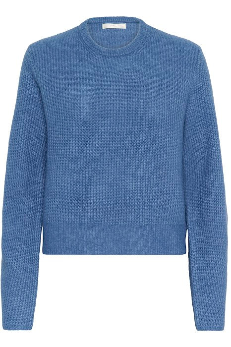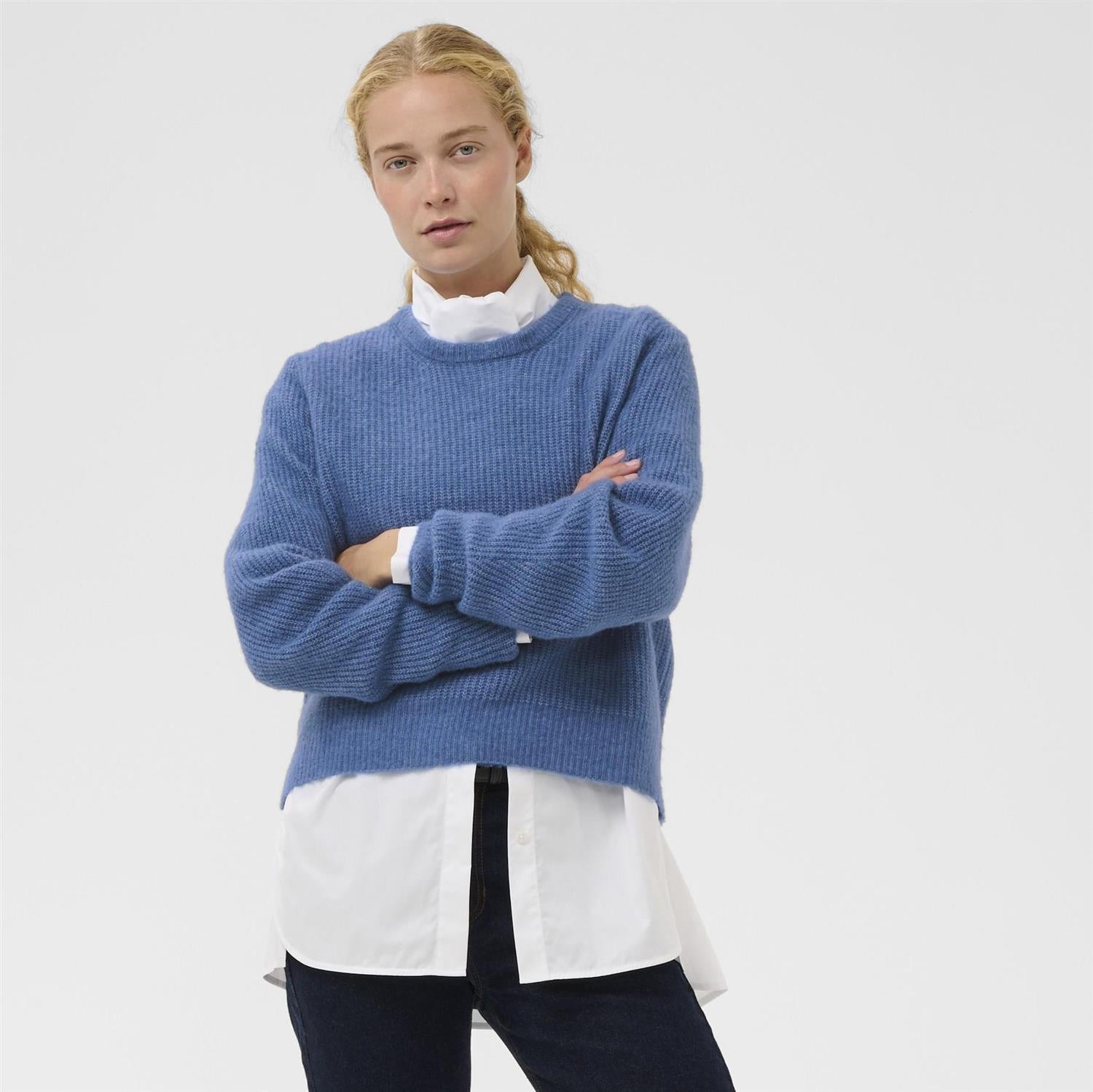 Myk og deilig genser med rett, boxy passform og subtil ribbestruktur. Rund hals, lange ermer, cropped lengde og rene linjer uten synlige sømmer.