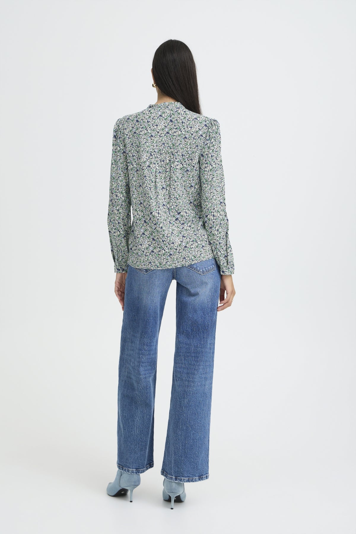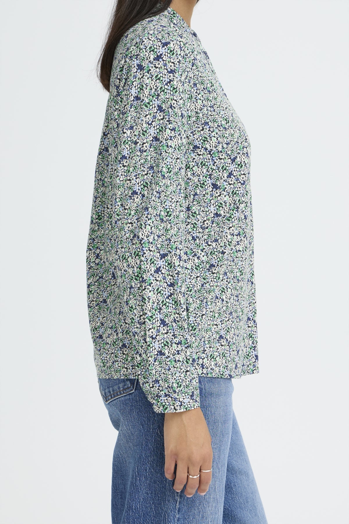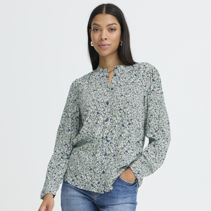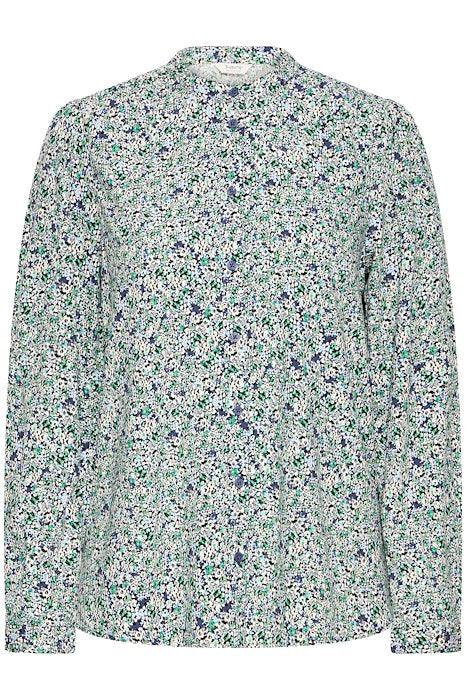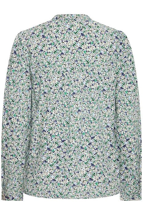 Søt bluse i rett passform med mykt uttrykk og lett rynkede skuldre. Delikat fargekombinasjon og konstrastrike knapper.