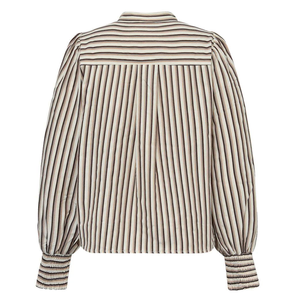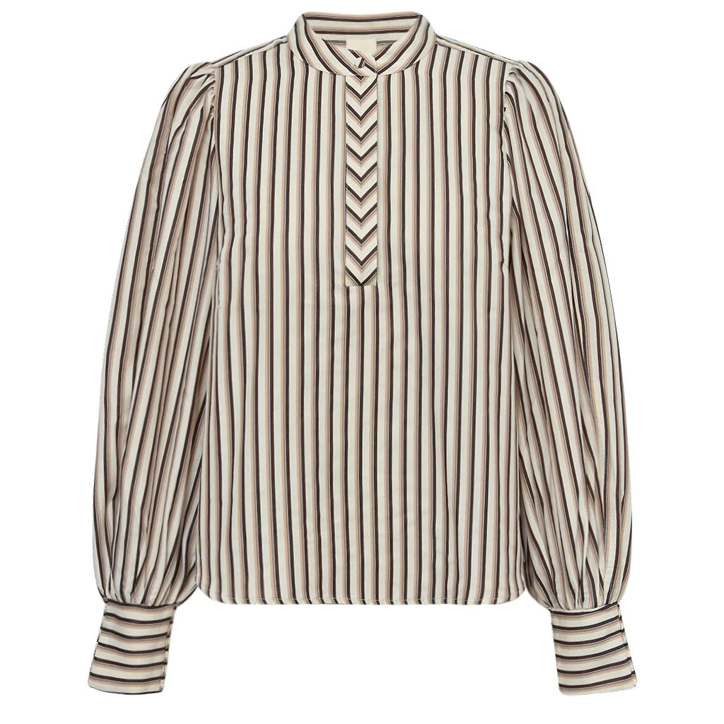 Feminin skjortebluse i herlig stripete design, med fin knappestolpe og lette puffermer, som gir et elegant og tidløst utseende. Legg bak i ryggen gir romslighet, og brede mansjetter med strikk på baksiden.