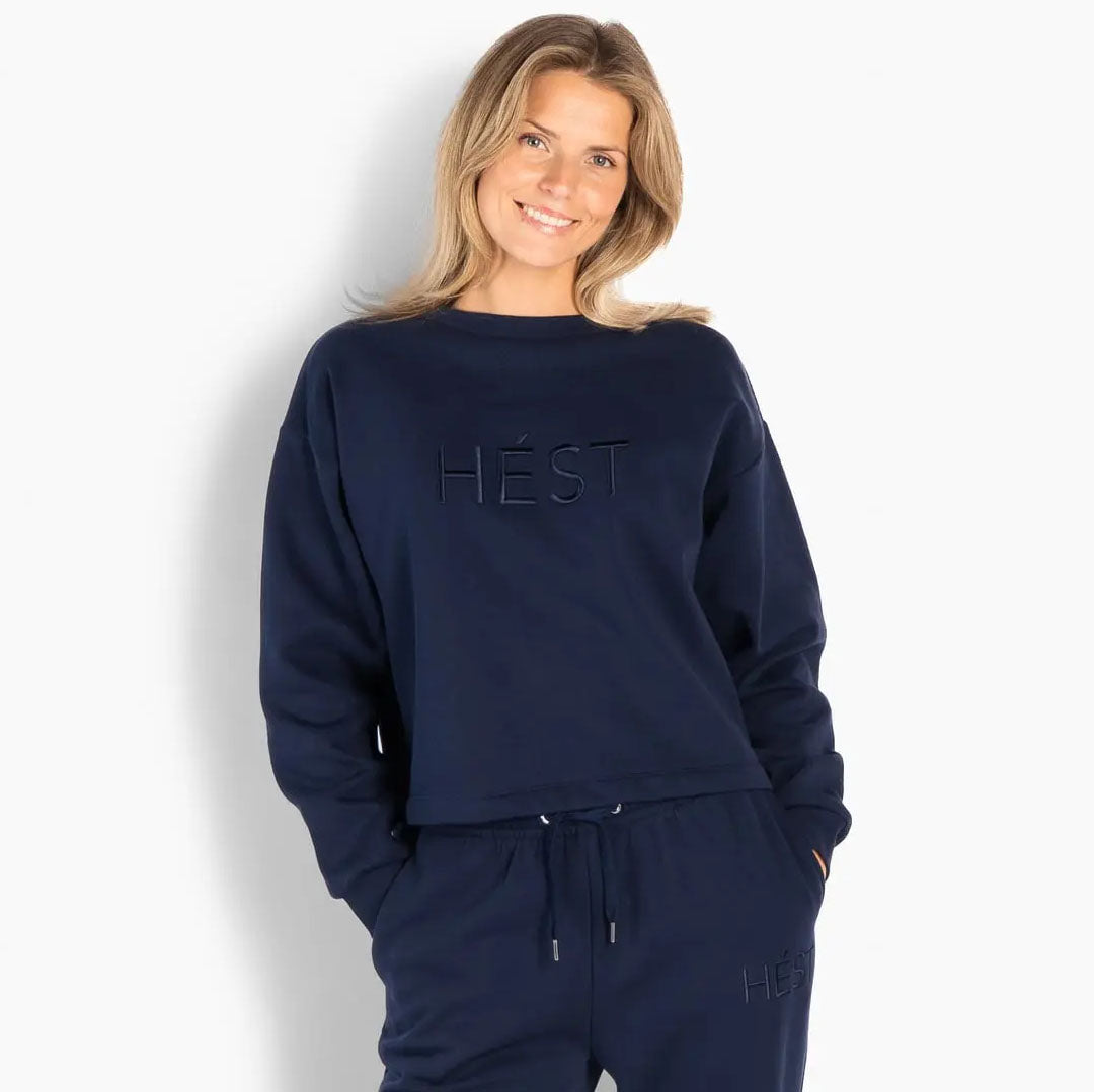 En moderne cropped sweatshirt med en avslappet, lett boxy silhuett. Laget i myk French Terry-bomull med senkede skuldre og ribbestrikkede kanter, og dekorert med en diskret ton-i-ton HÉST-logo preget på brystet og i nakken.
