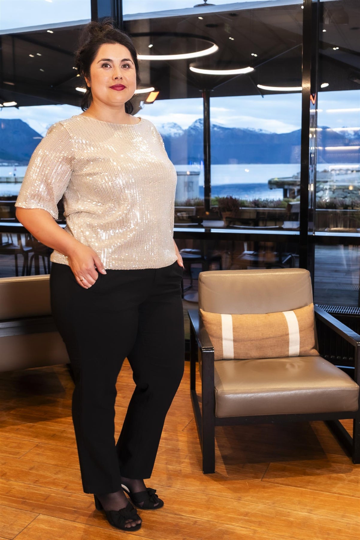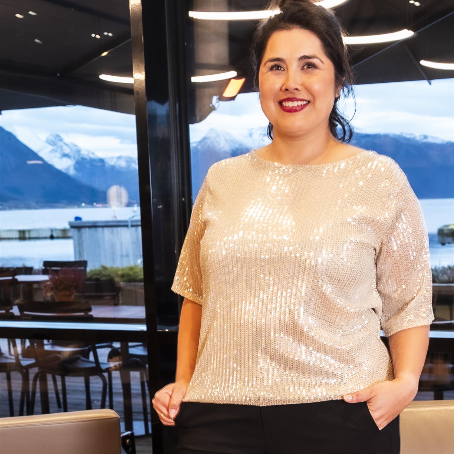 Stilfull mesh-topp med glitrende, sydde paljetter for et ekstra festlig uttrykk. Den har en rund hals og korte ermer, som gjør den perfekt til både festlige anledninger og hverdagsbruk.