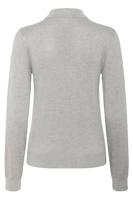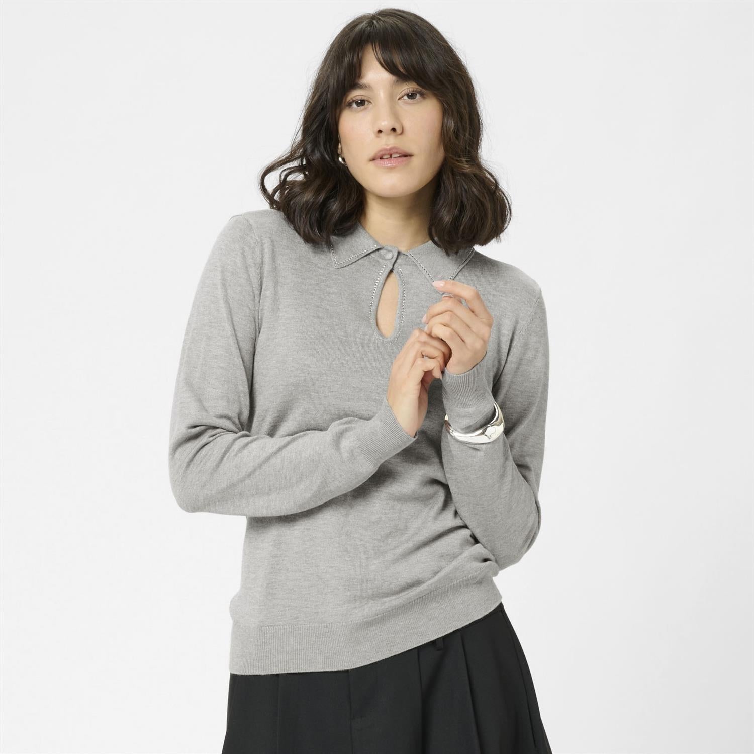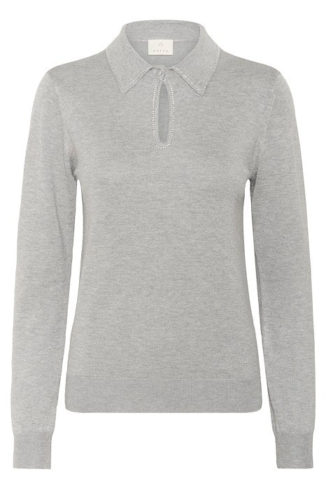 Stilig strikket genser med trendy polokrage, som er besatt av små strassperler, også i nøkkelhullsåpningen.