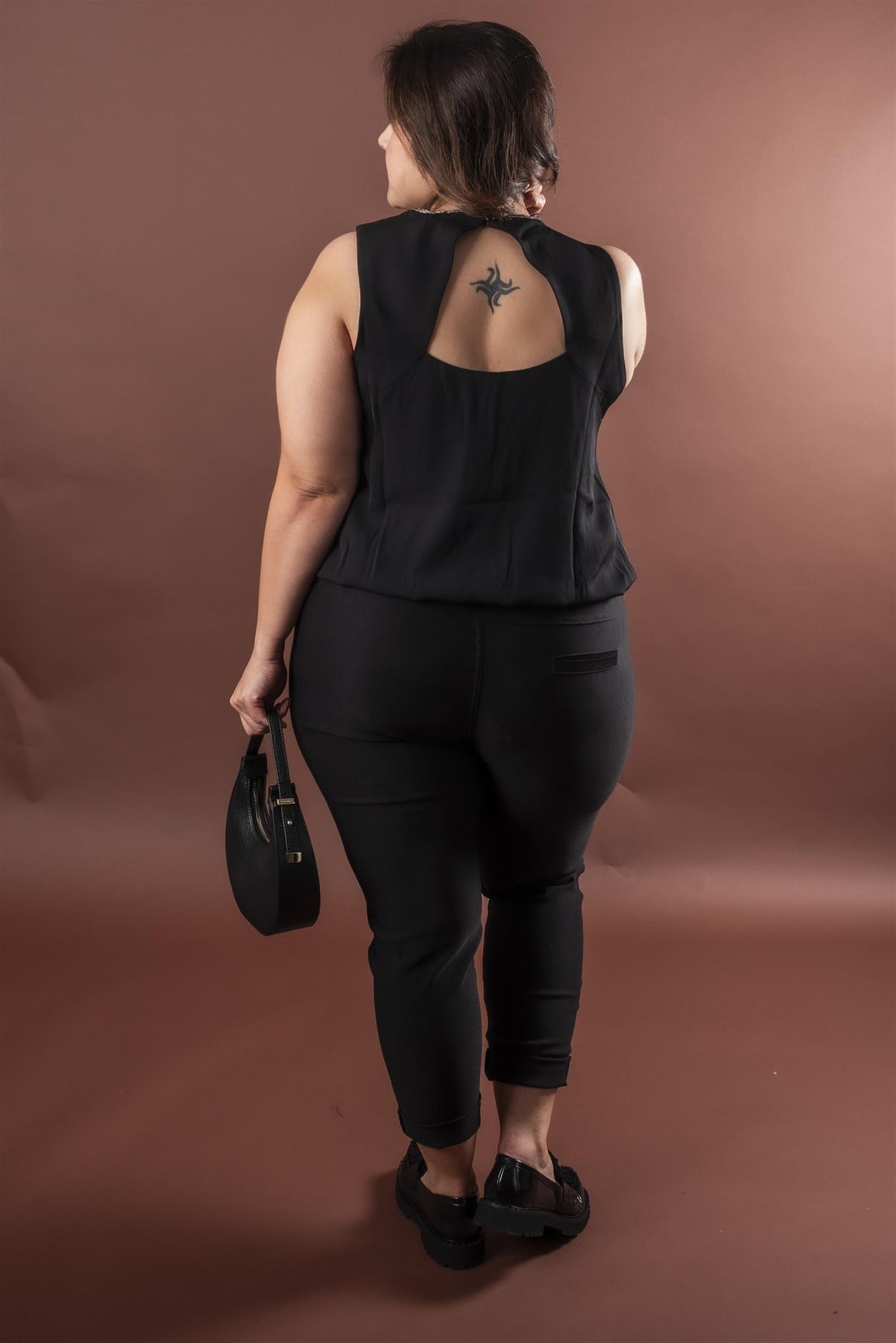 Ermeløs party-topp med romslig passform, avrundet hals med diskret metallisk kant og knapp bak i nøkkelhulls-åpning.