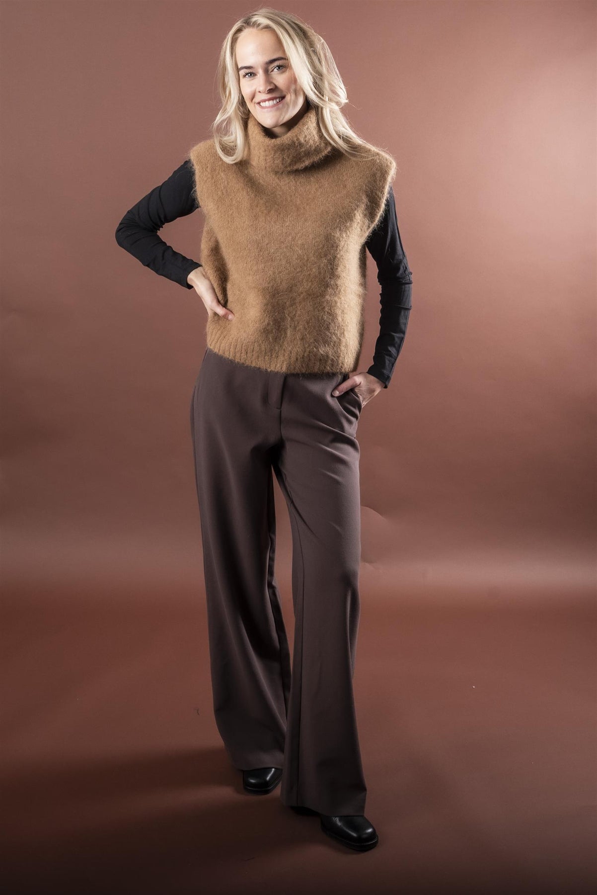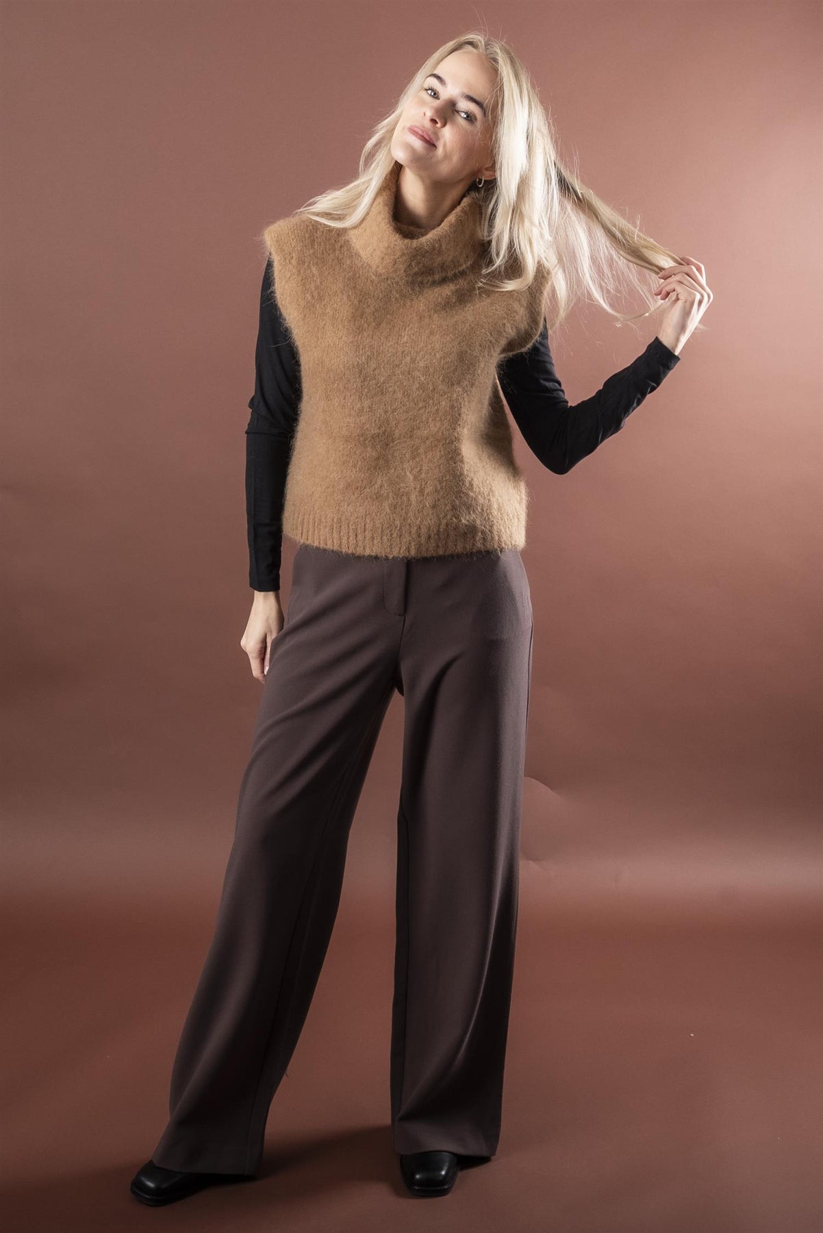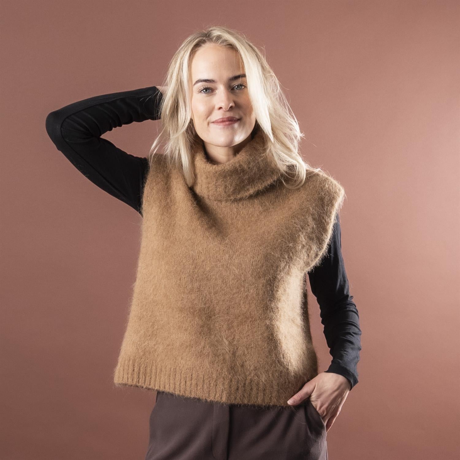 Stilig vest i rett modell, uten arm med høy hals. Den er laget i en myk, fluffy alpakkamix.
