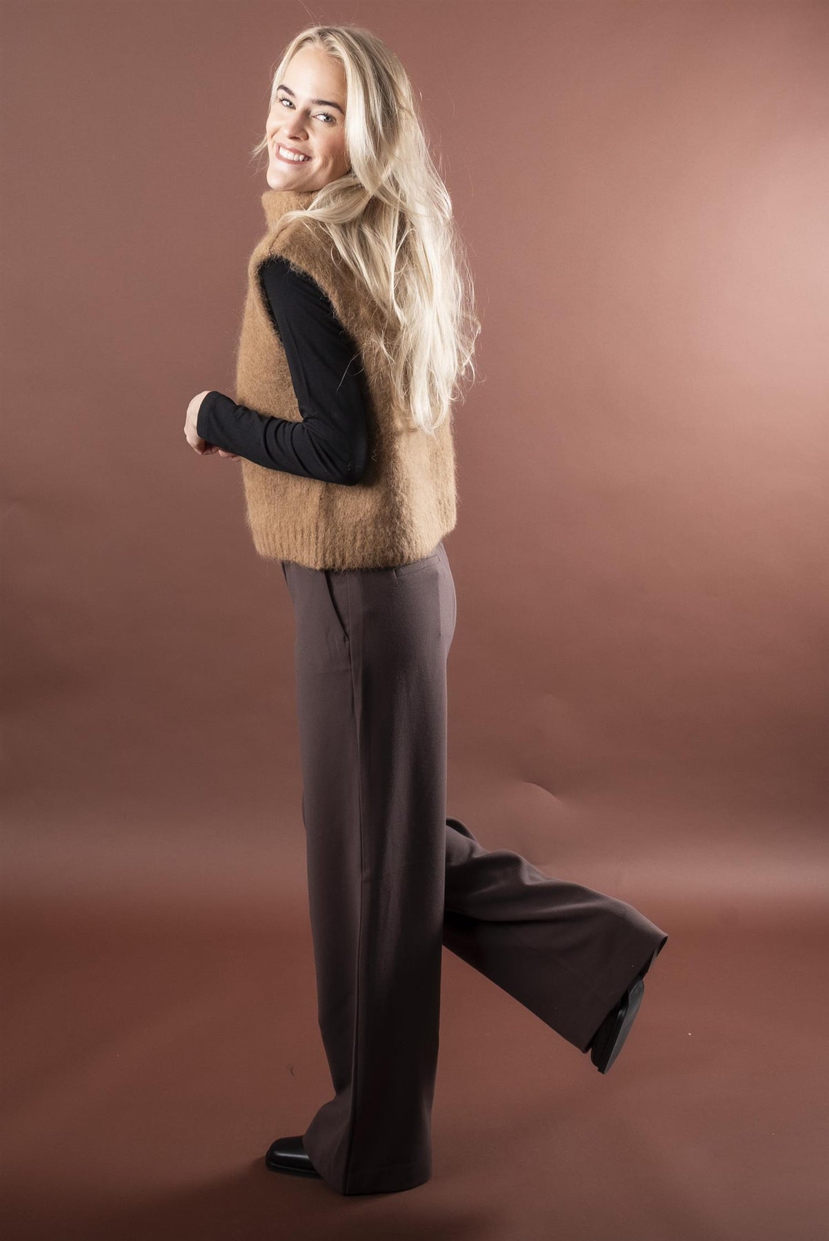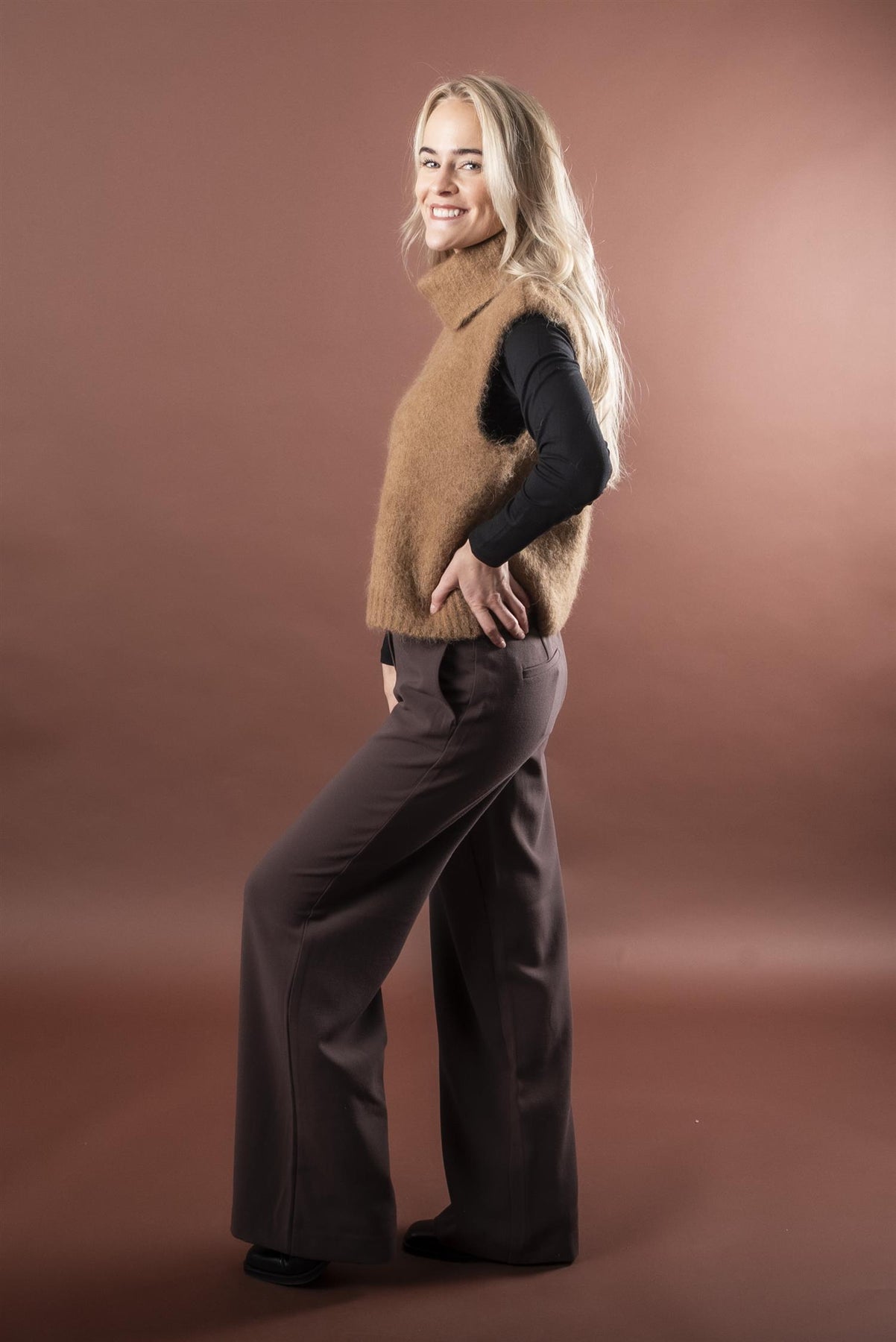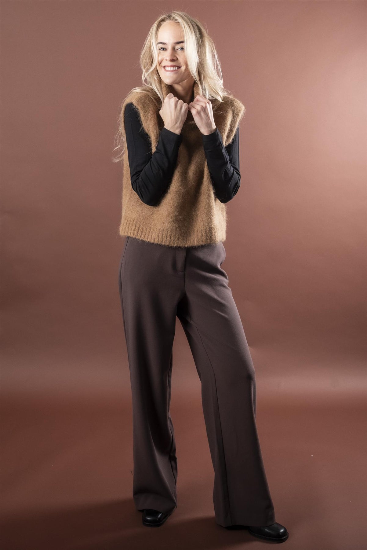Stilig vest i rett modell, uten arm med høy hals. Den er laget i en myk, fluffy alpakkamix.