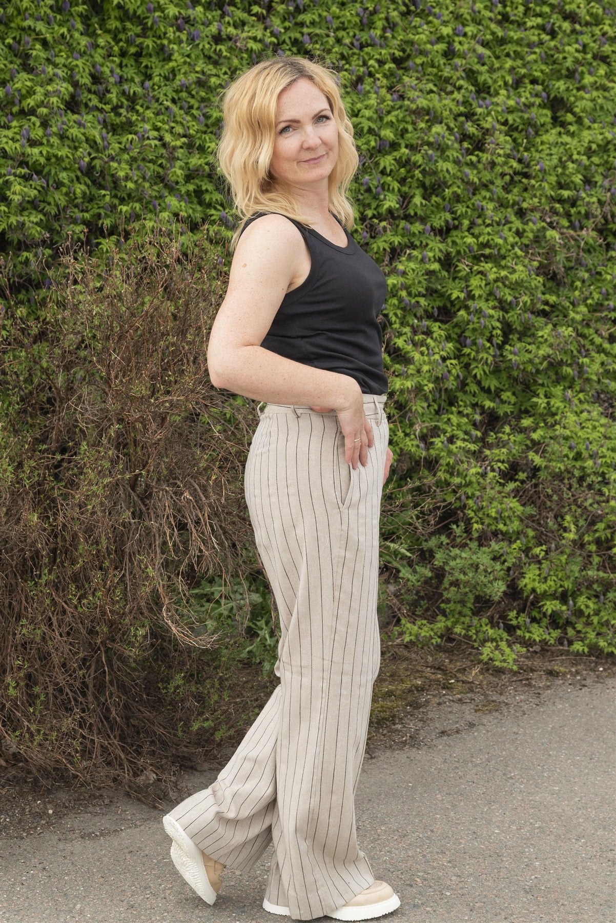 Vår egen modell er 164 cm. og har str. S. Buksen heter Linen Pin Pant fra co´couture.