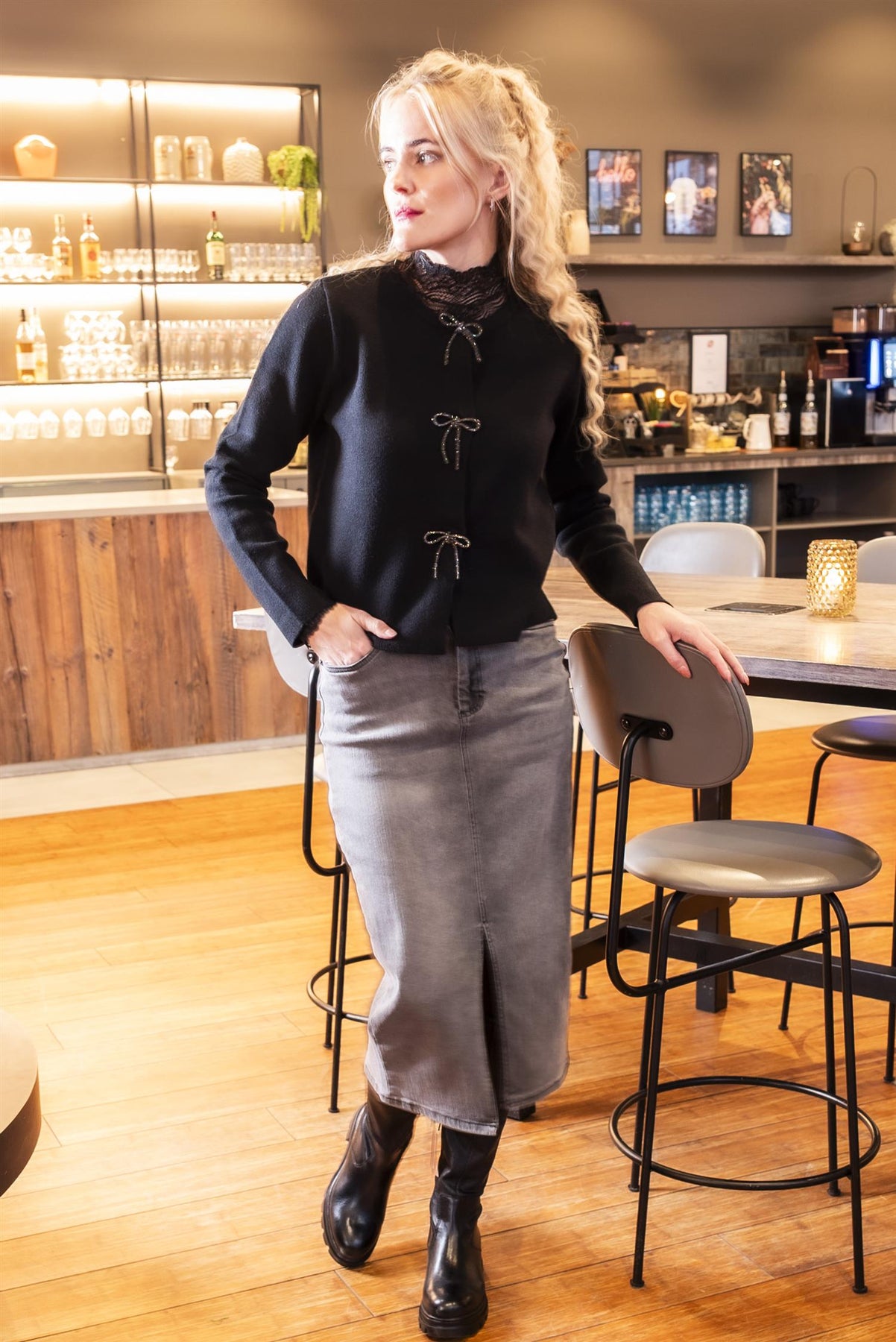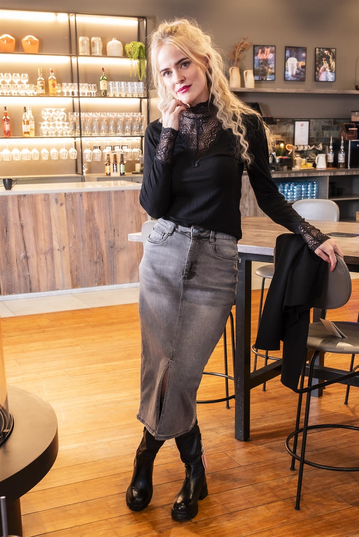 Trendy denimskjørt med splitt i front, 5 lommers modell med gylf og har det riktige snittet.