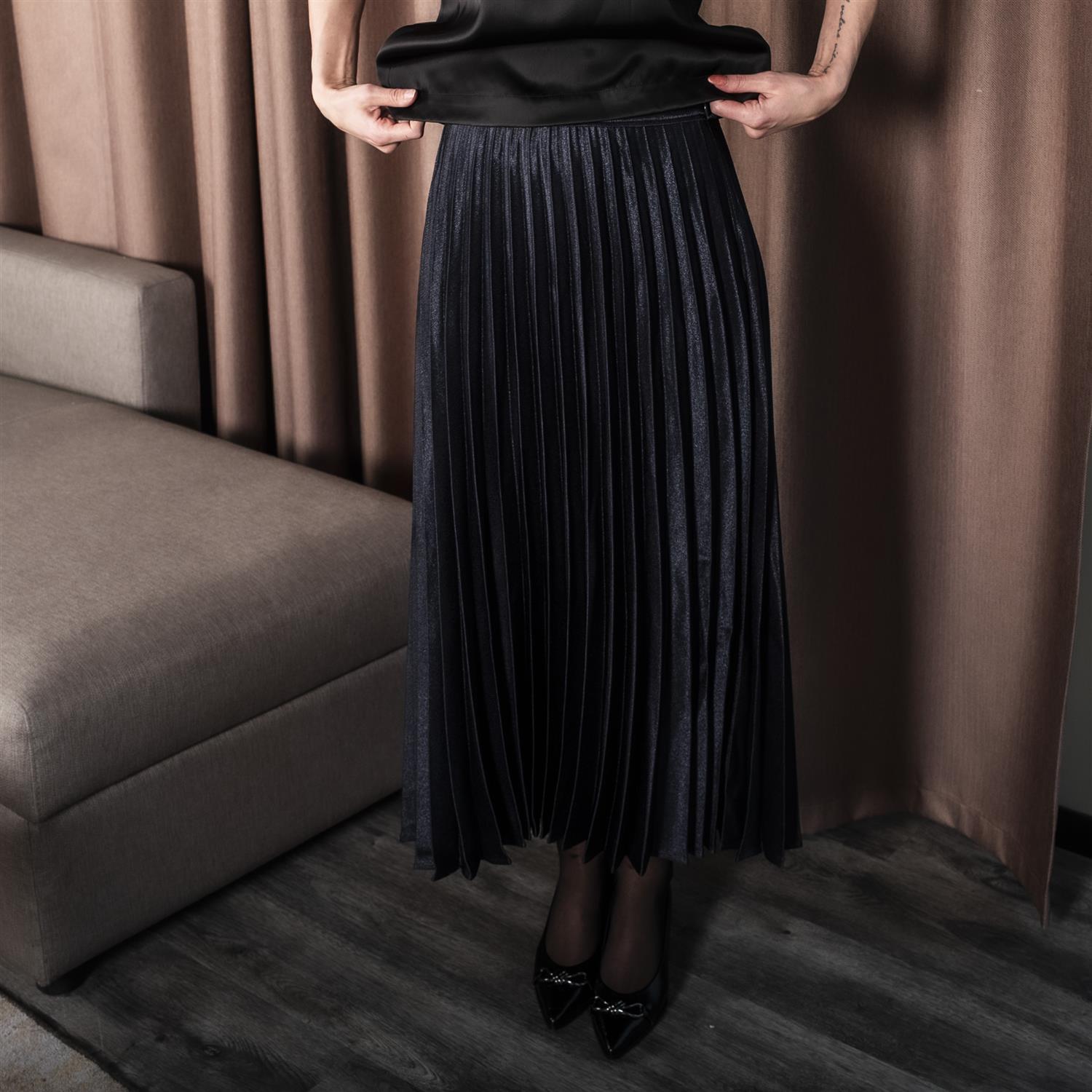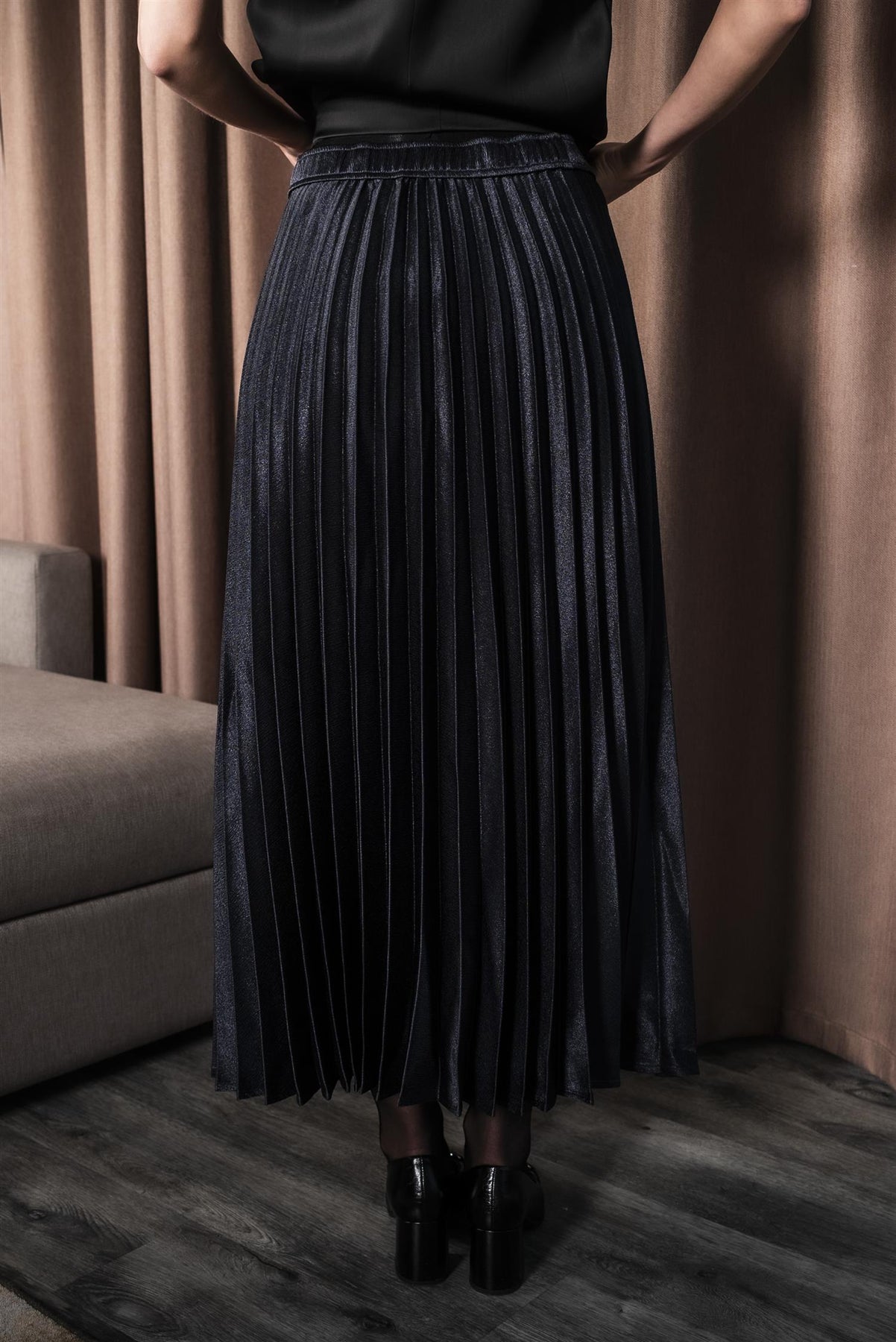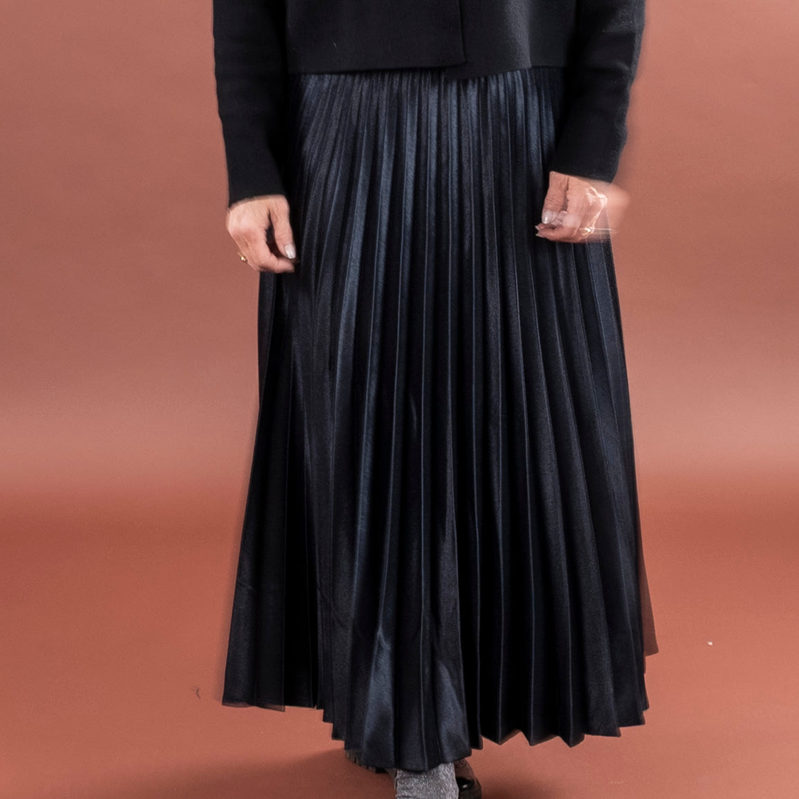 Tidløs eleganse møter komfort i dette plisserte midiskjørtet i dyp marineblå nyanse. Vakker glans og et tungt, flytende fall som gir et raffinert uttrykk.