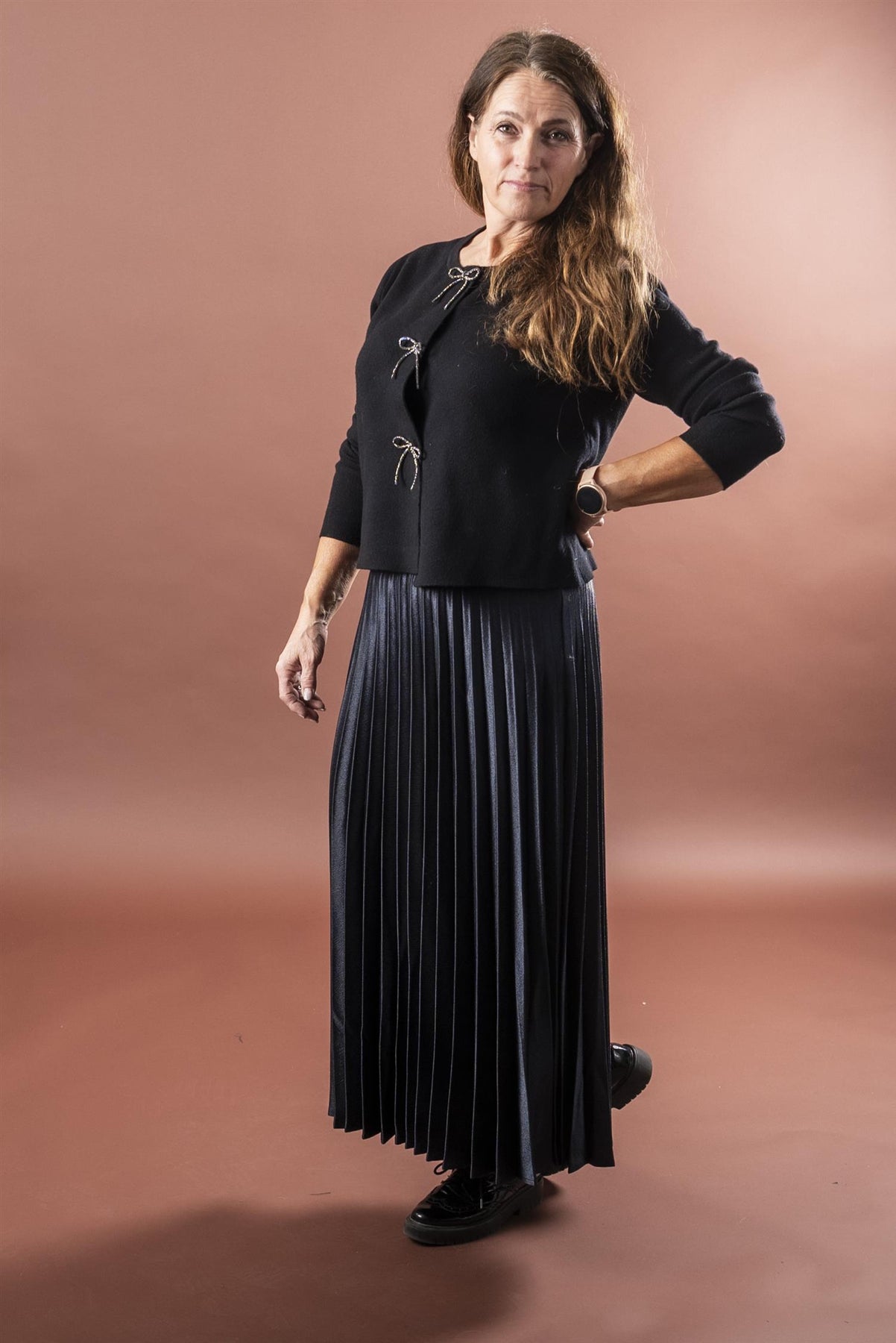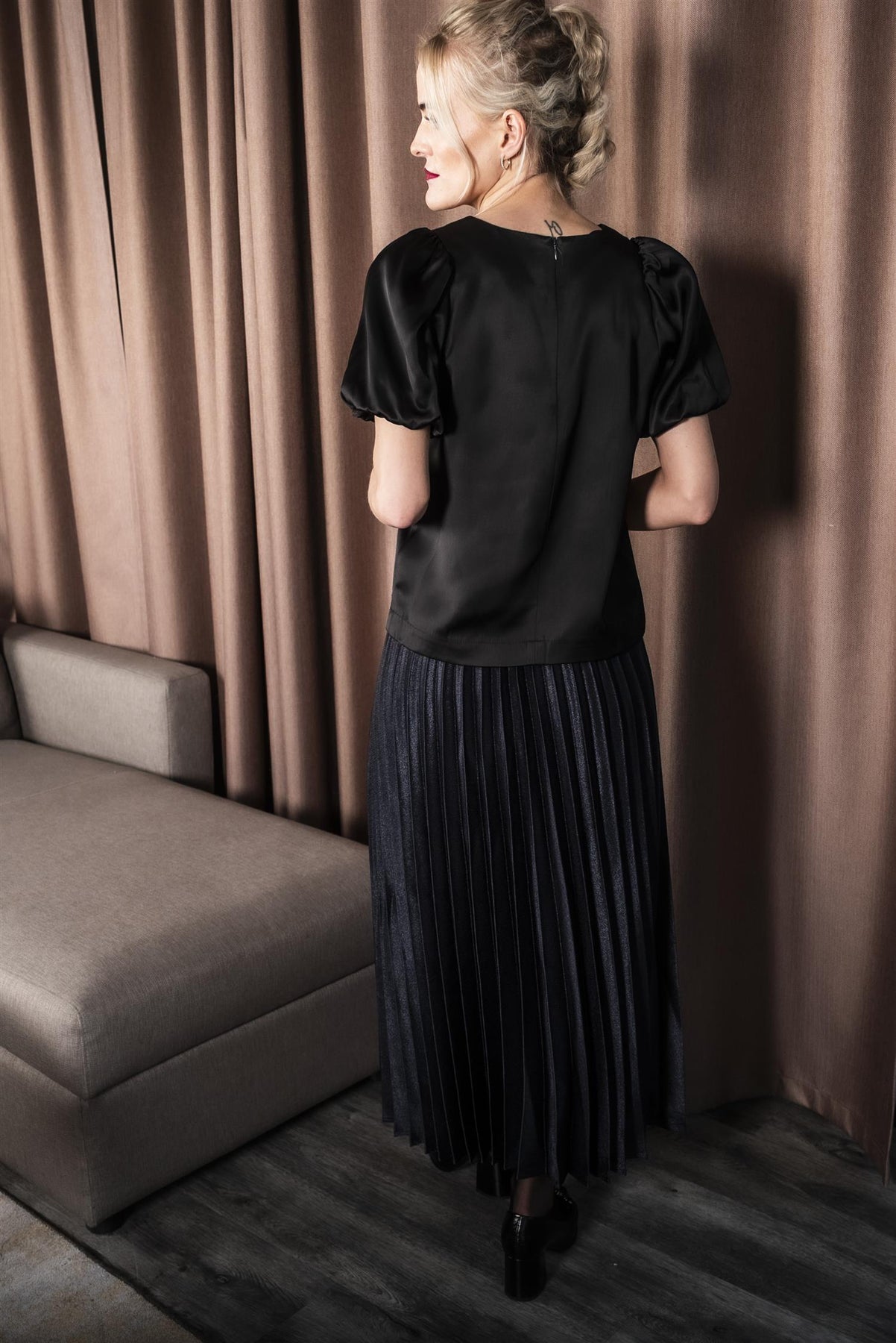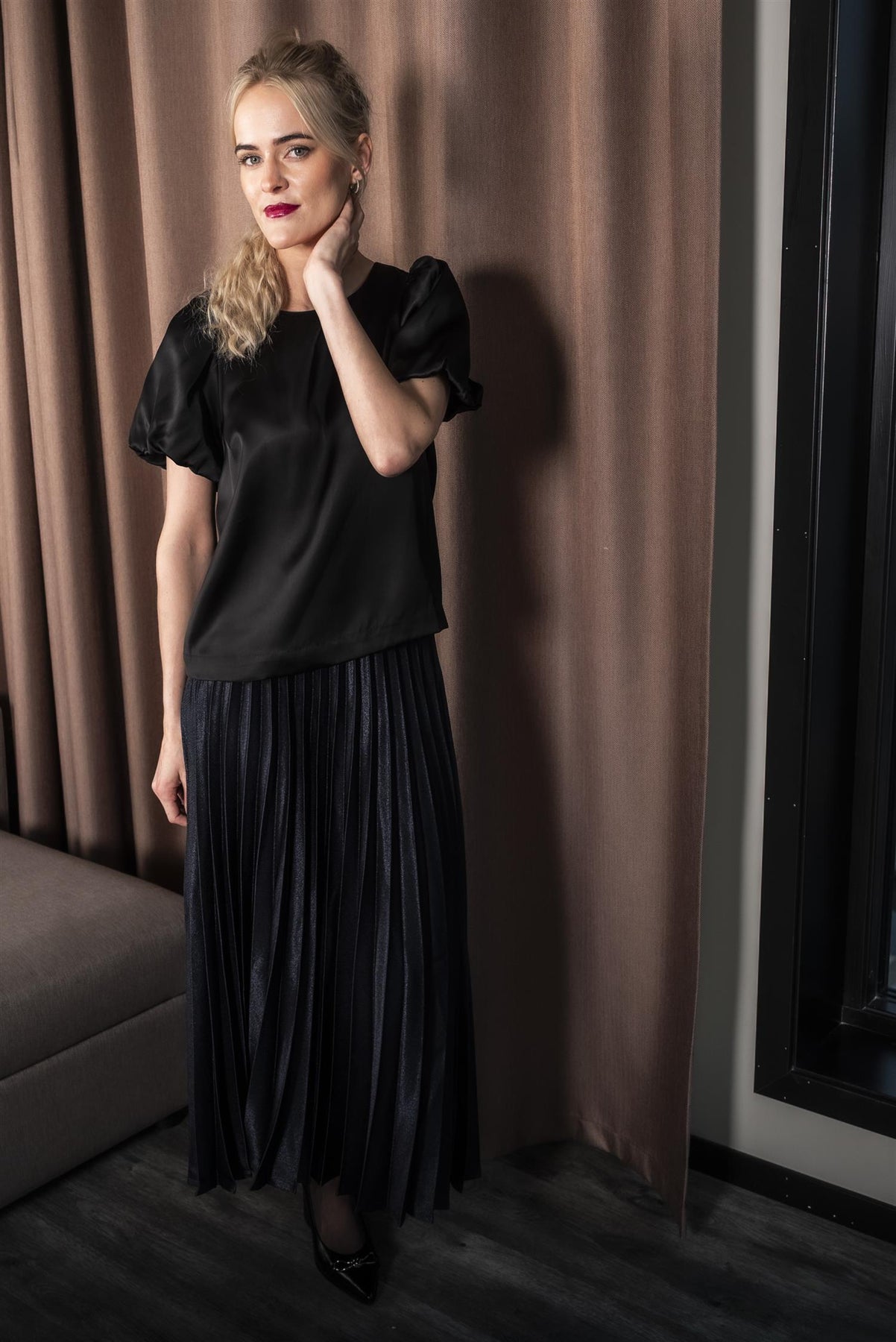 Tidløs eleganse møter komfort i dette plisserte midiskjørtet i dyp marineblå nyanse. Vakker glans og et tungt, flytende fall som gir et raffinert uttrykk.