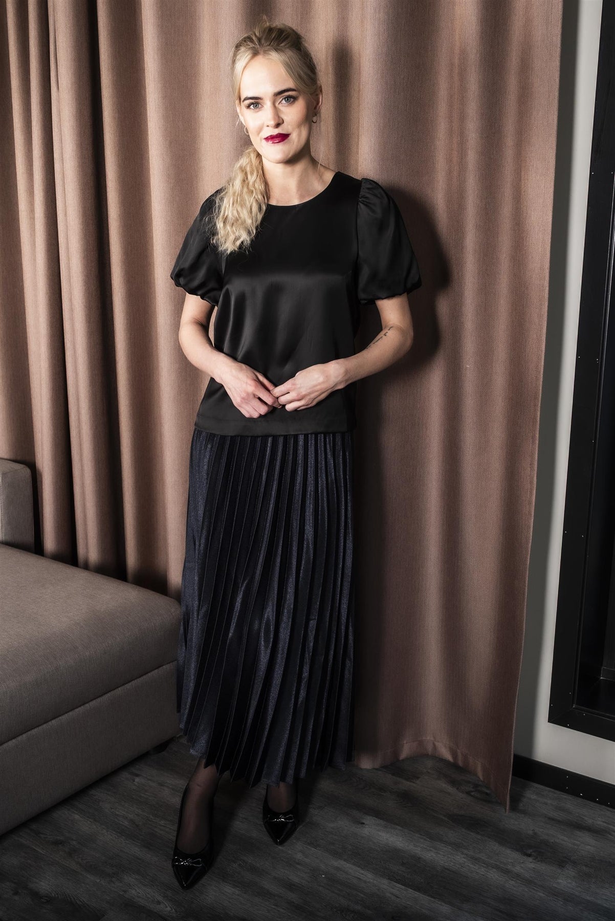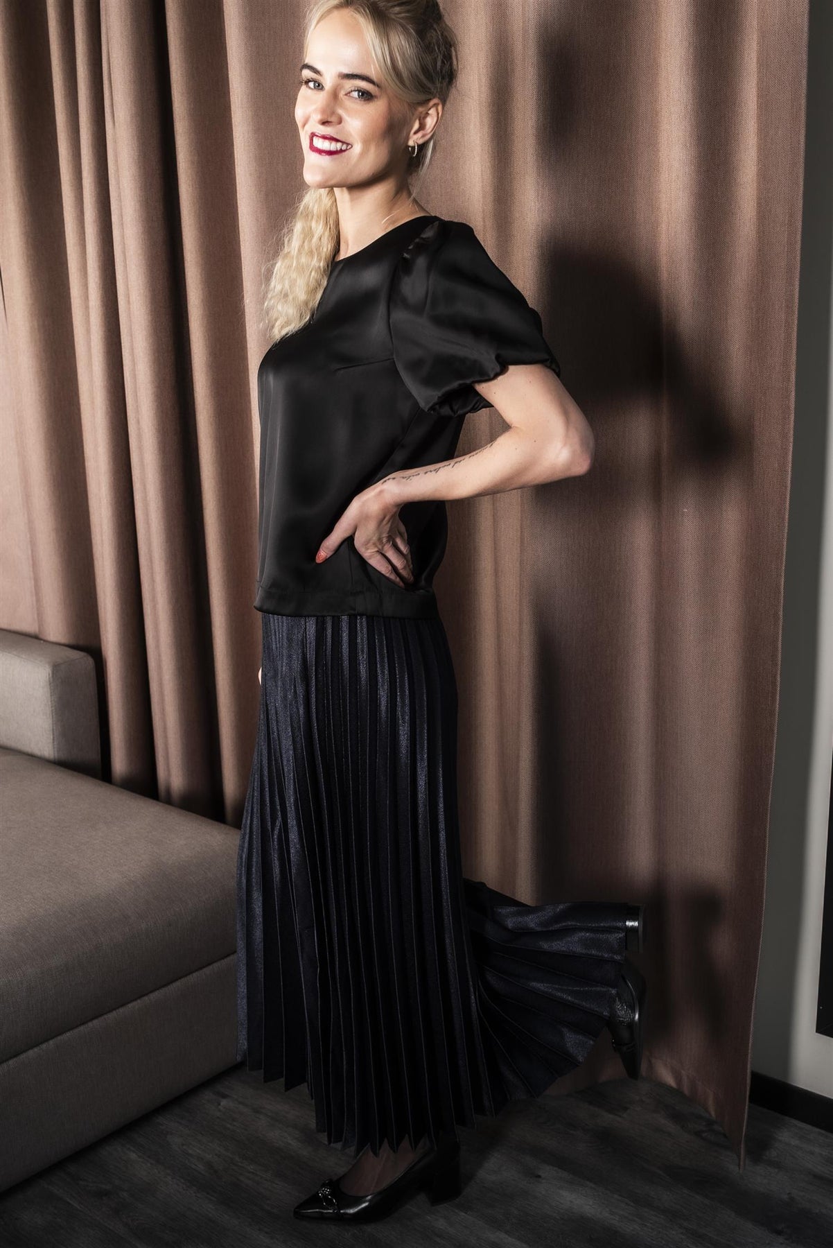 Vår egen modell er 169 og har str. 34. Blusen er Uria fra samme leverandør.