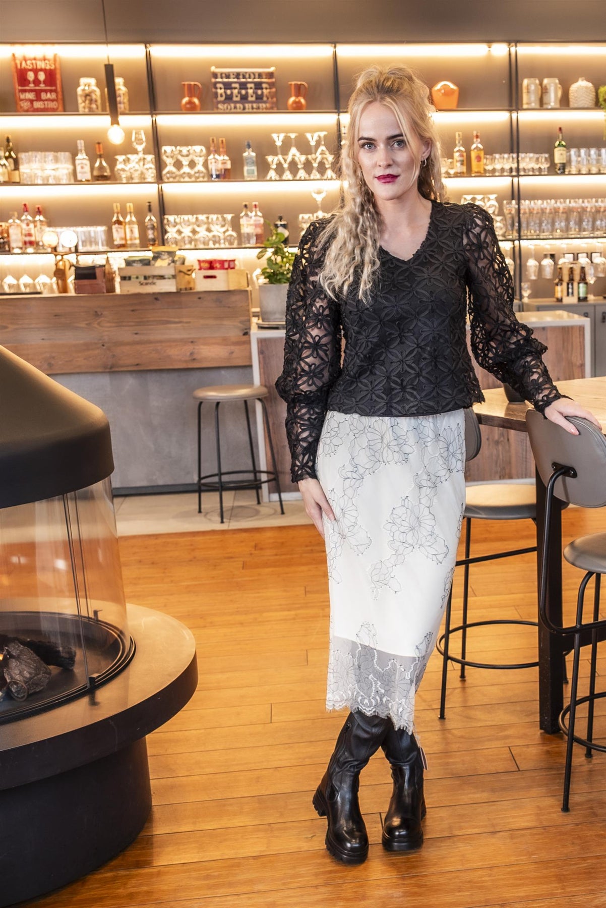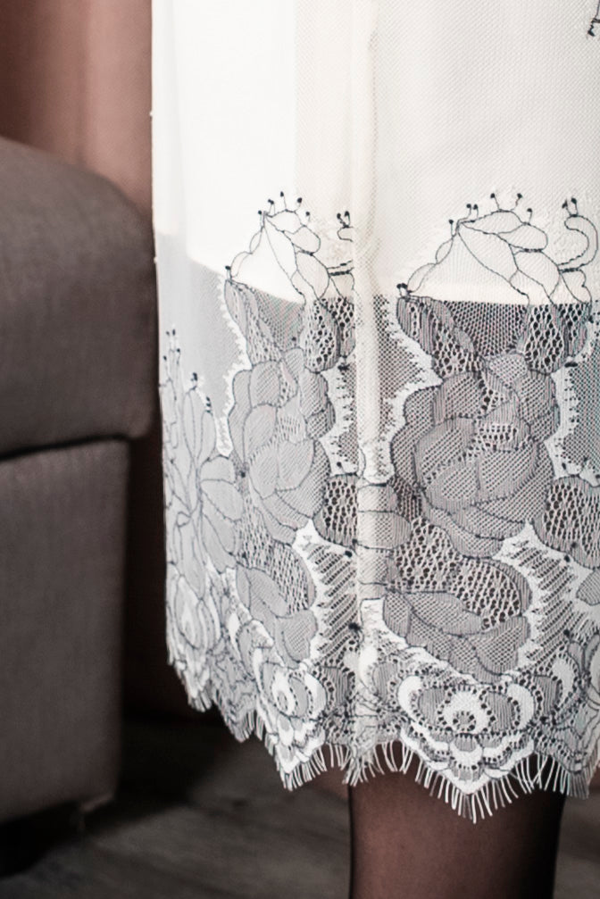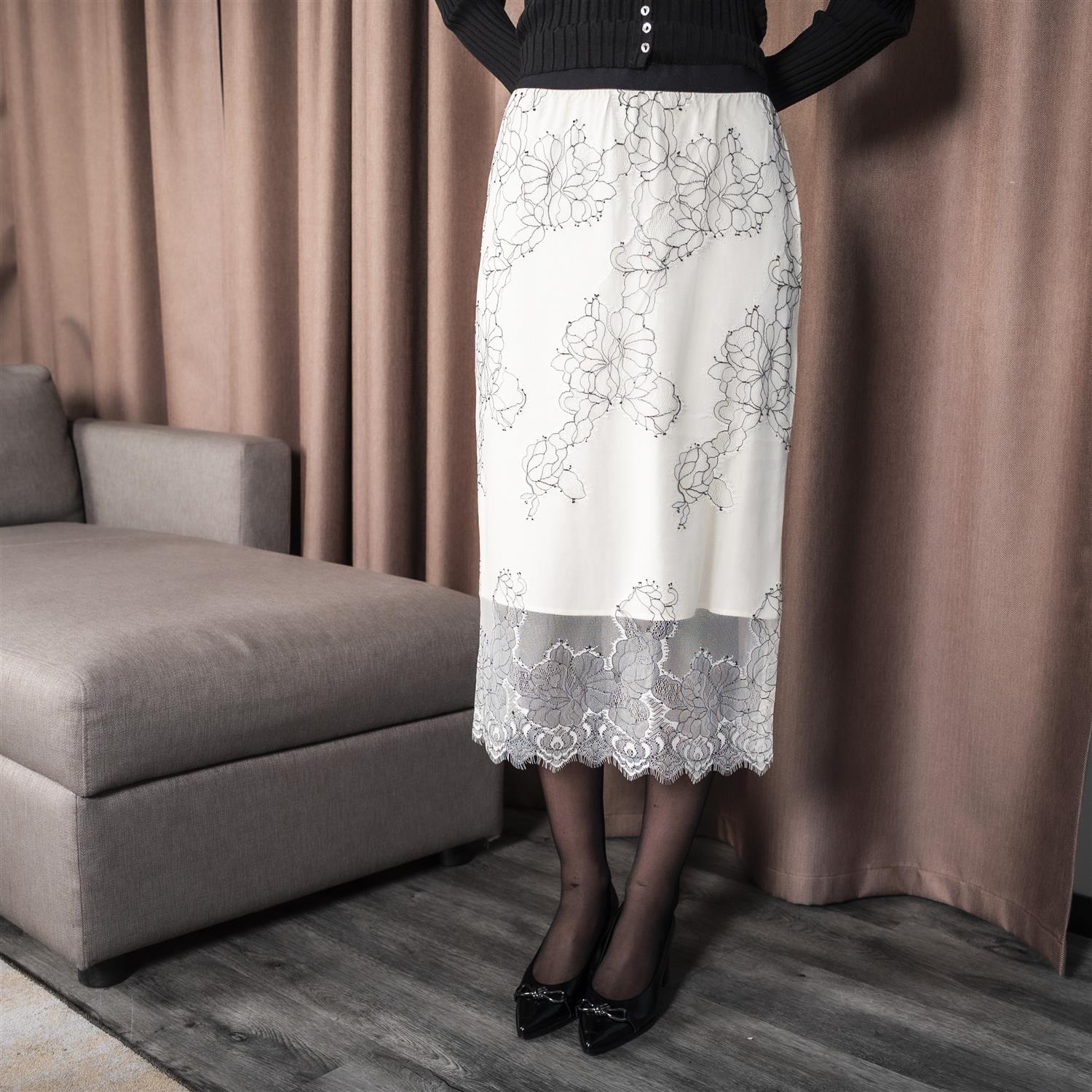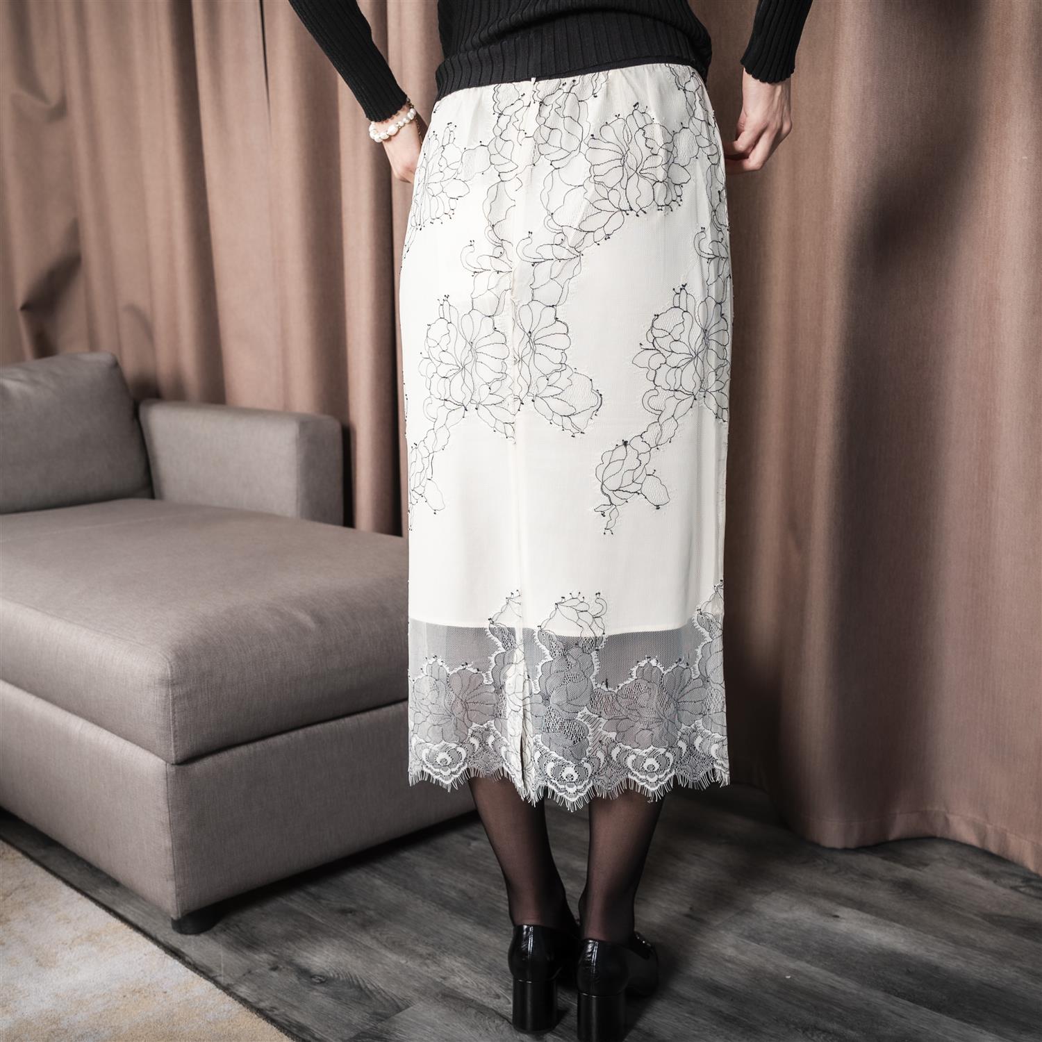 Delikat og delvis gjennomsiktig blondeskjørt i trendy midilengde. Laget i lett, gjennomsiktig blonde med kontrastsøm. Med elastisk linning i kontrastfarget farge og skjult glidelåslukking bak. Kamskjellformet kant nederst.