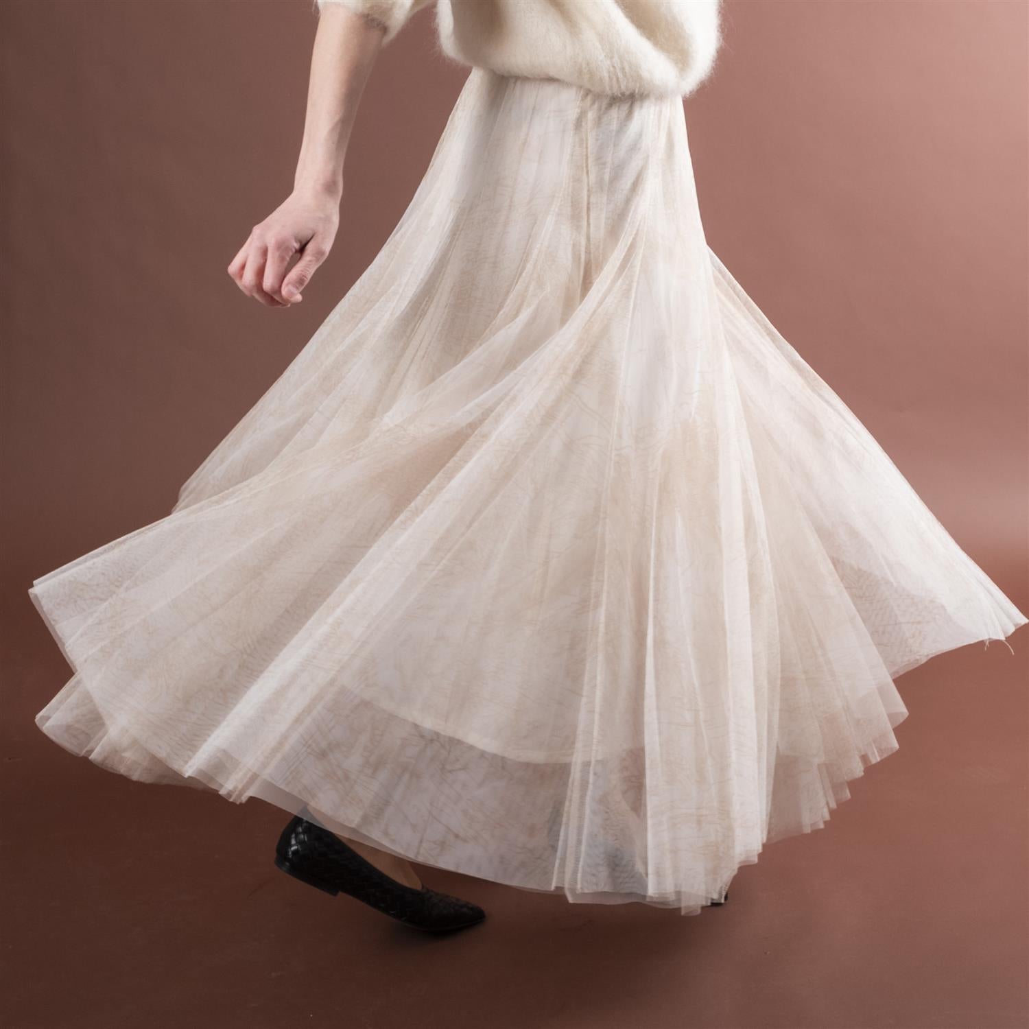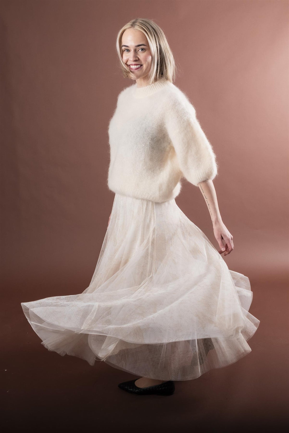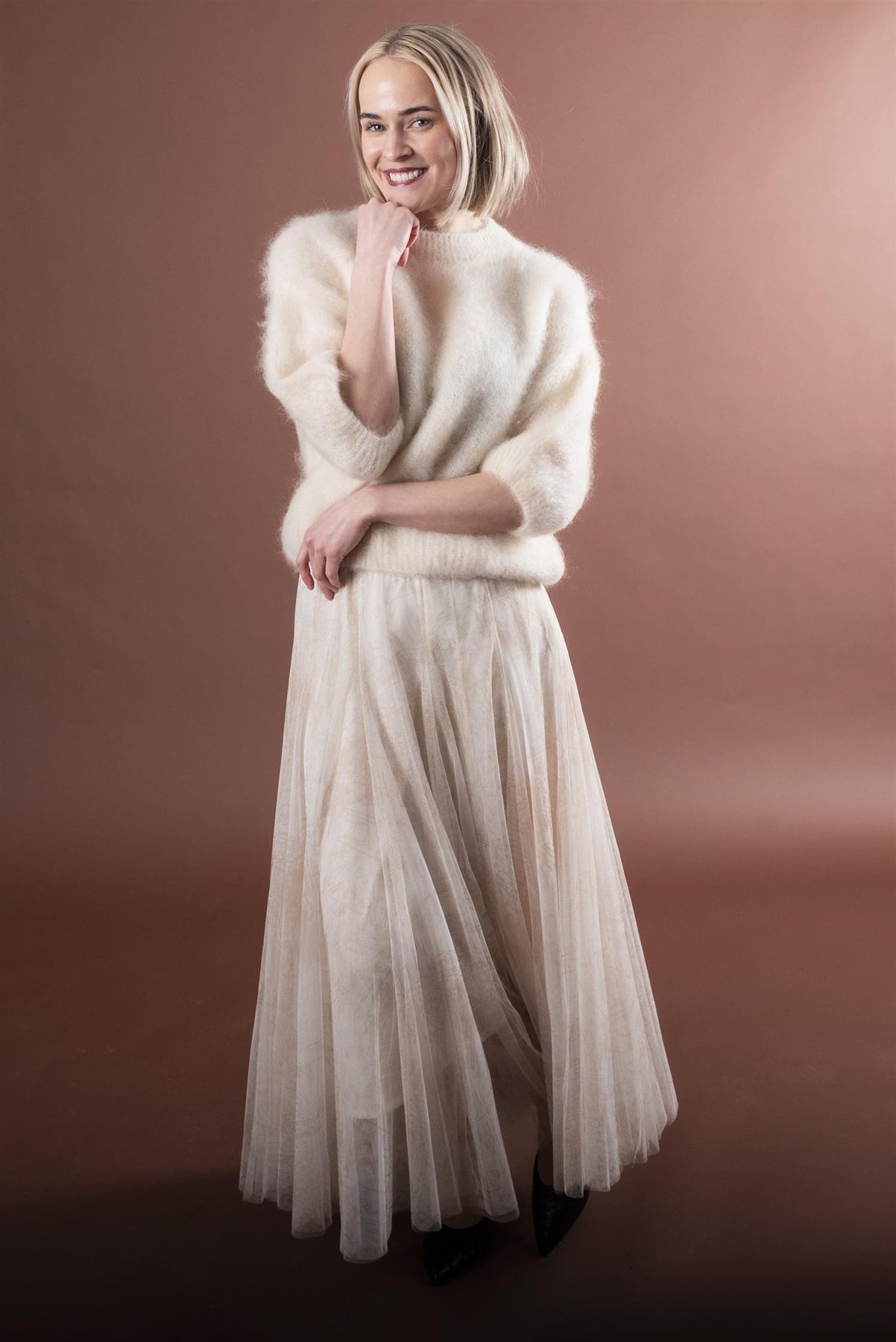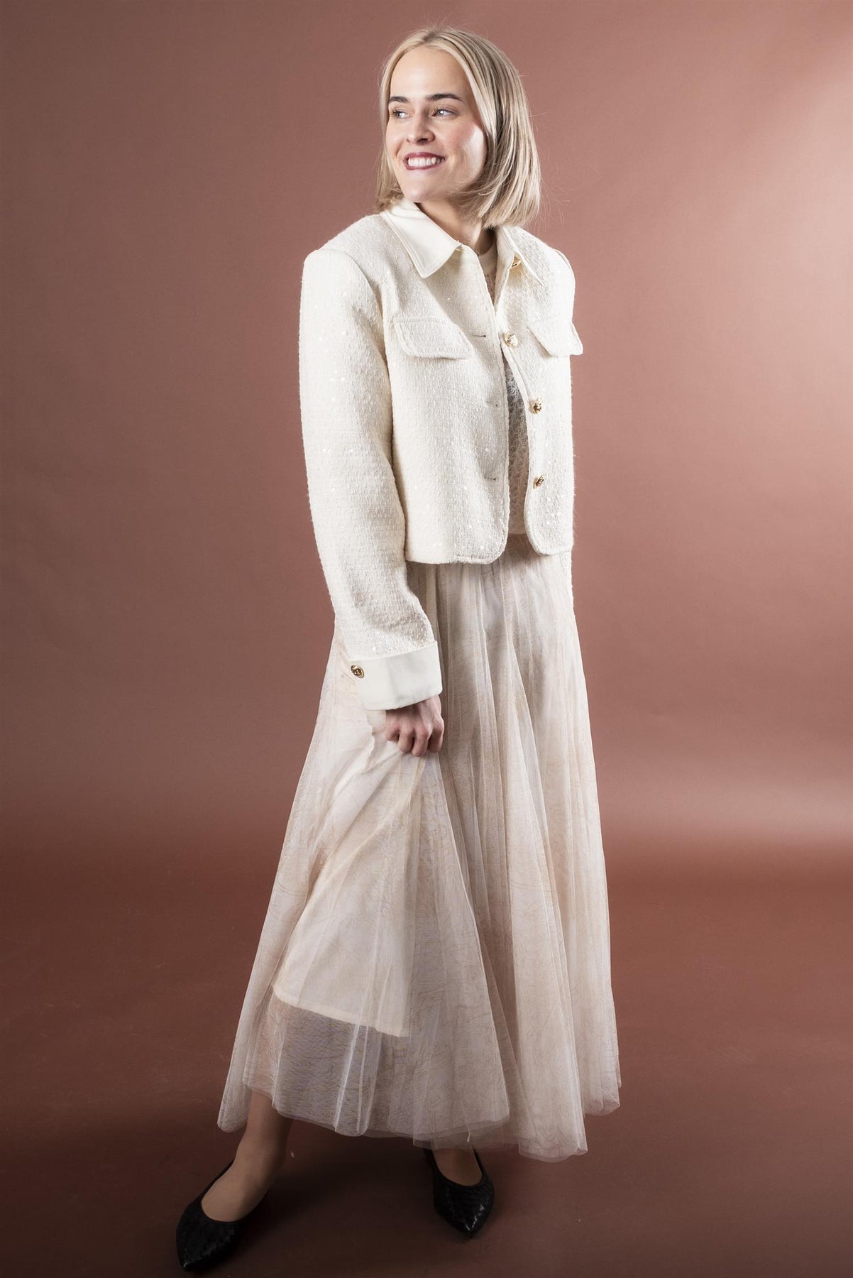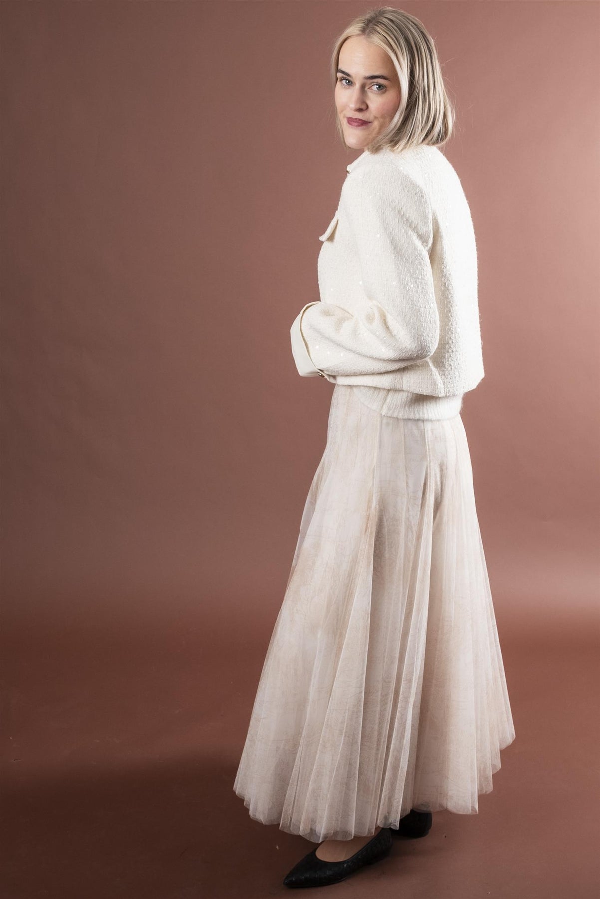 Et drømmende tyllskjørt som tilfører et feminint og romantisk uttrykk til garderoben. Skjørtet består av flere lag med lett og luftig tyll, noe som gir en vakker, svevende effekt. Den elastiske midjen sikrer komfort og en fleksibel passform, perfekt både til festlige anledninger og en sofistikert hverdagslook.