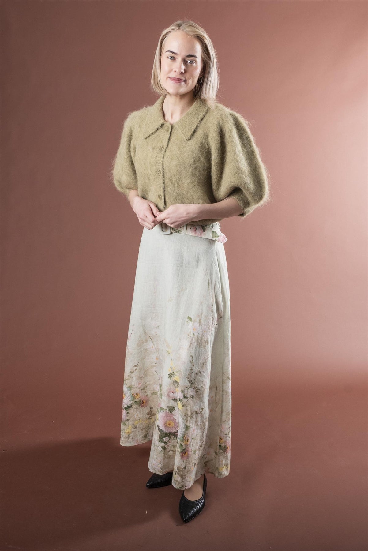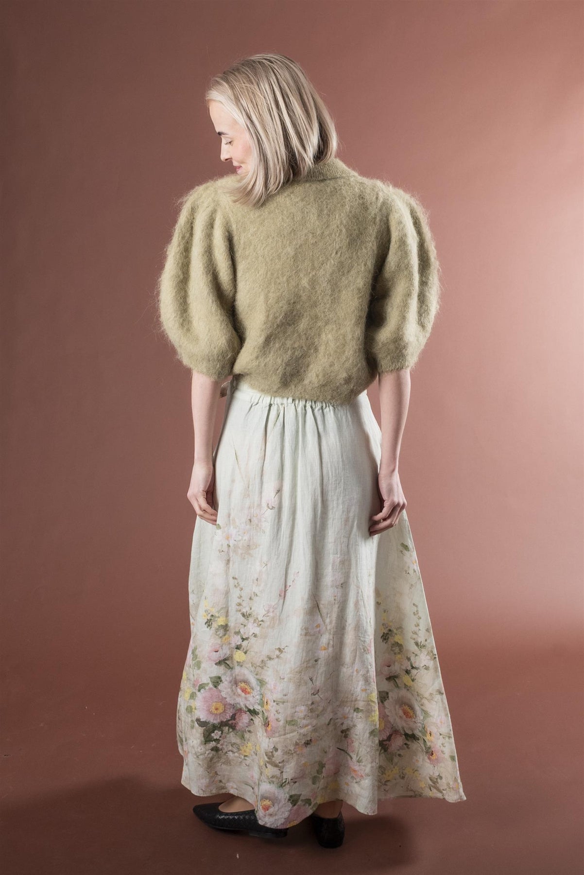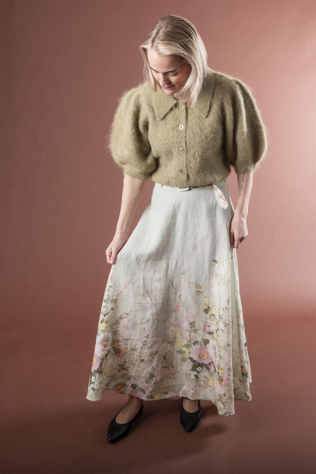 Skjørtet har en maxilengde og en flagrende A-linjeformet silhuett i lekker linkvalitet.
