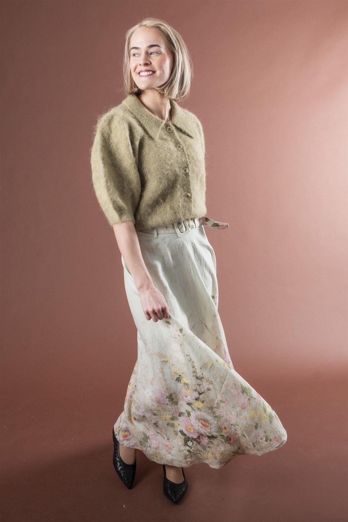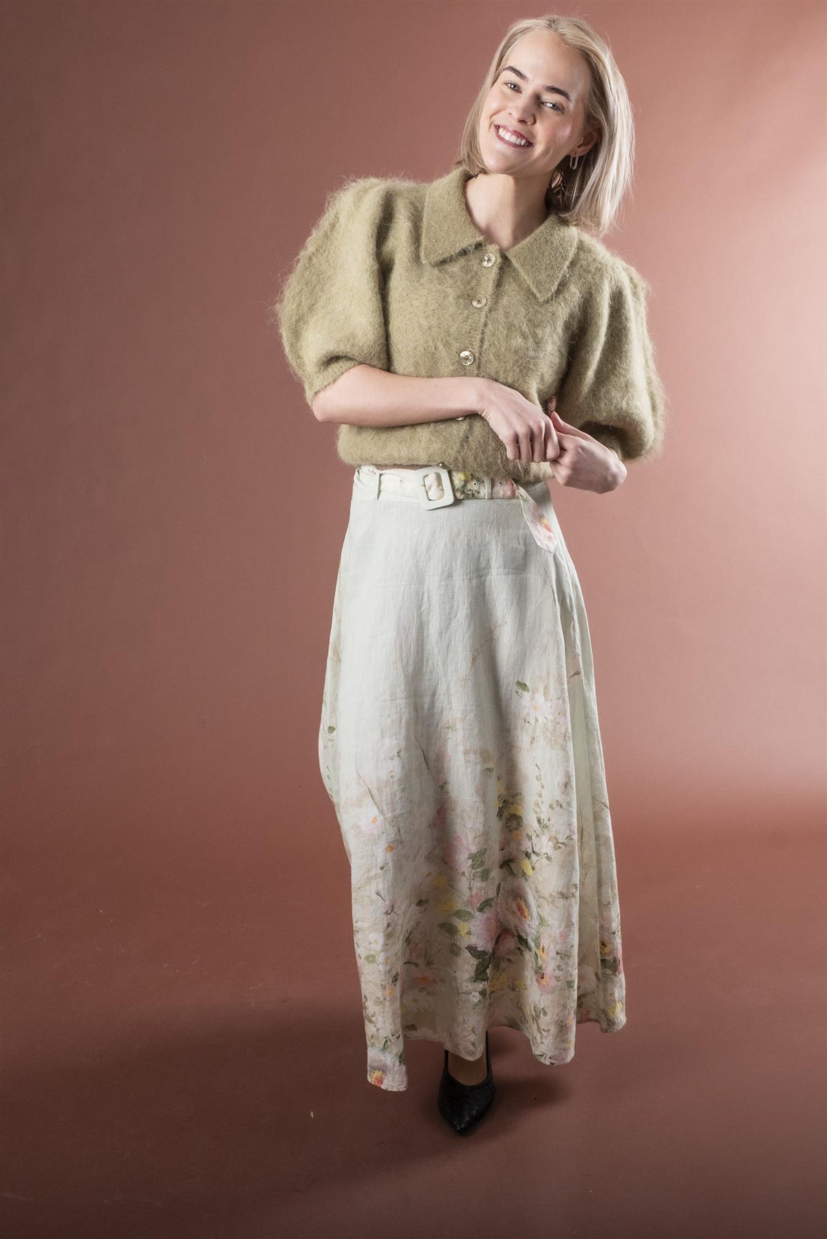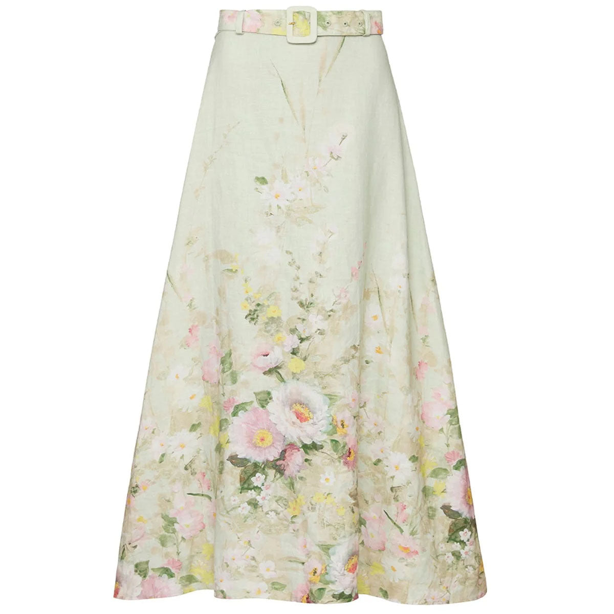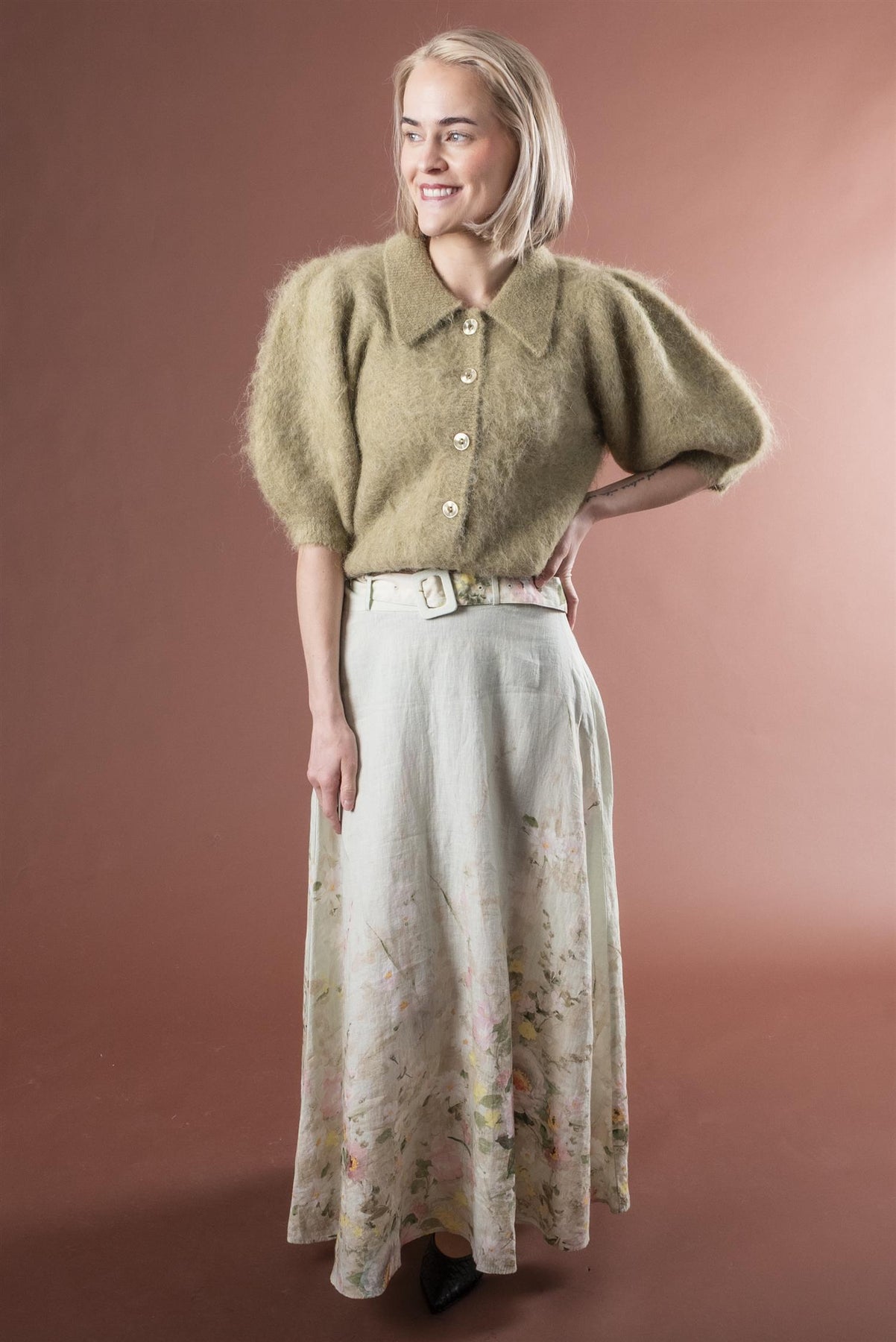 Skjørtet har en maxilengde og en flagrende A-linjeformet silhuett i lekker linkvalitet.