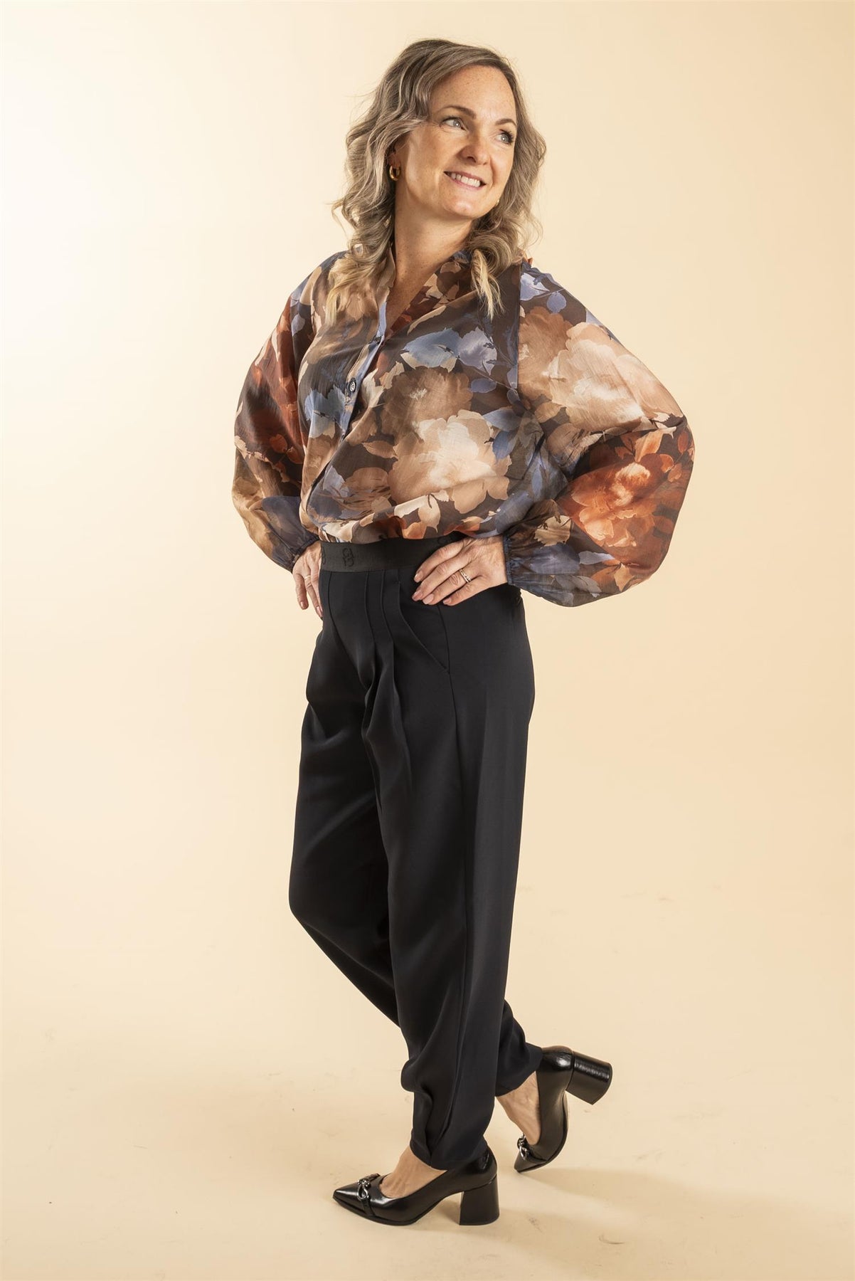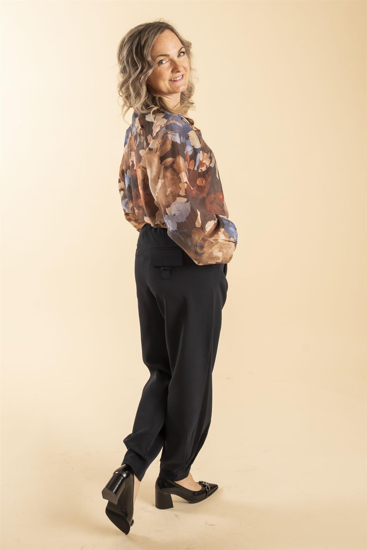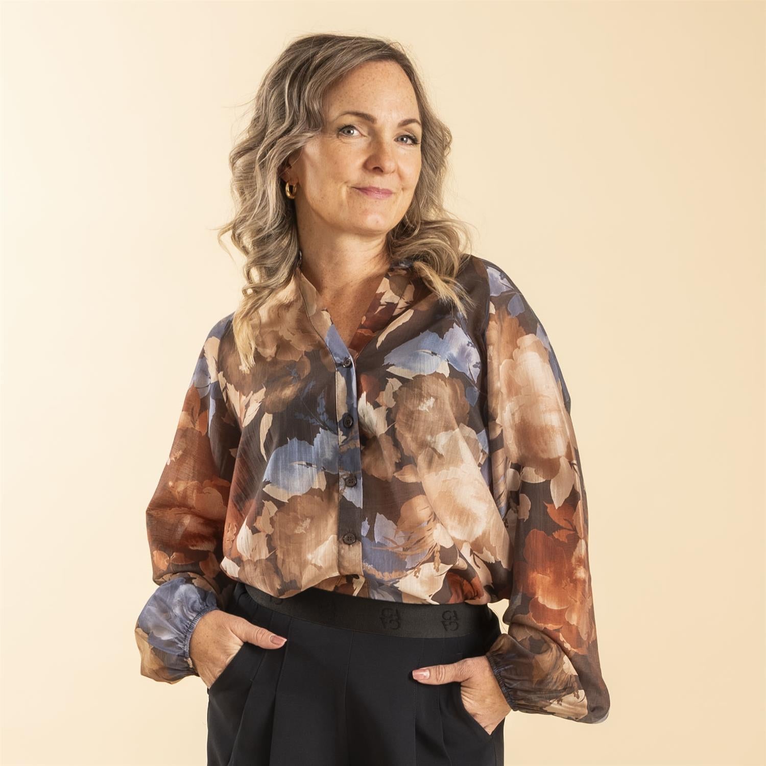 Vakker bluse i delikat viscose med helt nydelig print og fargekombinasjon, som er like fin til jeans som brunt og sand.