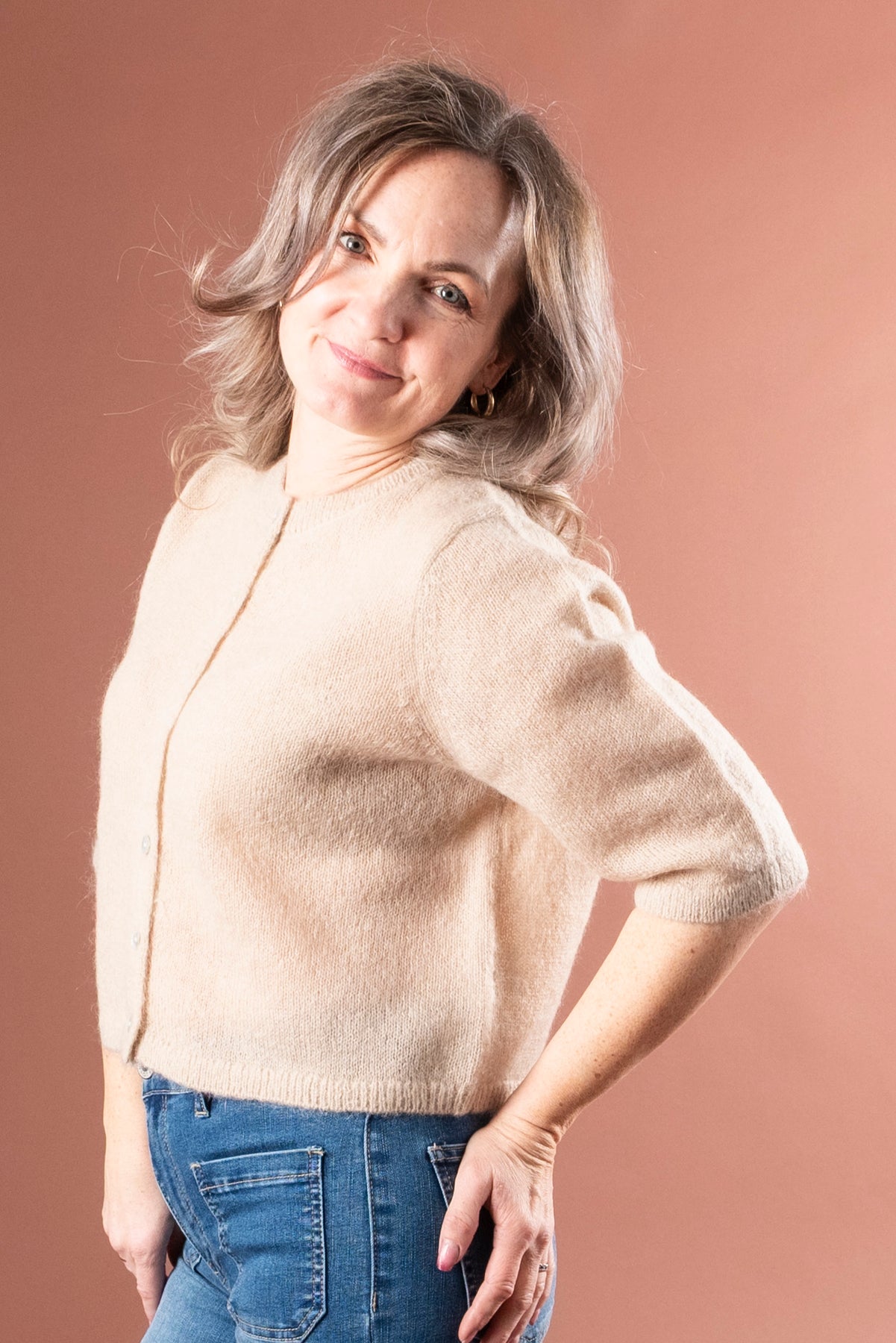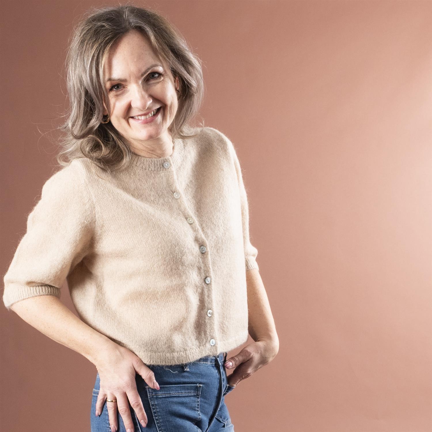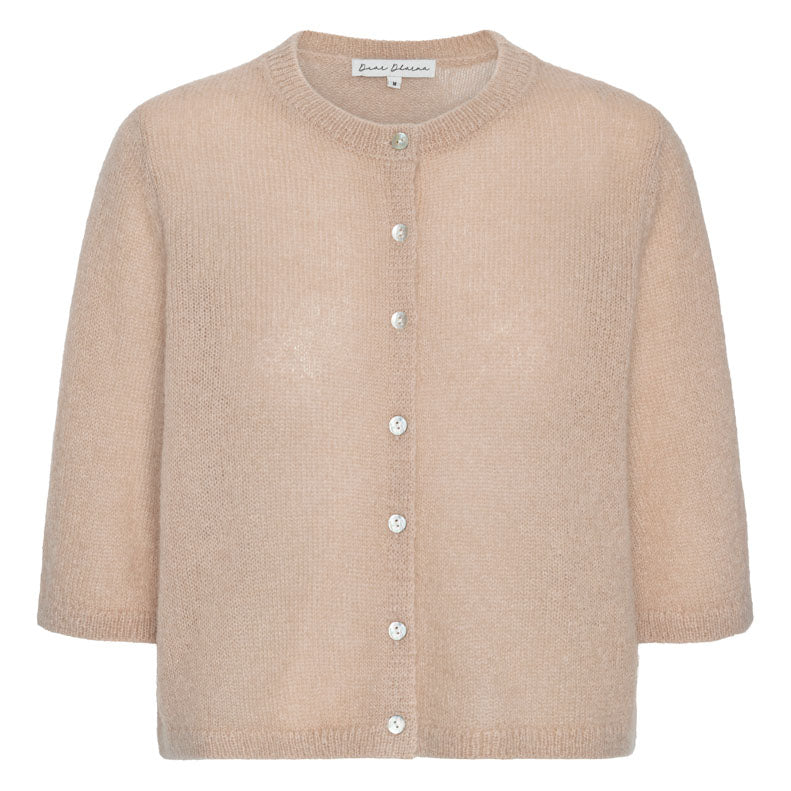 Delikat cardigan med halv erm og kort lengde i lekker beige farge. Designet med rund hals og knappestople i front. En løs og romslig cardigan som er like fin over en enkel singlet som alene.