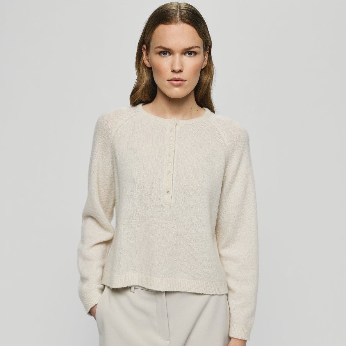 Pen og stilig strikket genser med rund hals og knappelukking foran.