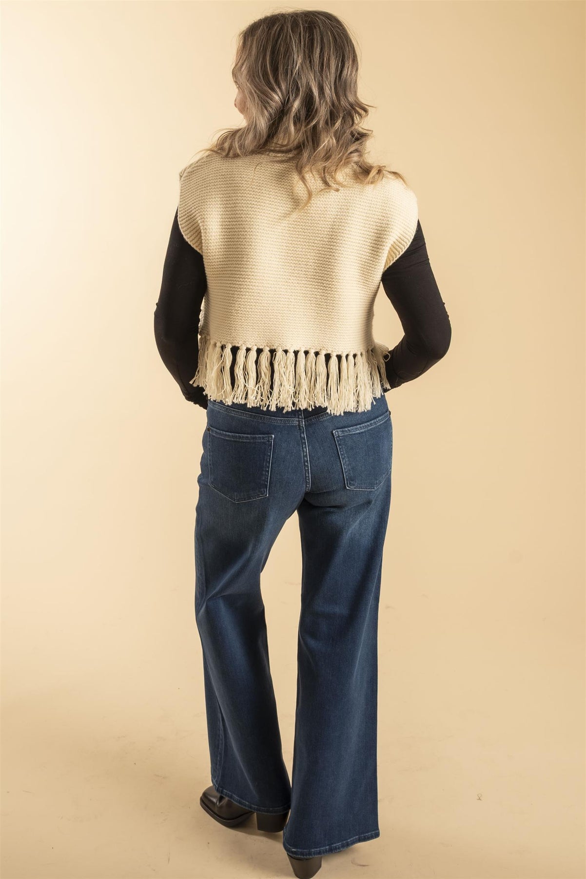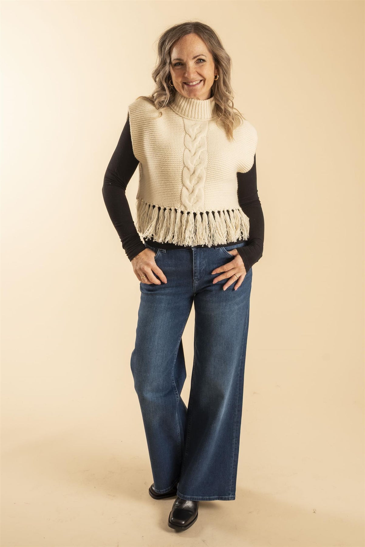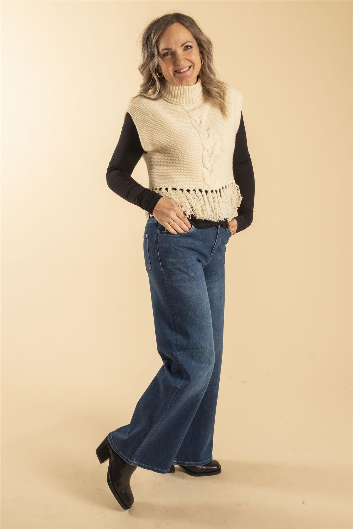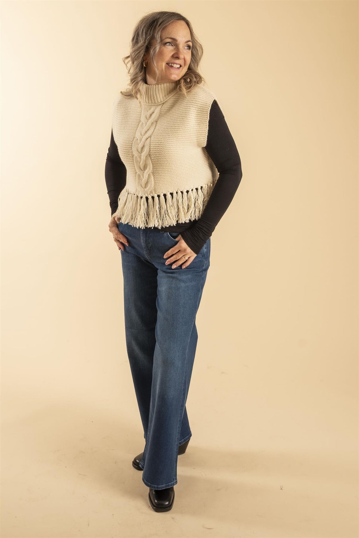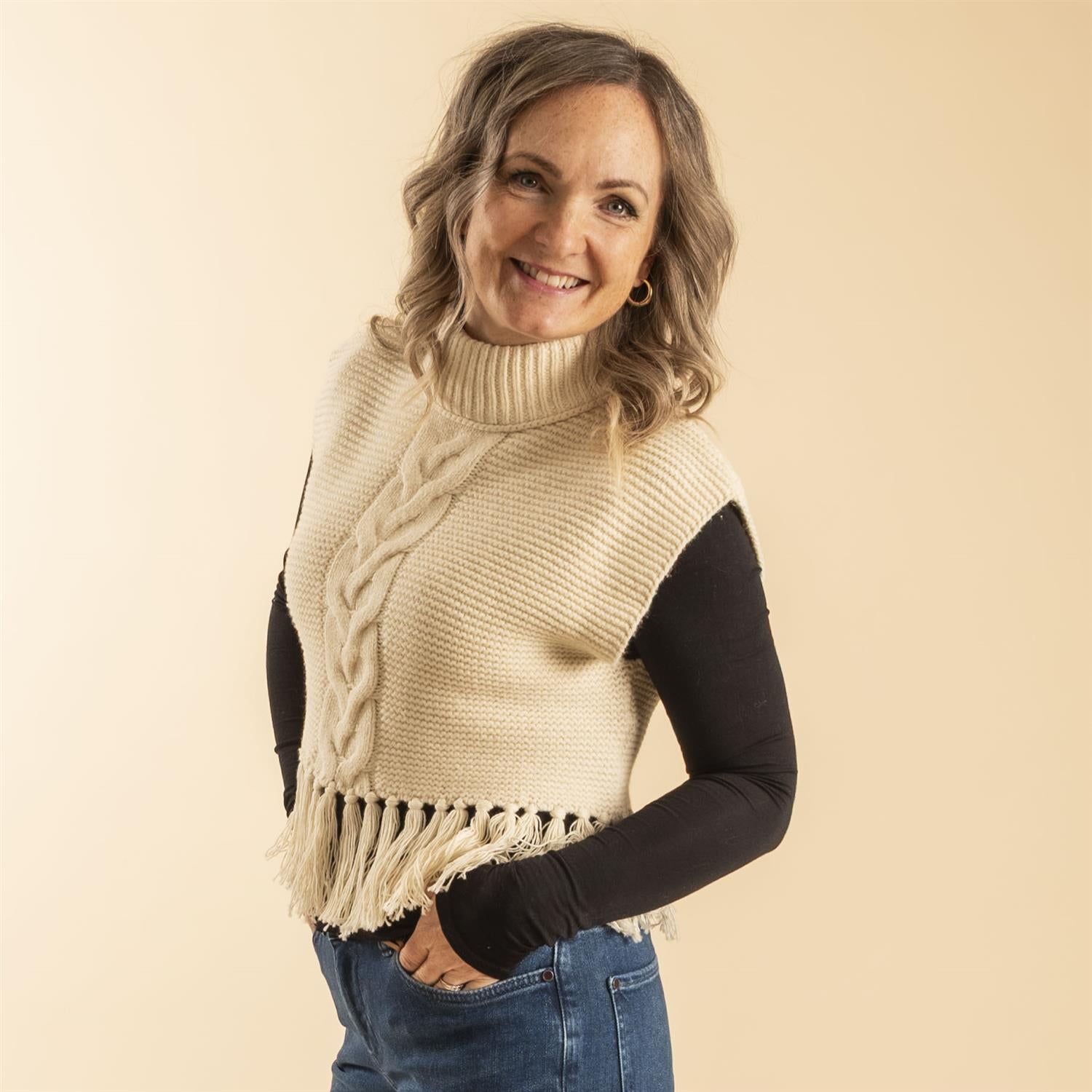 Stilig strikkeplagg designet med et kabelstrikket panel nedover fronten. Den har en falsk halsutringning og en særegen frynsedetalj nederst, noe som gir et lekent, men sofistikert preg. Det ermeløse snittet gjør den perfekt for å bruke lag på lag over skjorter eller kjoler, og tilbyr både tekstur og varme i ett elegant design.