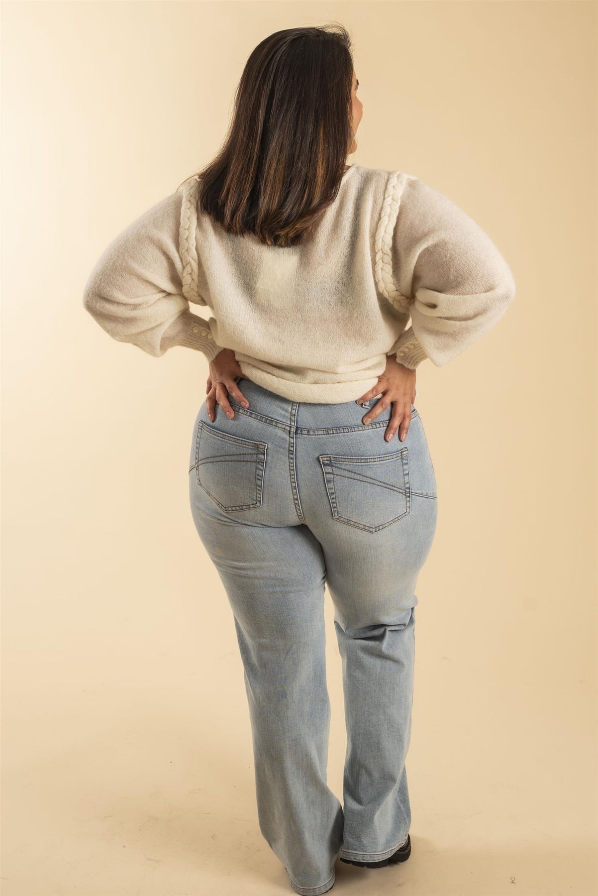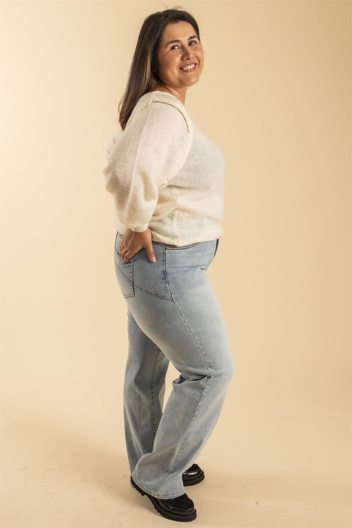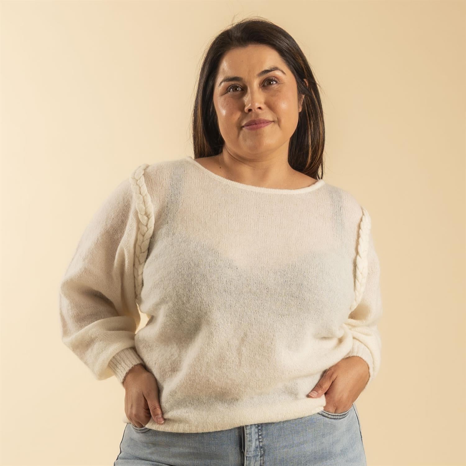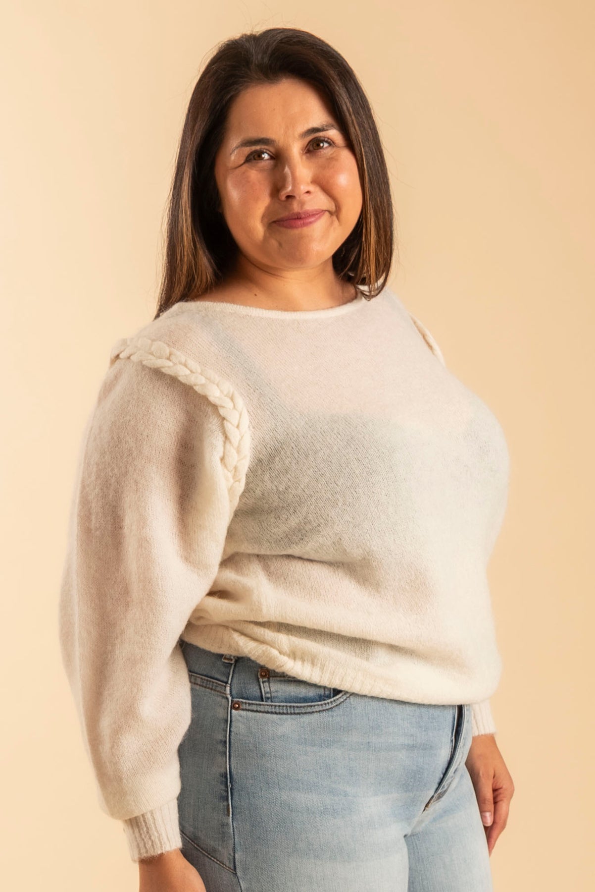 Delikat strikk med fletter på de isatte ermene og med båthals som gir et skarpt uttrykk. Brede mansjetter med delikate knapper ton-i-ton.