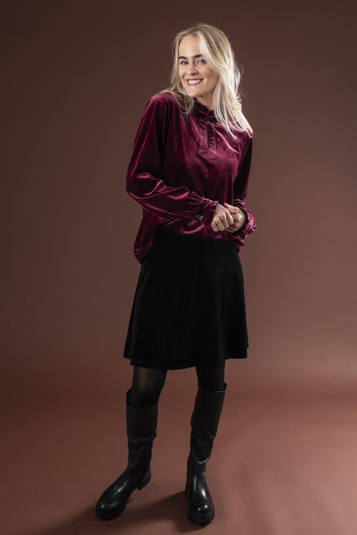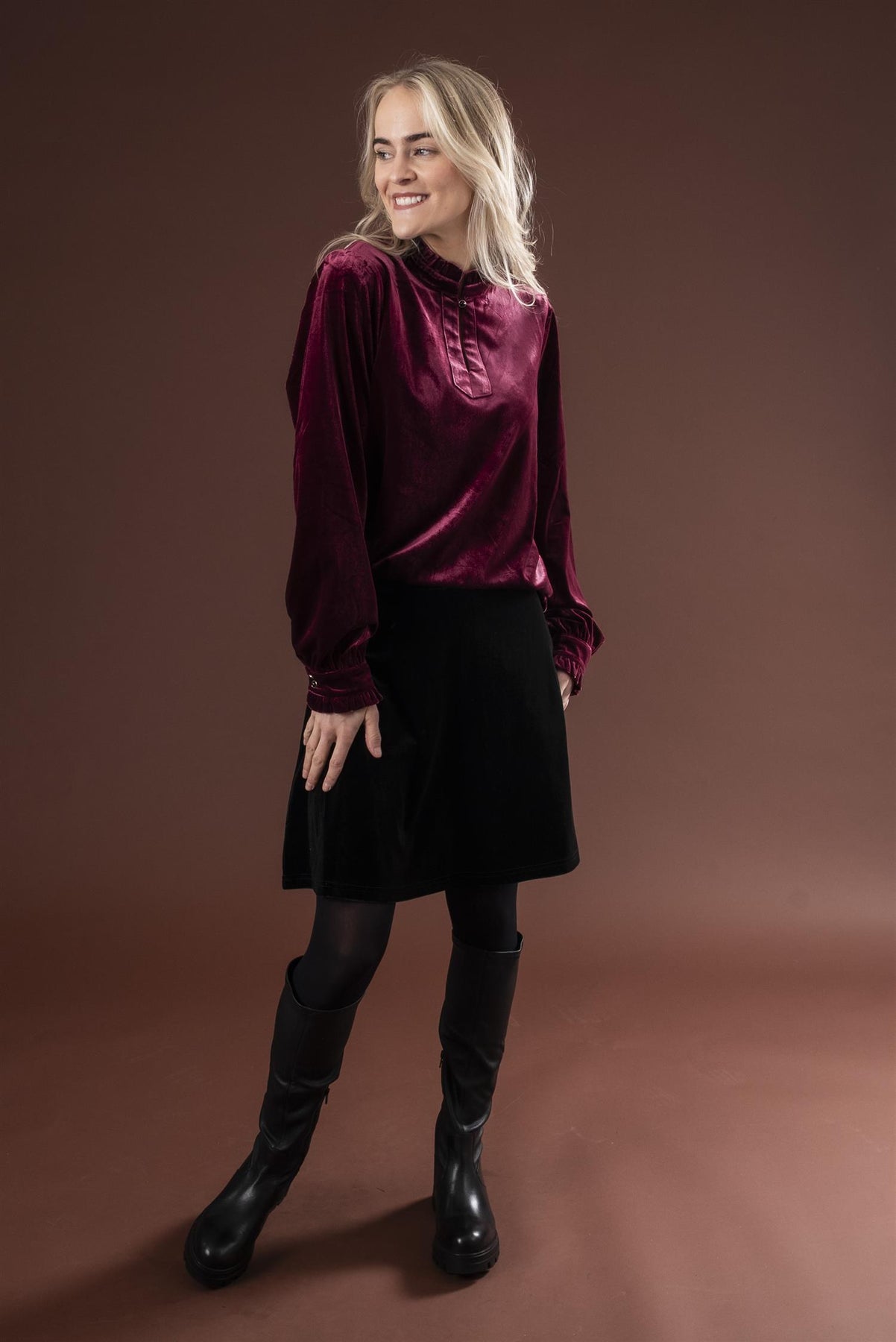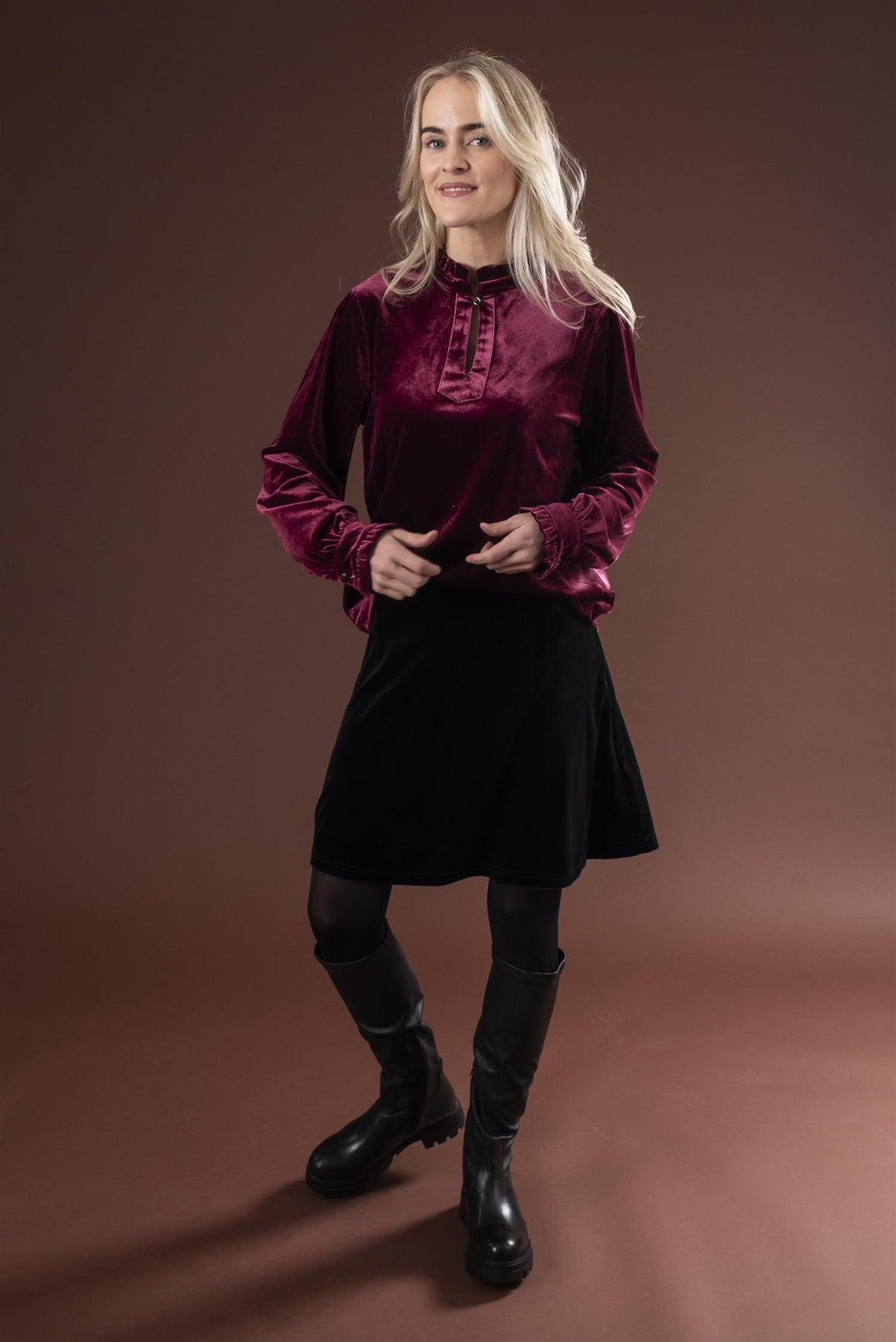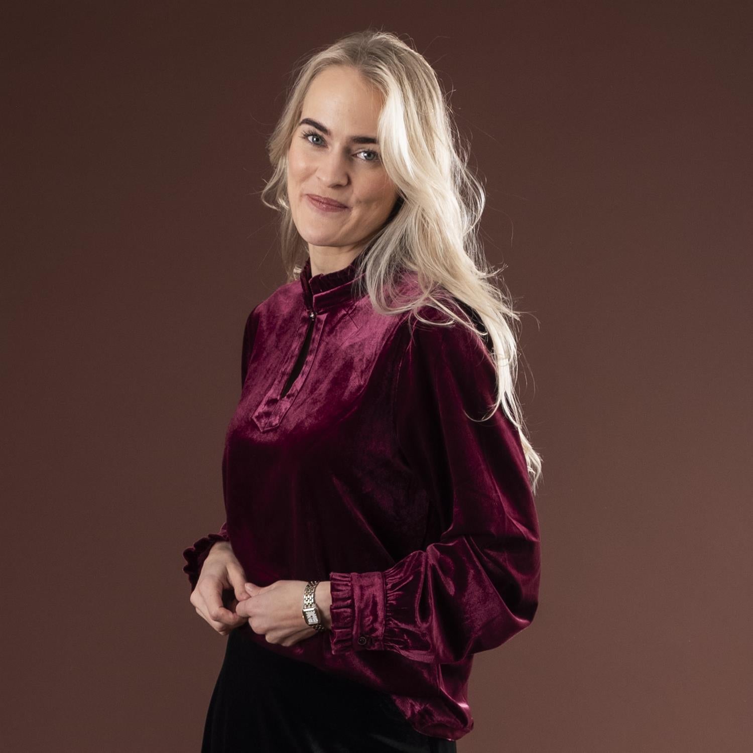 Vakker velourbluse i myk og skimrende kvalitet. Halvpolo med volang, og delikat knapp i utrigningen samt på mansjettene som gir det lille ekstra ekslusive preget.